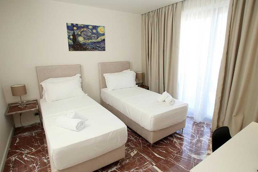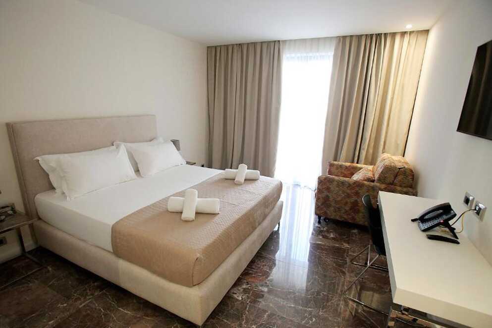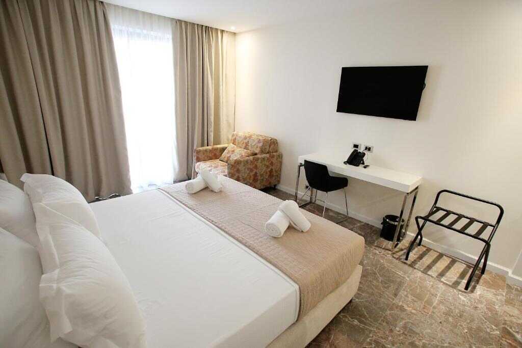 Dubbelrum med balkong. En dubbelsäng eller två enkelsängar. Wifi, luftkonditionering och deponering ingår. Tv. Hårtork. Badrum med bad/dusch och wc. Städning 7 ggr/vecka.