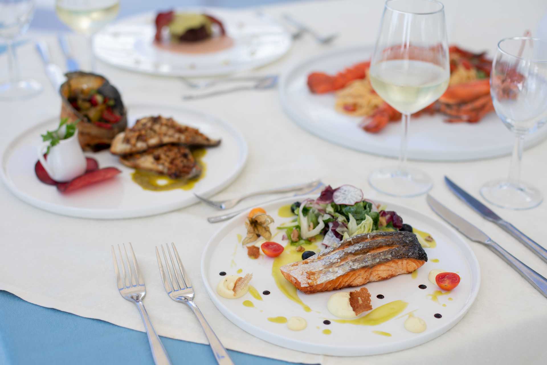 På Grand Blue Fafa Resort & Spa finns två restauranger. I bufférestaurangen kan du äta frukost, lunch och middag. Ett par kvällar i veckan bjuds det på lättare underhållning efter middagen. Hotellet har även en á la carte-restaurang vars specialitet är fisk- och skaldjursrätter och italienska specialiteter. Restaurangen har en vacker utsikt över havet och erbjuder både lokala viner och viner från närliggande länder som Kosovo och Nordmakedonien. I hotellets lobbybar njuter du av goda drinkar, om du inte hellre går ner till baren vid stranden för att njuta av dryck med vacker utsikt.
