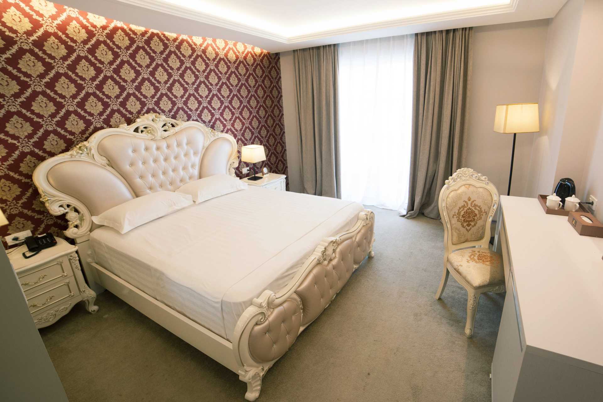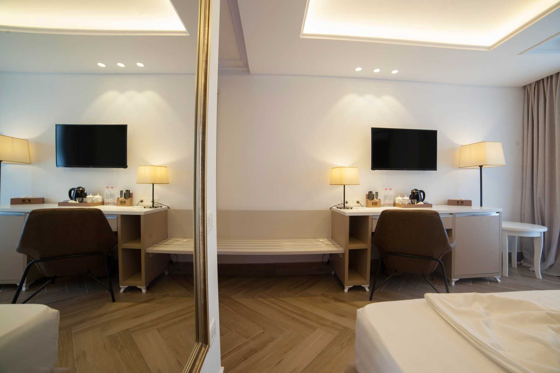 Dubbelrum med balkong, vissa med havsutsikt eller begränsad havsutsikt. En dubbelsäng eller två enkelsängar. Möjlighet till extrabädd i enkelsäng eller i bäddsoffa. Wifi, luftkonditionering och deponering ingår. Kylskåp. Vissa rum har heltäckningsmatta. Hårtork. Badrum med dusch och wc. Städning 7 ggr/vecka.