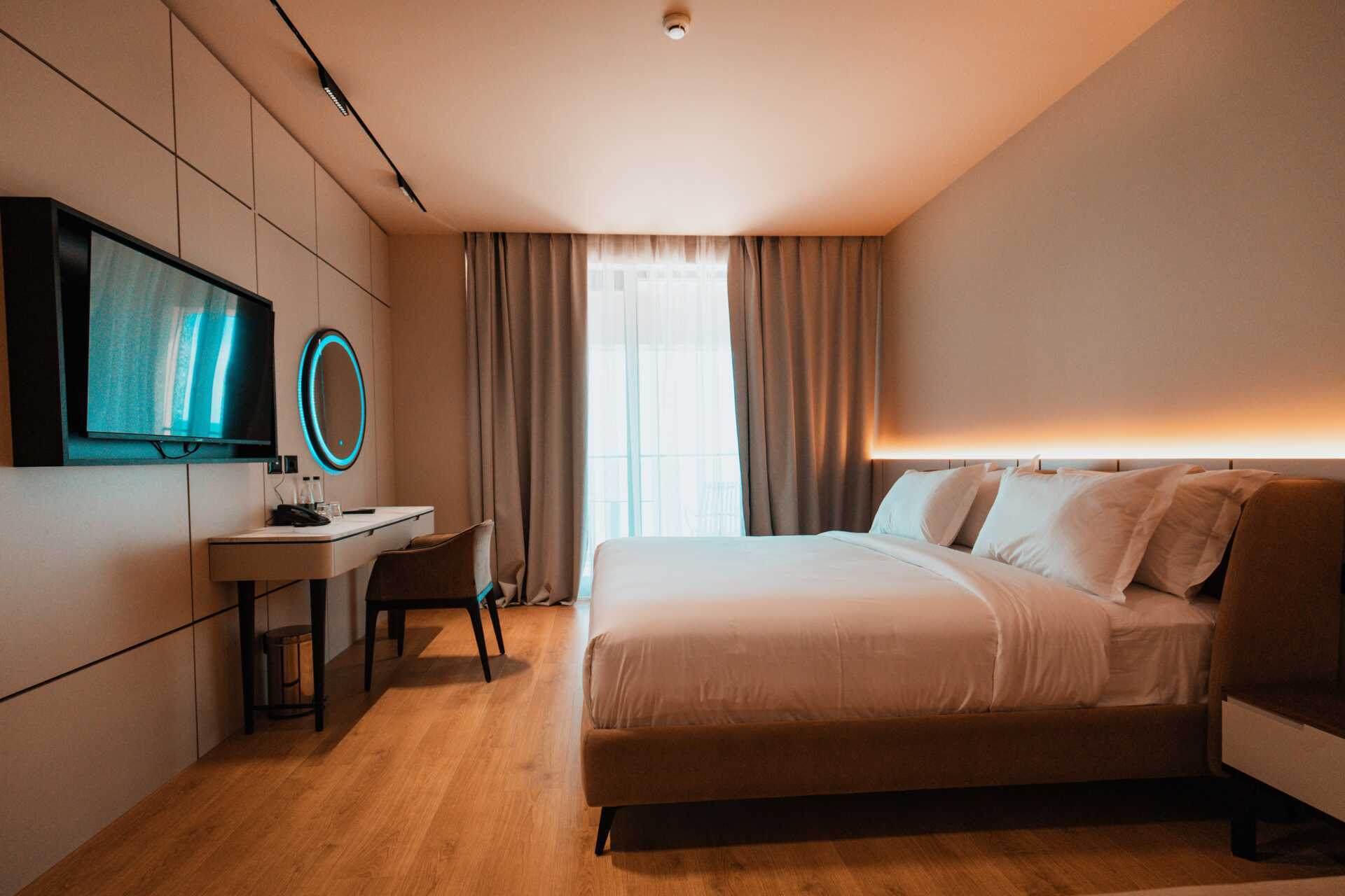 Dubbelrum med balkong, vissa med havsutsikt. En dubbelsäng eller två enkelsängar. Möjlighet till extrabädd i bäddsoffa eller hopfällbar säng. Wifi, luftkonditionering och deponering ingår. Kylskåp. Tv med internationella kanaler. Hårtork. Badrum med dusch och wc. Städning 7 ggr/vecka.