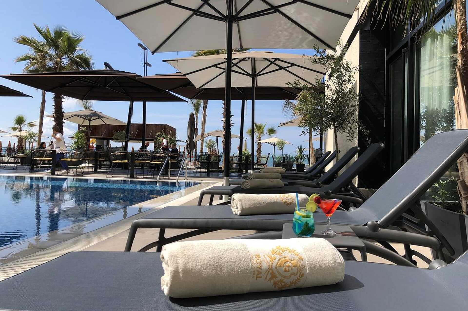 Hotellet Royal G är väldigt fint. Rekommenderas. Rummen är stora och moderna med mycket bra fungerande wifi och AC, bra vattentryck och vattenmängd i dusch och kylande kylskåp. Städat och rent. Jag hade rum med havsutsikt och det var väldigt fint från balkongen. Ett plus är också att balkongdörr/fönster stänger ute ljud bra så man slapp höra det värsta från poolområde och underhållning. Personalen var trevlig och serviceminded. Särskilt uppskattade jag personalen vid frukosten och mannen som skötte solstolarna och området där. Frukosten var fantastisk, mycket att välja bland! Frukt, grönt, varmt, kallt, något för alla. Det mindre bra då.. Den s.k. "stranden"... Den var hemsk. Det är en betongkaj (ful och risig) med trappsteg ner i vattnet. Där solstolarna står är det sand men det är grovt grus blandat med smuts så det är inte fint, skönt eller trevligt alls. Vattnet har sandbotten men det är grumligt, smutsigt och känns väldigt ofräscht. Det flöt omkring avföring och det ligger en stor hamn (tankers och stora färjor) väldigt nära. Så det var riktigt dåligt tyvärr. (Inte direkt hotellet men värt att veta - man kan gå längs den s.k. rivieran men det är innanför solstolsområdena på en gångväg men man ser inte havet utan bara parasoller.)