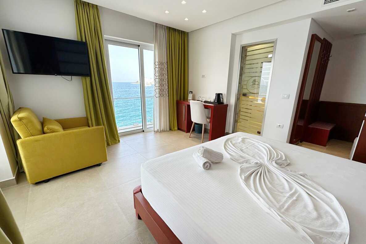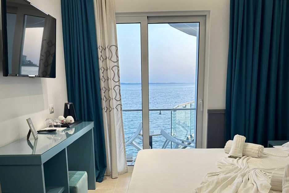 Deluxerum med balkong och havsutsikt. En dubbelsäng. Möjlighet till extrabädd i enkelsäng. Wifi, deponering och luftkonditionering ingår. Kylskåp. Vattenkokare samt kaffe och te. Tv med internationella kanaler. Hårtork. Glasdörr till badrum med badkar eller dusch samt wc. Städning 7 ggr/vecka.