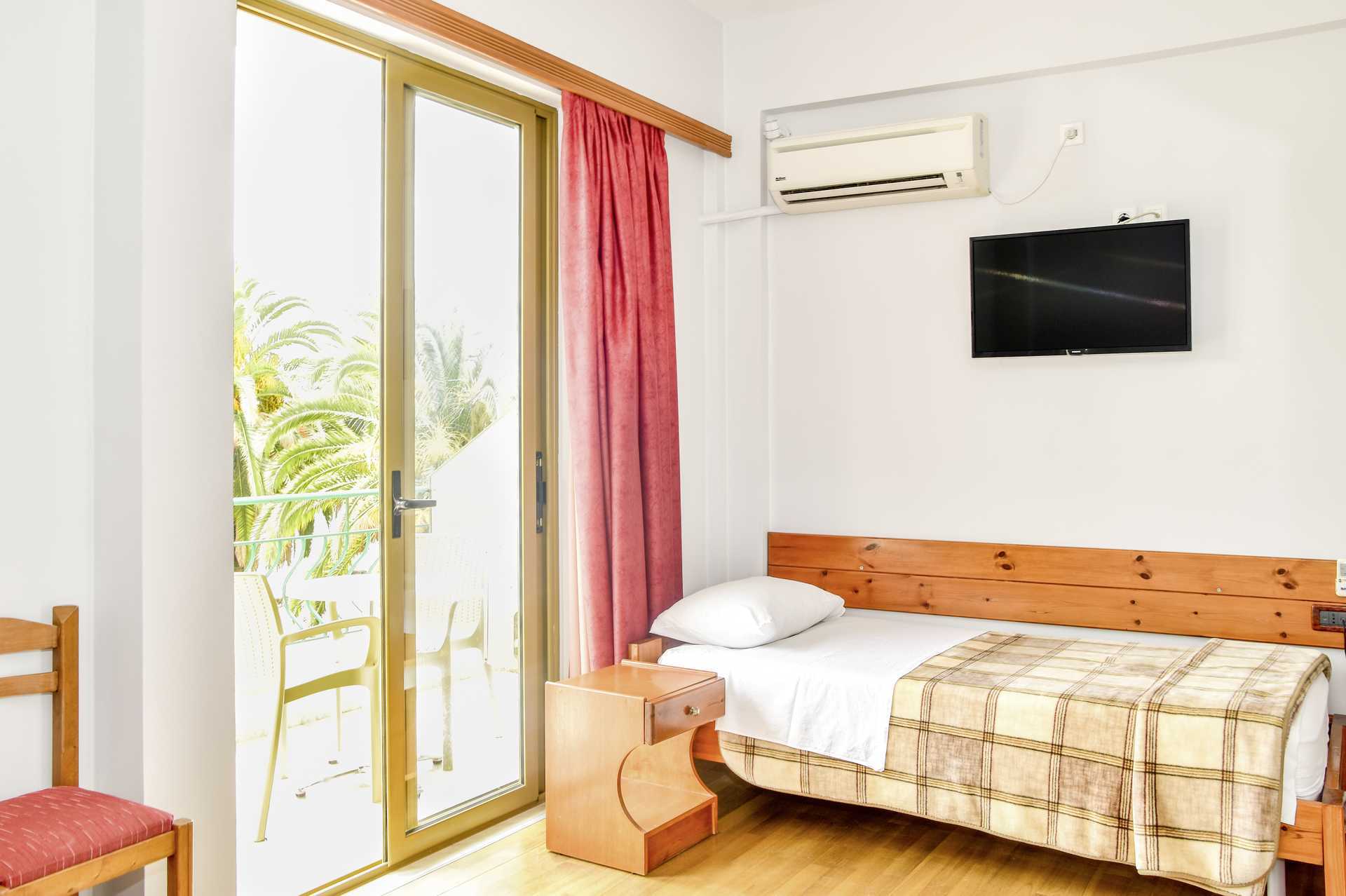 Dubbelrum med balkong, vissa med havsutsikt eller begränsad havsutsikt. En dubbelsäng eller två enkelsängar. Möjlighet till extrabädd i enkelsäng och/eller hopfällbar säng. Wifi, deponering och luftkonditionering ingår. Kylskåp. Tv med internationella kanaler. Hårtork. Badrum med dusch och wc. Städning 7 ggr/vecka.