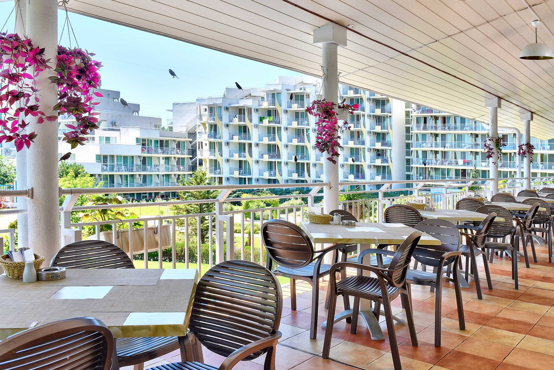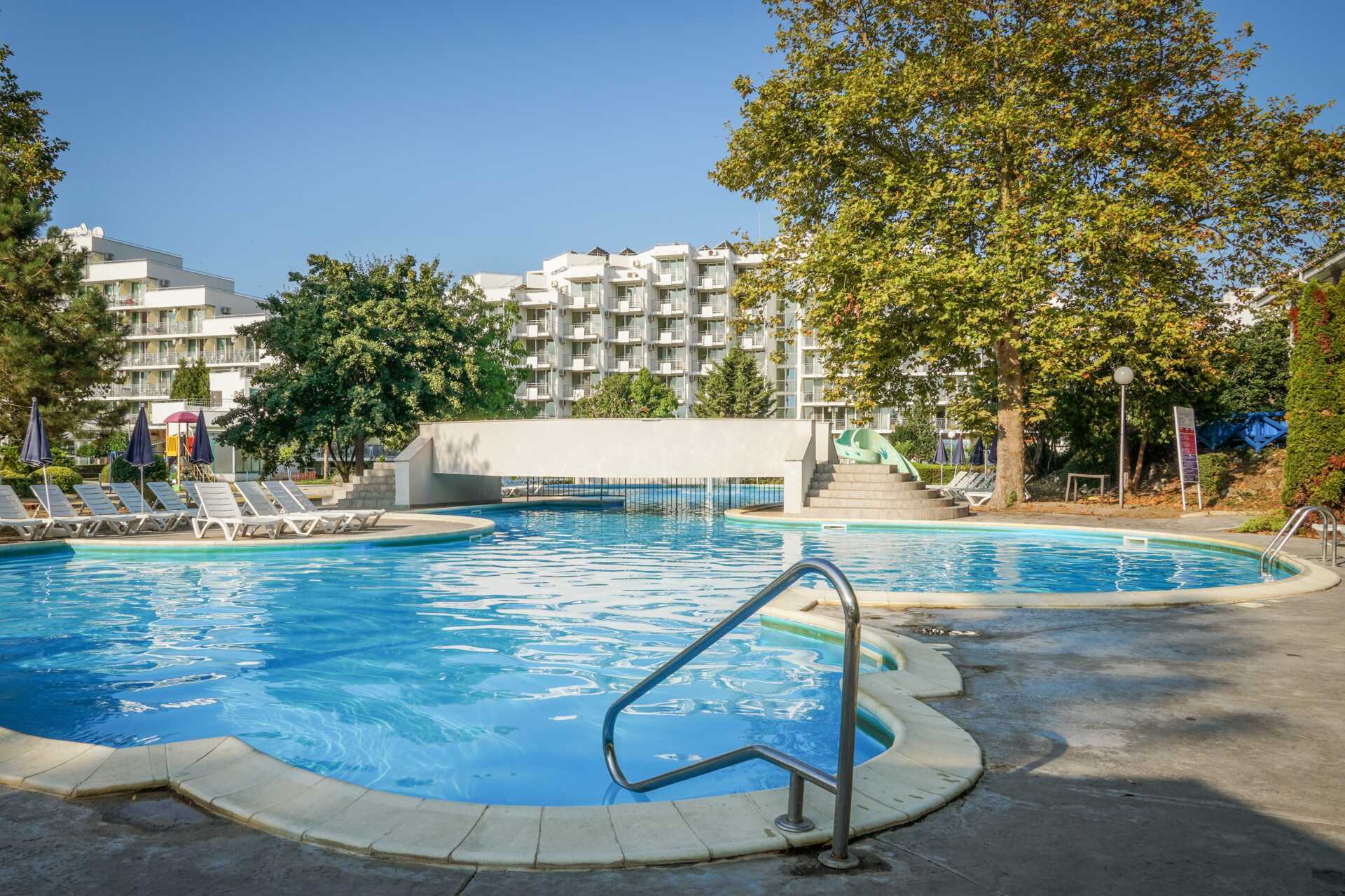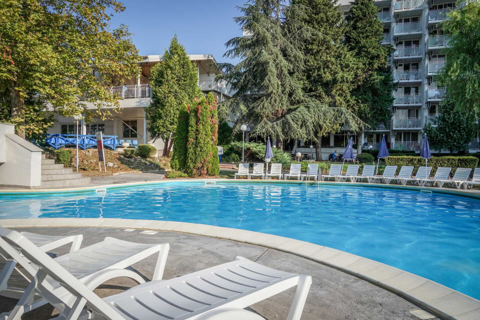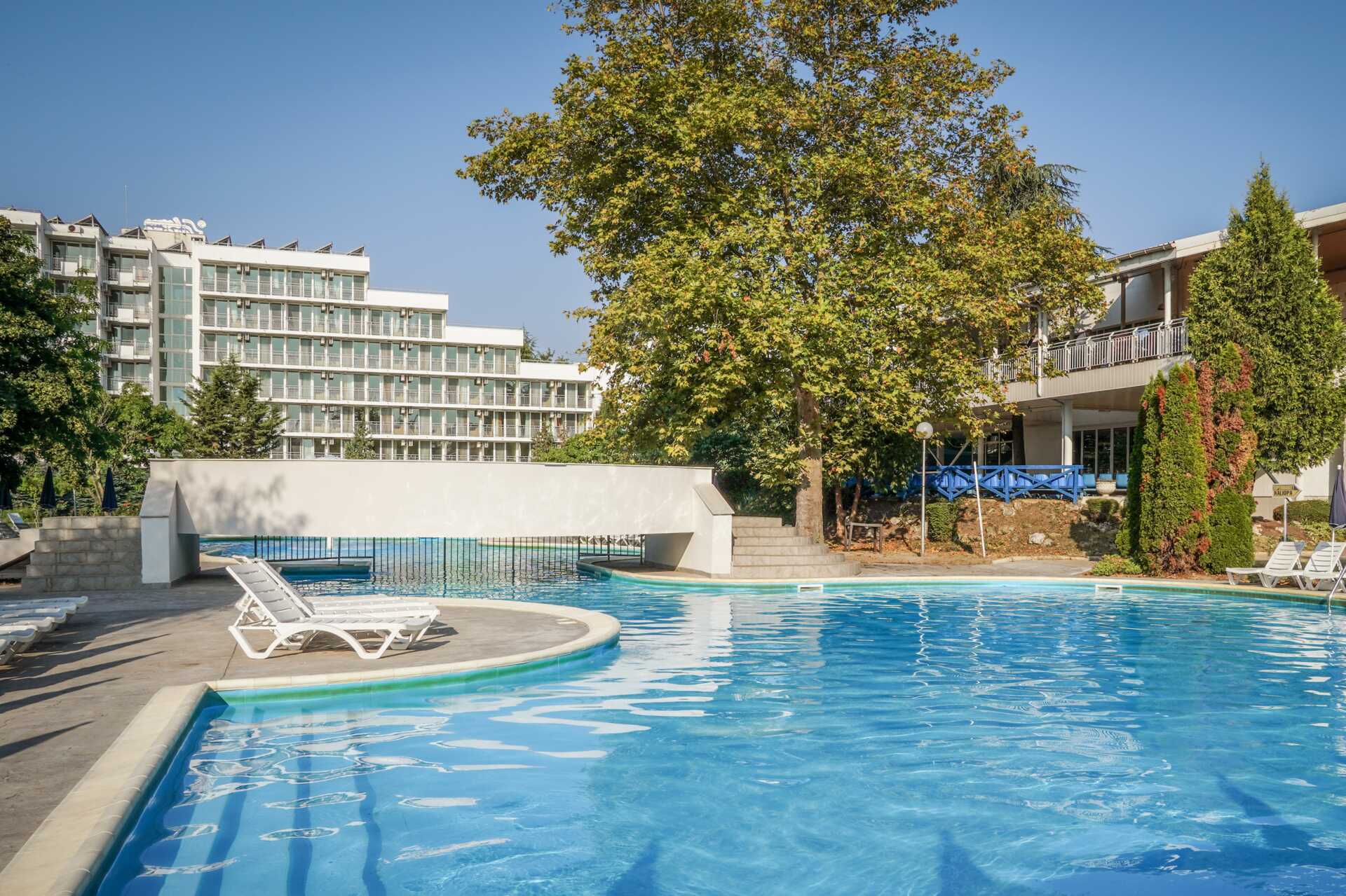 Poolområde med solstolar och parasoller, en pool för svalkande dop och en mysig pool-/snackbar för svala drycker och enklare tilltugg. Separat barnpool med vattenrutschkanor för de yngsta. Pool-/strandhanddukar mot avgift. Granne med hotellet breder den fina Blå Flagg-belönade sandstranden i Albena ut sig och en bit upp på stranden, mot strandpromenaden ingår två solstolar och ett parasoll per rum (om du bokat rum med All Inclusive, solstol närmare vattenbrynet är mot avgift). En bufférestaurang som serverar frukost, lunch och middag. Maten är en härlig blandning av lokala specialiteter och internationella rätter. En pool/snackbar och en trevlig bar i lobbyn finns också.