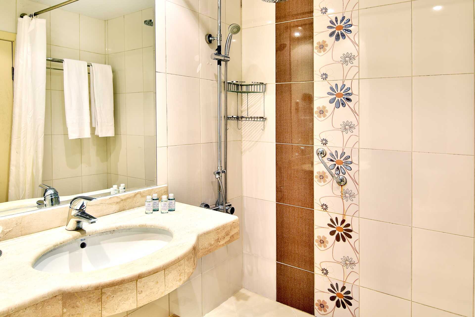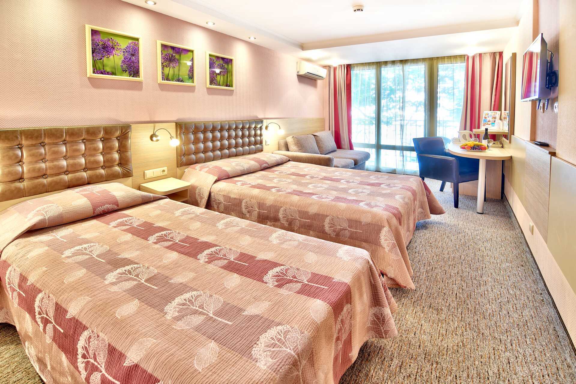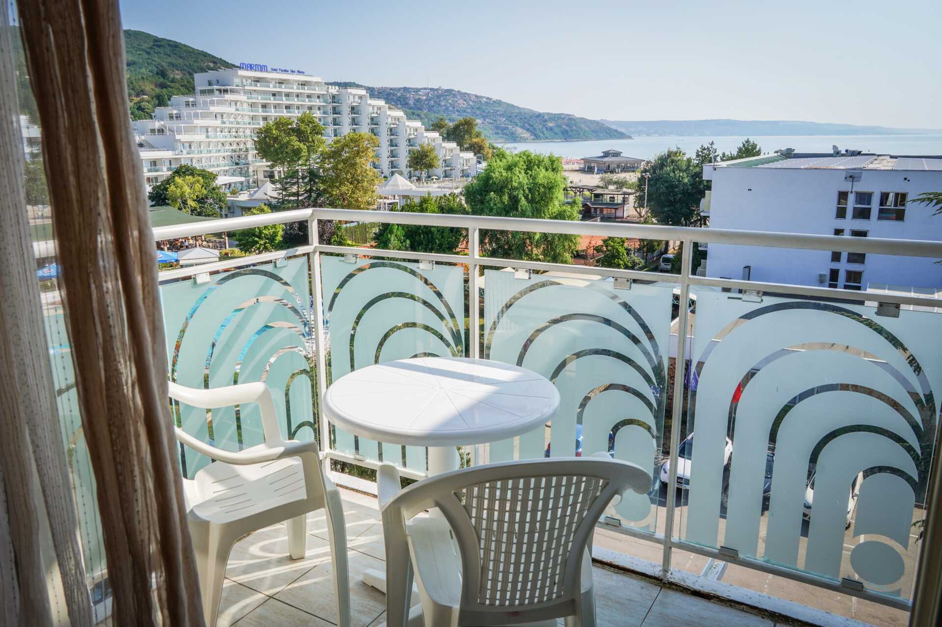Dubbelrum med balkong och begränsad havsutsikt. En dubbelsäng eller två enkelsängar. Möjlighet till extrabädd i enkelsäng eller i bäddsoffa. Wifi, luftkonditionering och deponering ingår. Kylskåp. Vattenkokare. Tv med internationella kanaler. Heltäckningsmatta. Hårtork. Badrum med dusch och wc. Städning 7 ggr/vecka.