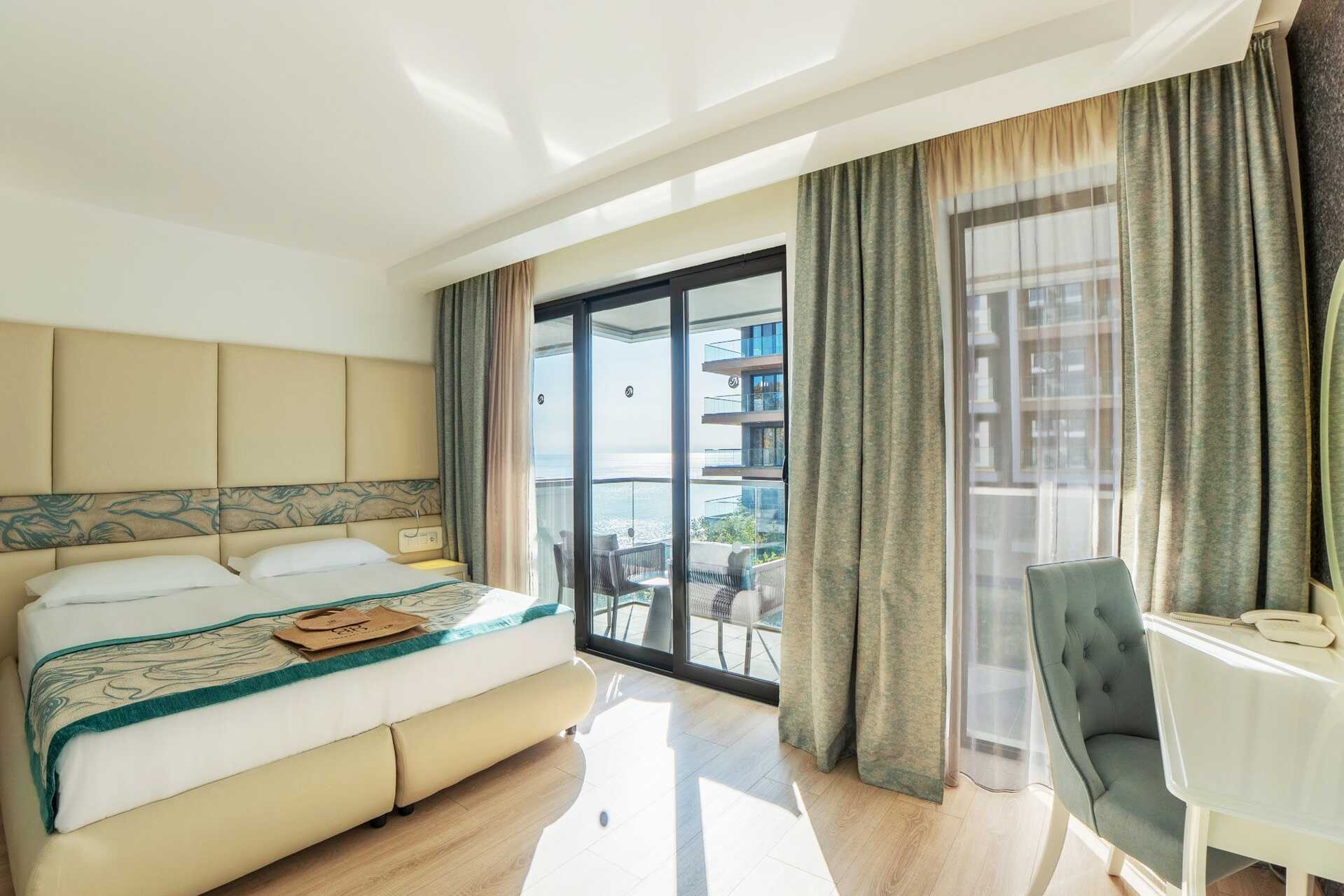 Dubbelrum med balkong och begränsad havsutsikt. En dubbelsäng eller två enkelsängar. Wifi, luftkonditionering och deponering ingår. Minibar, med vatten, läsk öl och snacks, med daglig påfyllning. Kaffemaskin med kapslar och en vattenkokare. Tv med internationella kanaler. Kuddmeny. Hårtork. Badrum med badkar samt wc. Städning 7 ggr/vecka.