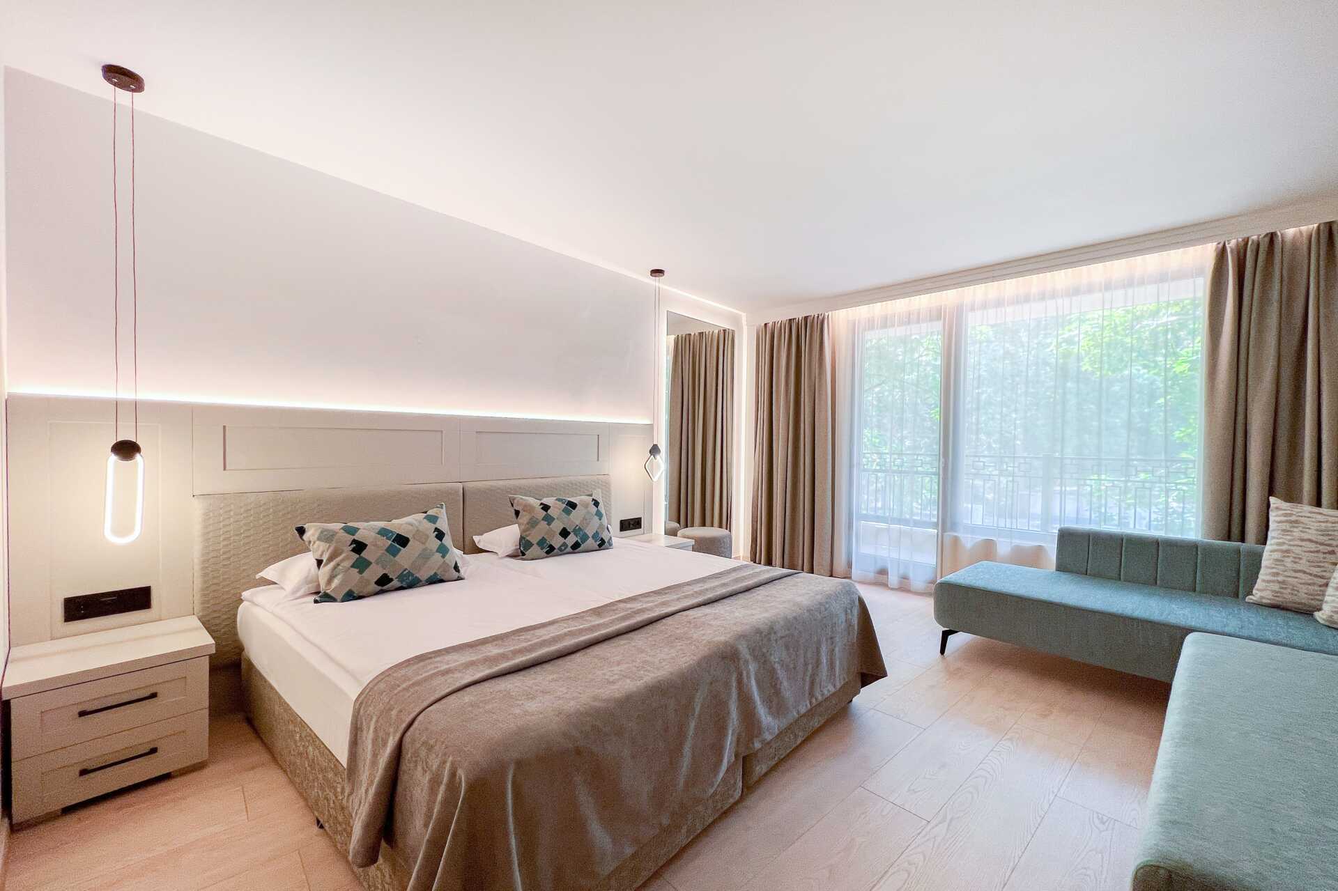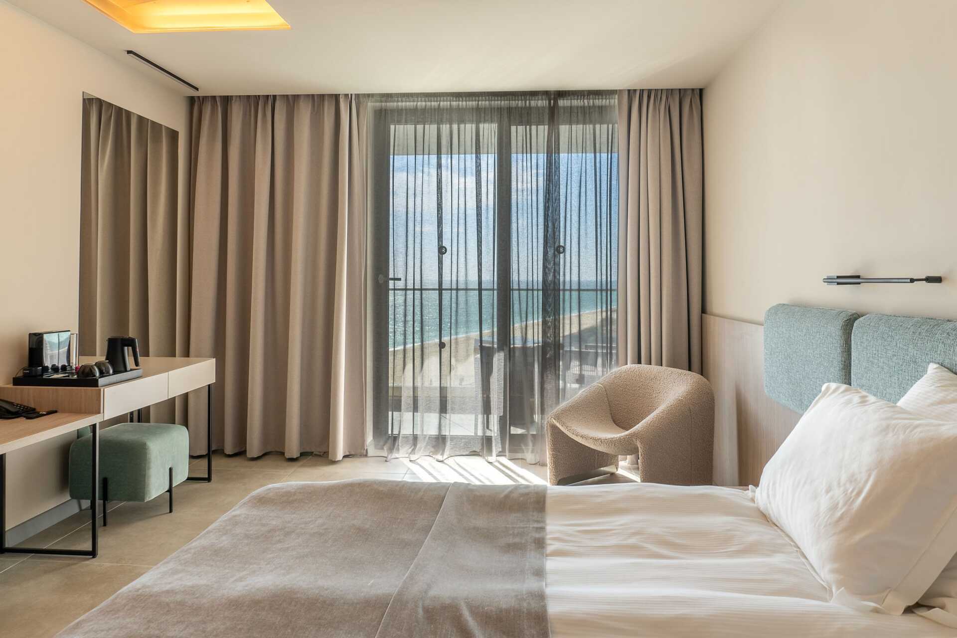 Deluxerum med balkong och direkt havsutsikt. Deluxerummen ligger i den tolv våningar höga huvudbyggnaden. En dubbelsäng eller två enkelsängar. Wifi, luftkonditionering och deponering ingår. Minibar, med vatten, läsk öl och snacks, med daglig påfyllning. Kaffemaskin med kapslar och en vattenkokare. Tv med internationella kanaler. Badrockar och tofflor. Hårtork. Badrum med dusch och wc. Städning 7 grg/vecka.