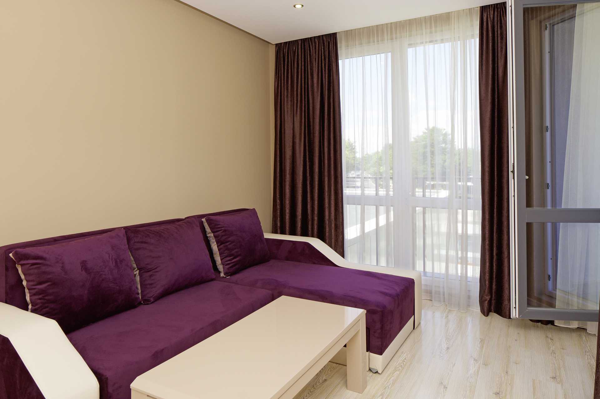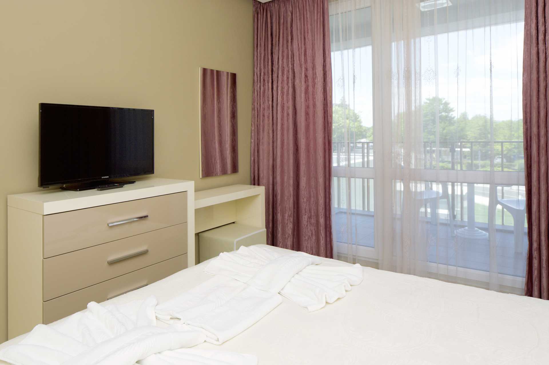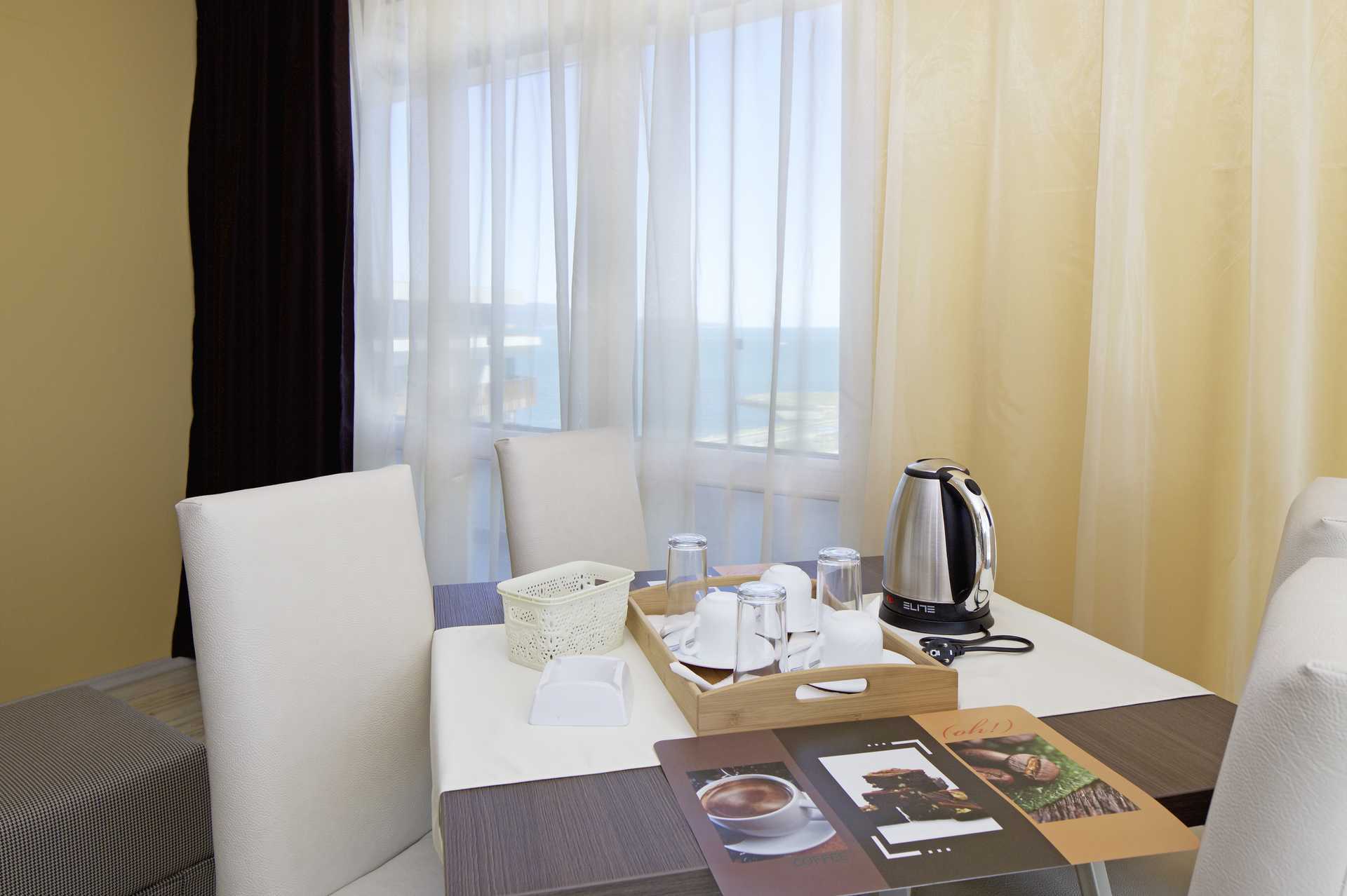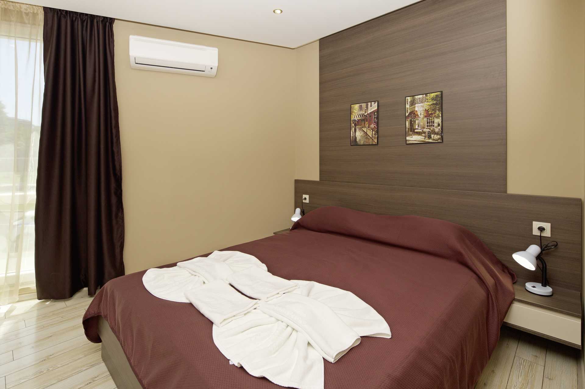 Familjerum med balkong, vissa med begränsad havsutsikt. Sovrum och vardagsrum. En dubbelsäng. Möjliget till extrabäddar i bäddsoffa. Vattenkokare samt kaffe och te. Wifi, luftkonditionering och deponering ingår. Tv med internationella kanaler i båda rummen. Hårtork. Badrum med dusch och wc. Städning 7 ggr/vecka.