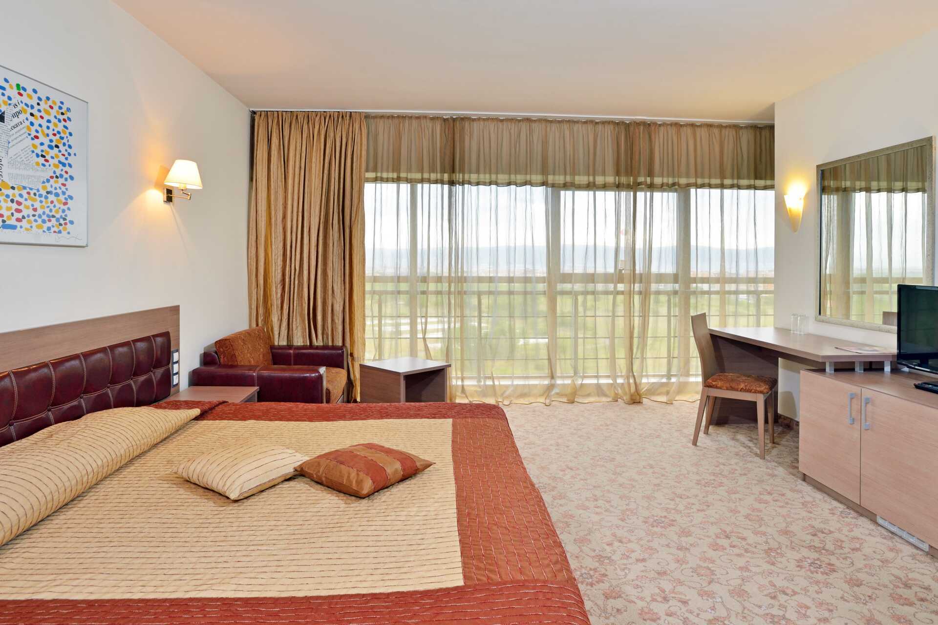 Dubbelrum med balkong, vissa med begränsad havsutsikt. Två enkelsängar. Möjlighet till extrabädd i bäddbar fåtölj. Luftkonditionering och wifi ingår. Deponering mot avgift. Kylskåp. Tv med internationella kanaler. Heltäckningsmatta. Hårtork. Badrum med badkar, vissa även med separat dusch samt wc. Städning 7 ggr/vecka. Barn under två år räknas in i max antal personer i rummet.