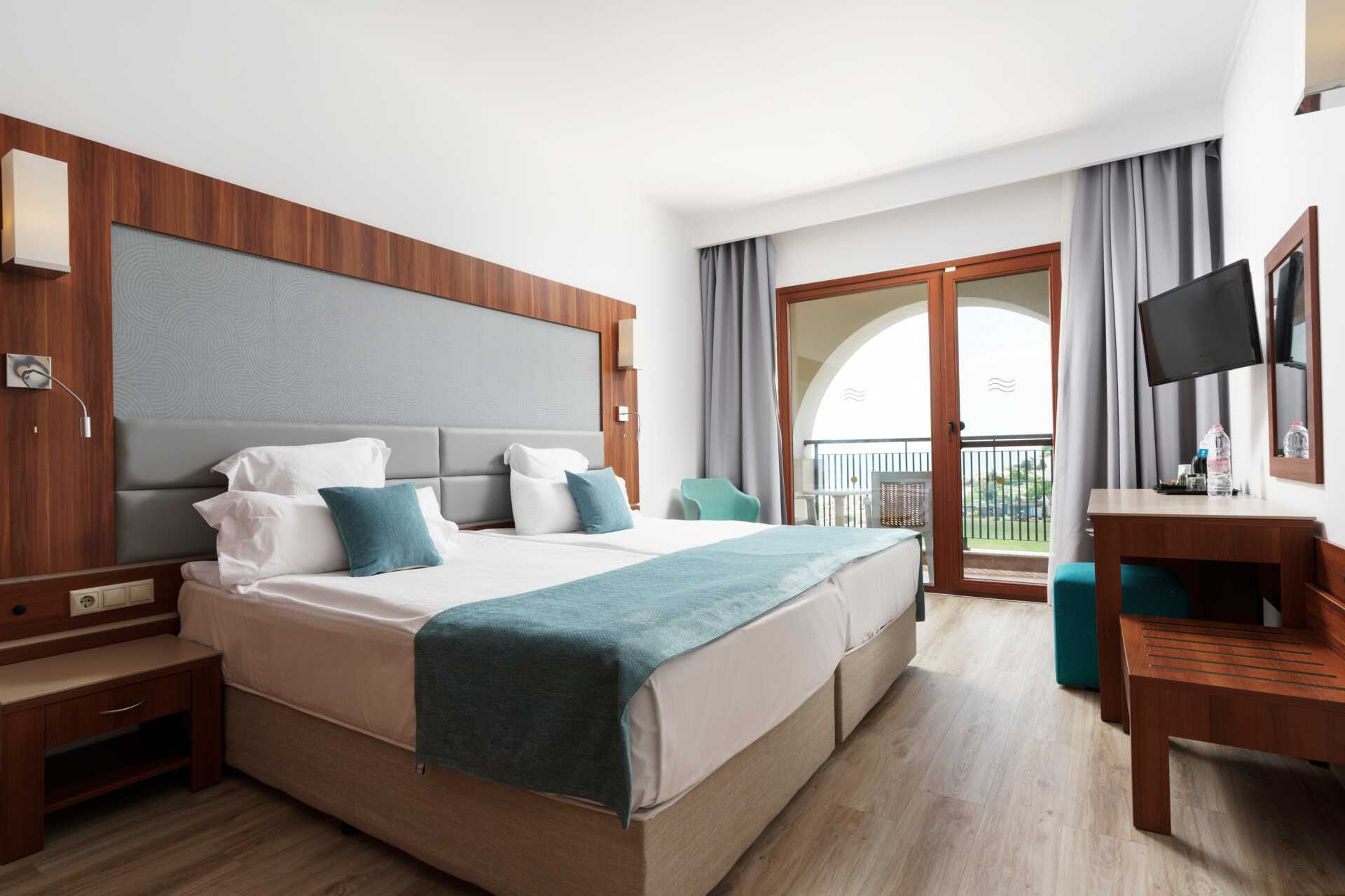 Familjerum med balkong och havsutsikt. En dubbelsäng. Möjlighet till extrabädd i bäddsoffa eller två enkelsängar. Wifi, luftkonditionering och deponering ingår. Kylskåp. Vattenkokare och te. Tv med internationella kanaler. Hårtork. Badrum med dusch samt wc. Städning 7 ggr/vecka.
