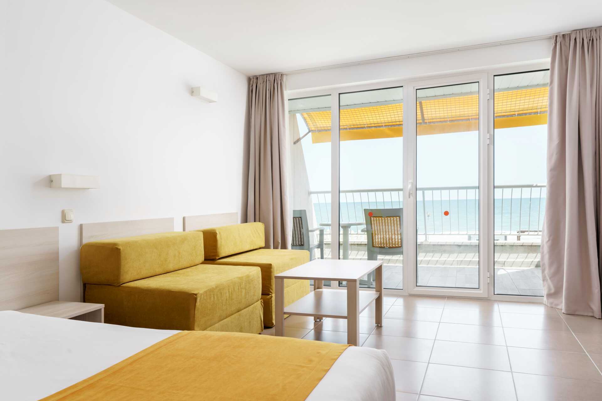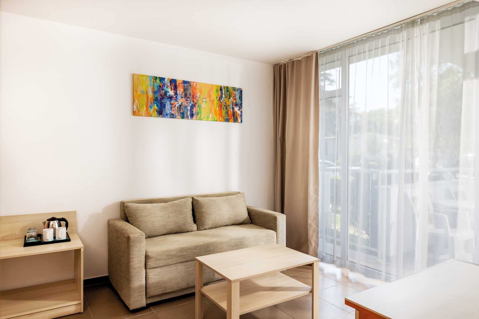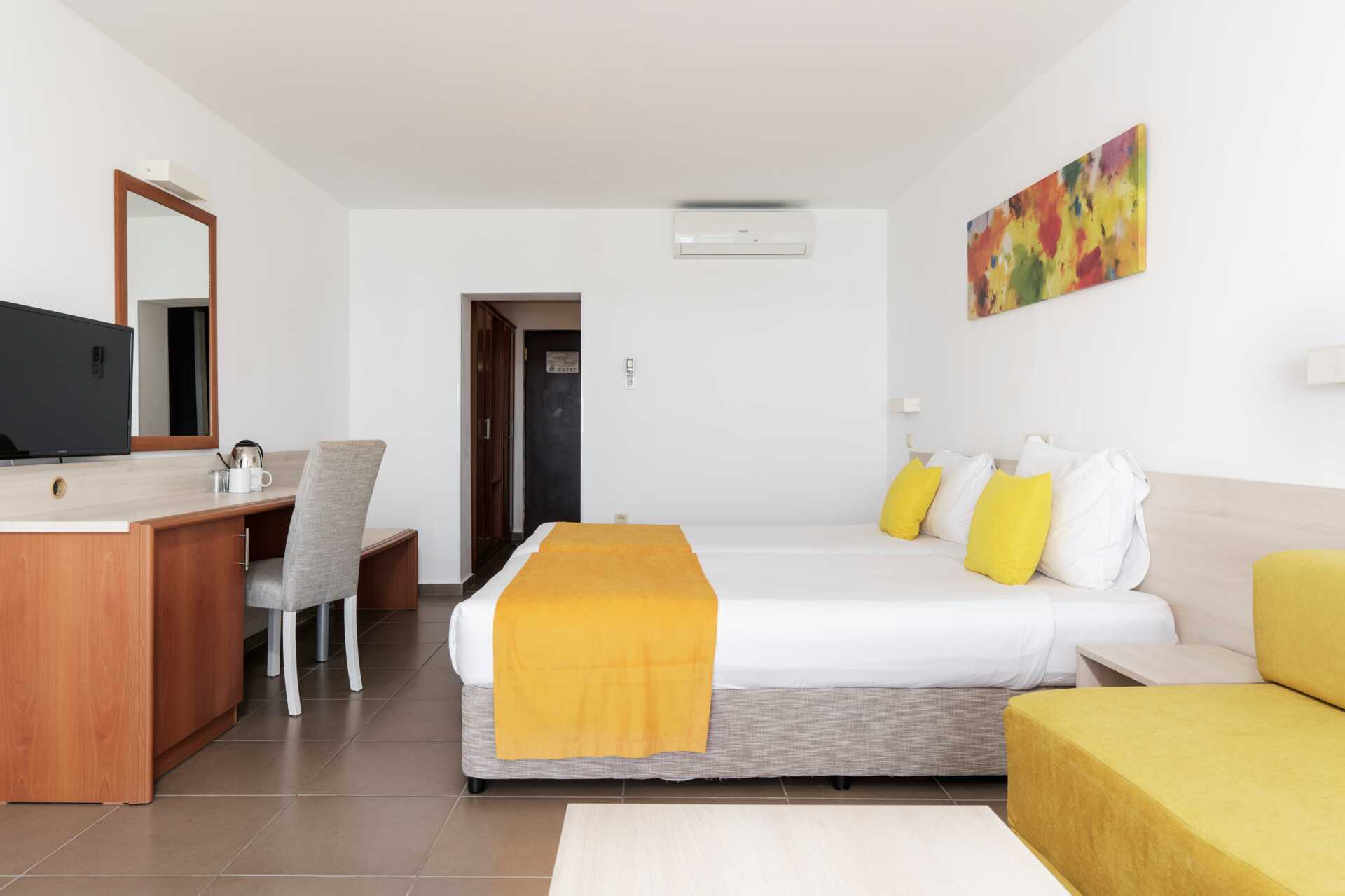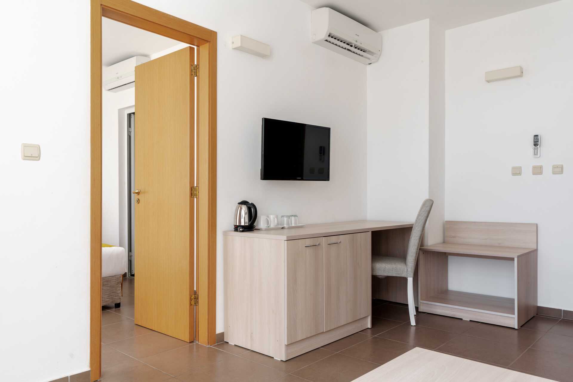 Familjerum med balkong. Rummen består av ett sovrum med en dubbelsäng och ett rum med en bäddbar soffa eller två enkelsängar. Wifi, luftkonditionering och deponering ingår. Litet kylskåp. Vattenkokare. Tv med internationella kanaler. Hårtork. Badrum med dusch samt wc. Städning 7 ggr/vecka.