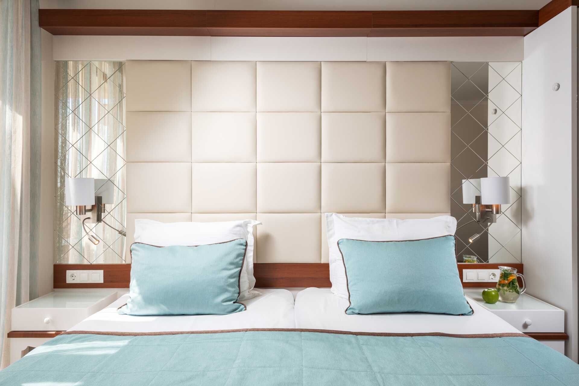 Dubbelrum med balkong och begränsad havsutsikt. Två enkelsängar. Möjlighet till extrabädd i hopvikbar säng. Wifi, luftkonditionering och deponering ingår. Minibar. Tv med internationella kanaler. Hårtork. Badrum med dusch och wc. Städning 6 ggr/vecka.