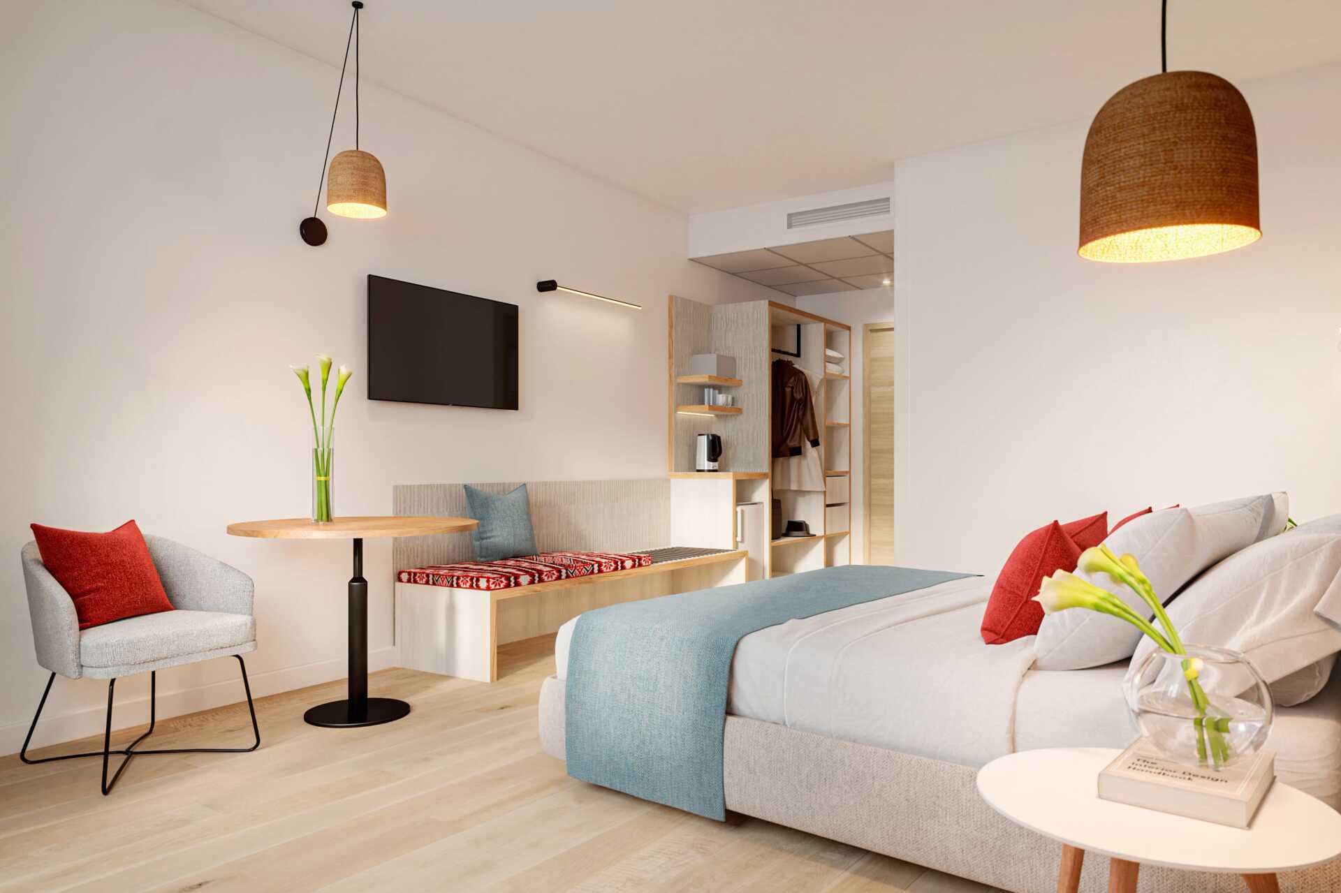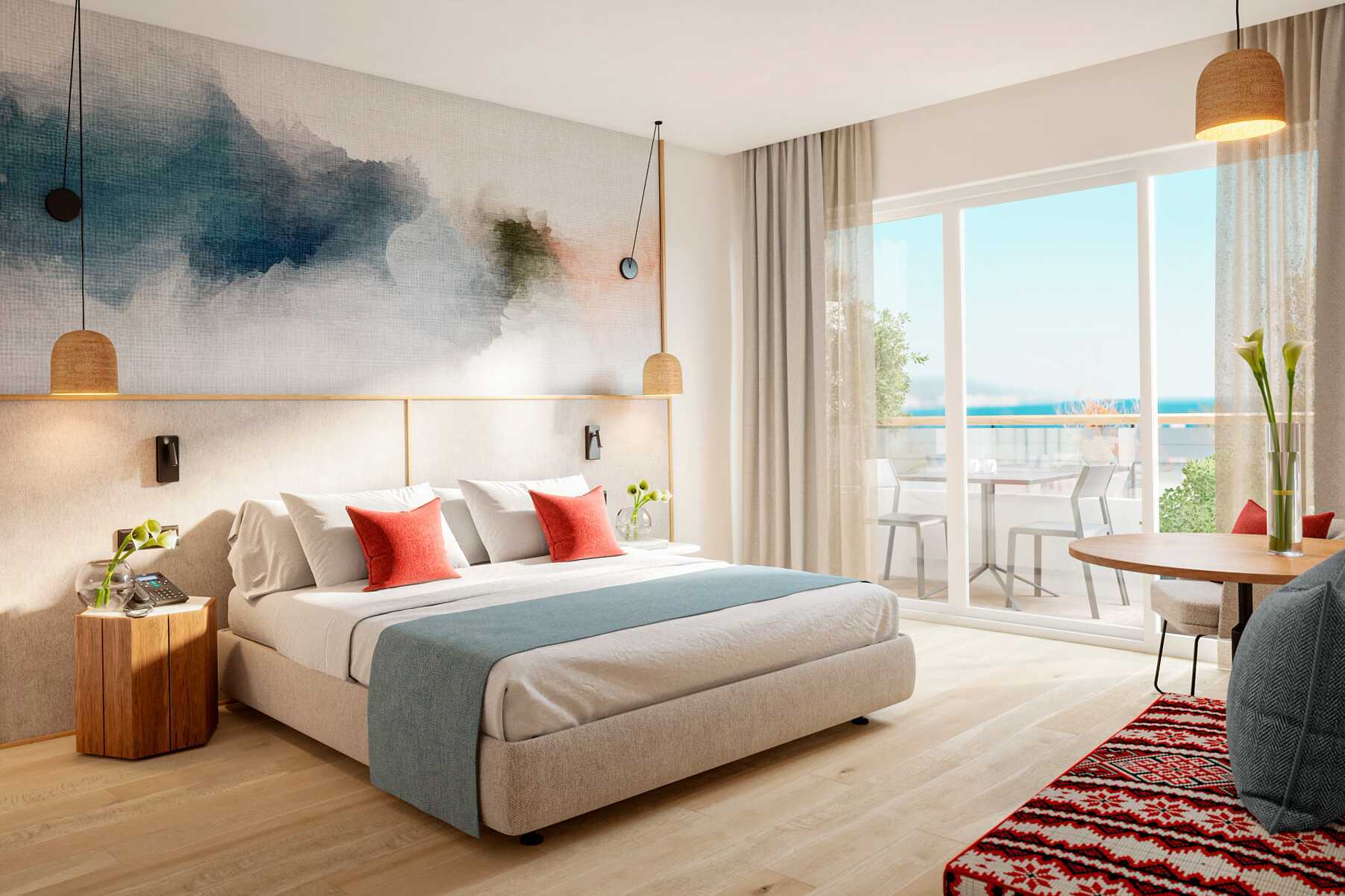Superiorrum med balkong, vissa med havsutsikt och vissa med poolutsikt. En dubbelsäng eller två enkelsängar. Wifi, luftkonditionering och deponering ingår. Kylskåp. Vattenkokare. Tv med internationella kanaler. Hårtork. Badrum med dusch och wc. Städning 7 ggr/vecka.