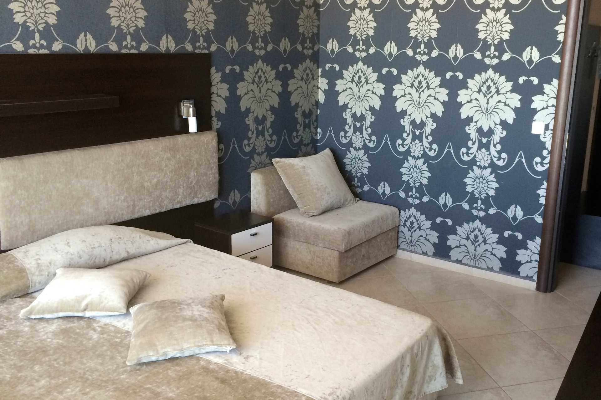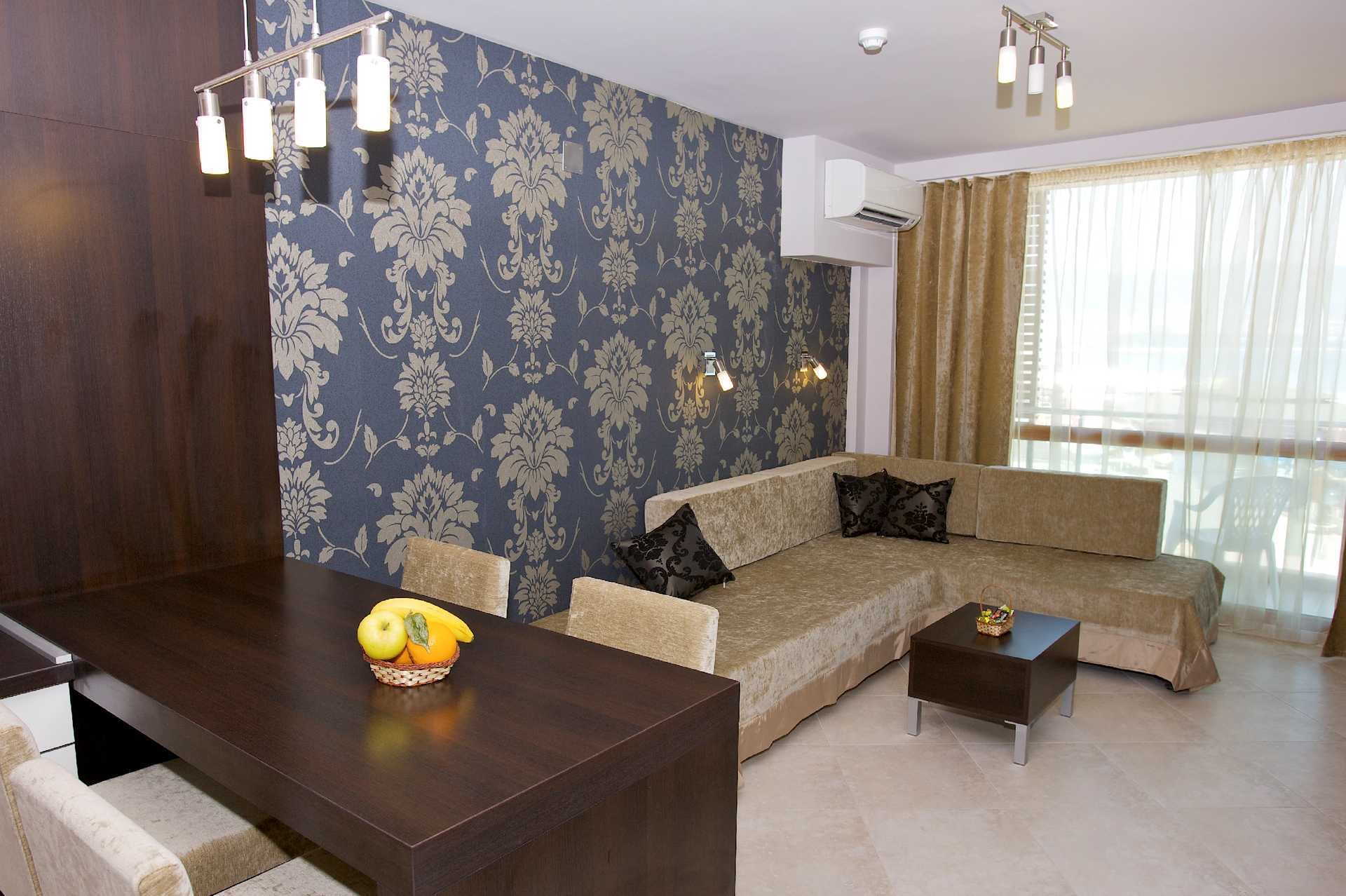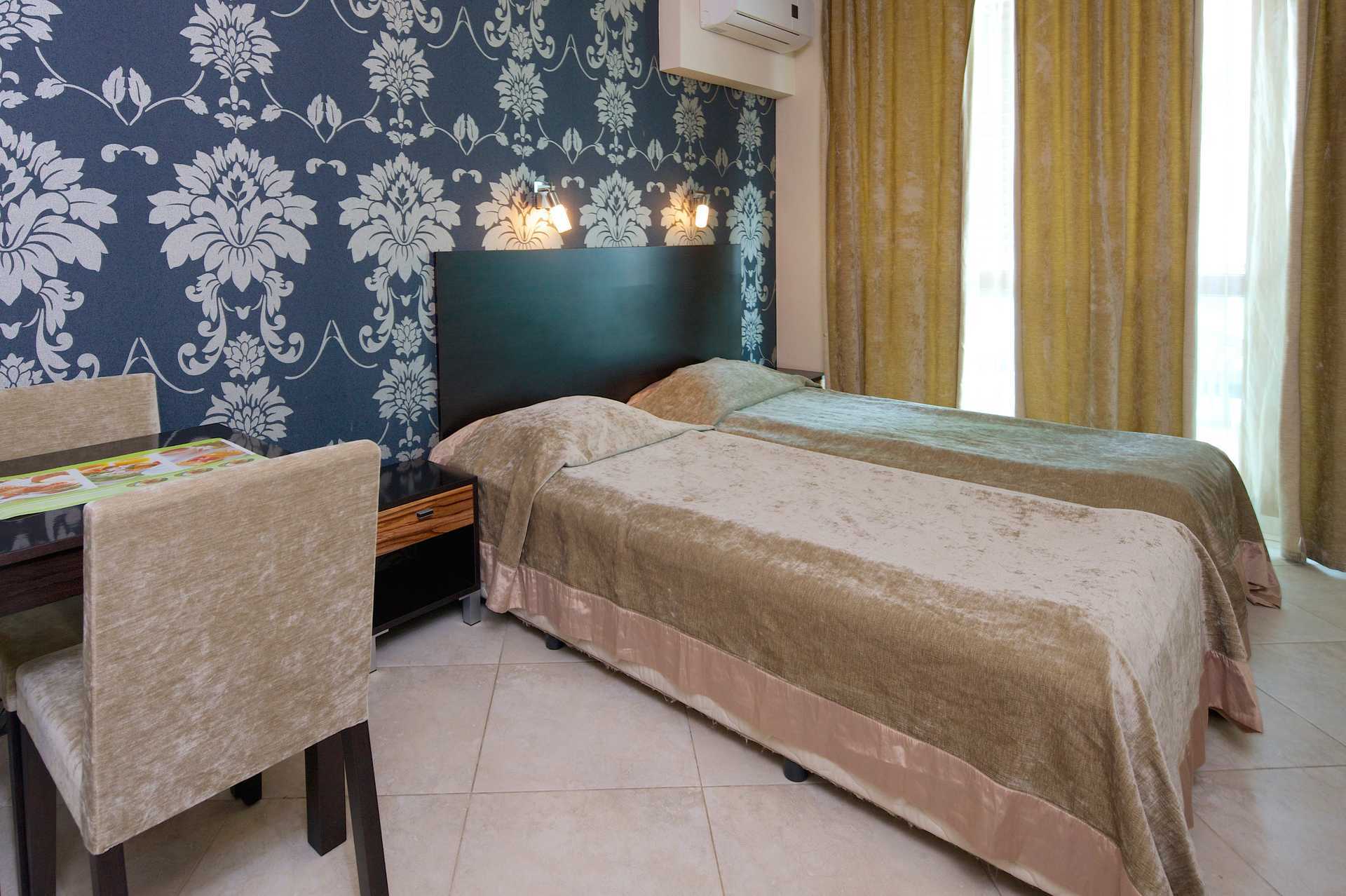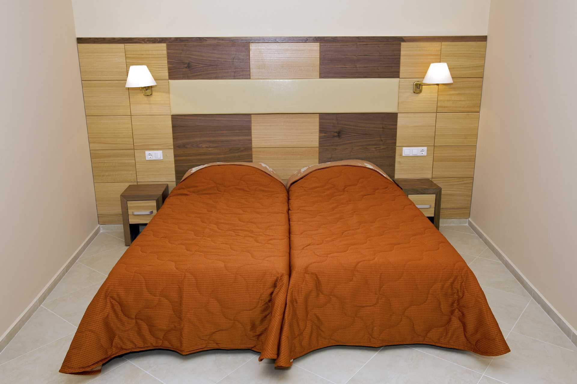 Tvårumslägenhet med balkong, vissa med begränsad havsutsikt. Sovrum och kombinerat vardagsrum med minikök. En dubbelsäng eller två enkelsängar. Möjlighet till extrabäddar i två bäddsoffor. Minikök med kokplattor, kylskåp, mikrovågsugn, vattenkokare, brödrost och enkel köksutrustning. Wifi, luftkonditionering och deponering ingår. Tv med internationella kanaler. Hårtork. Badrum med dusch och wc. Städning 7 ggr/vecka.