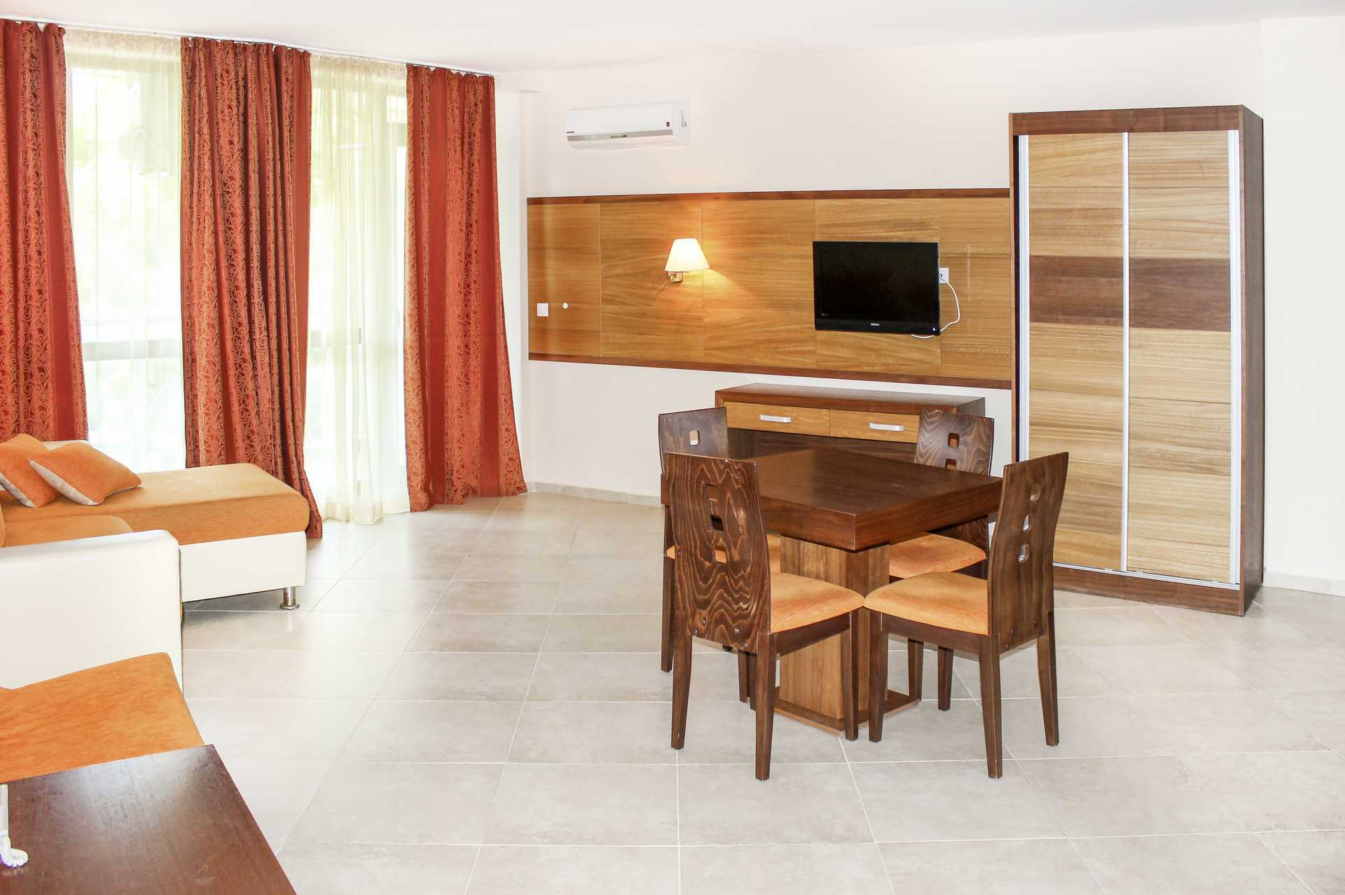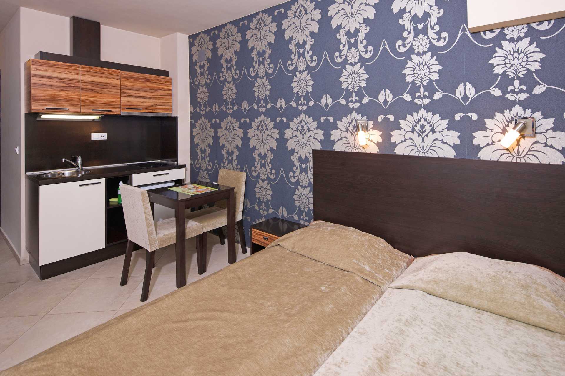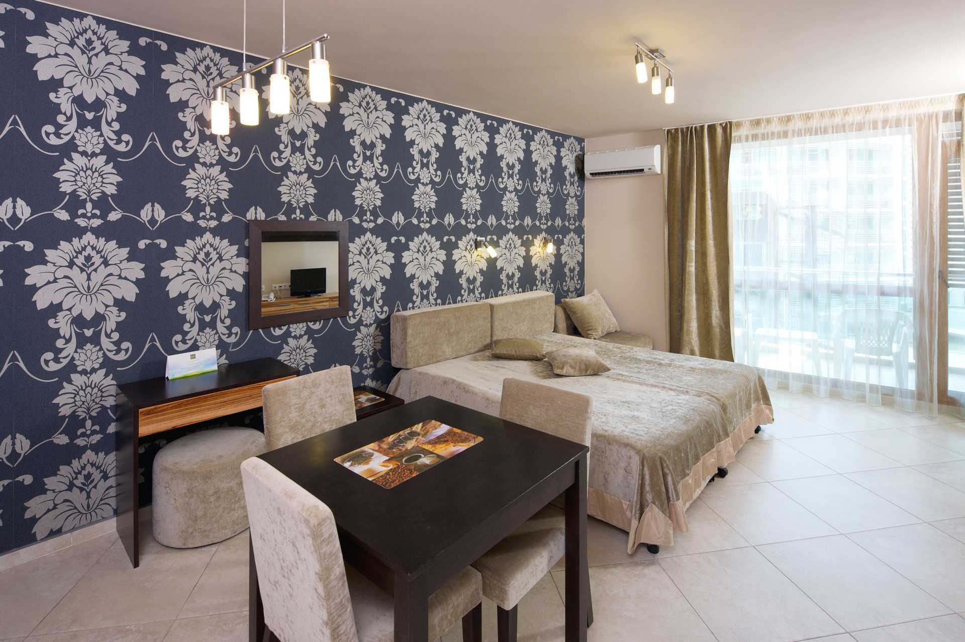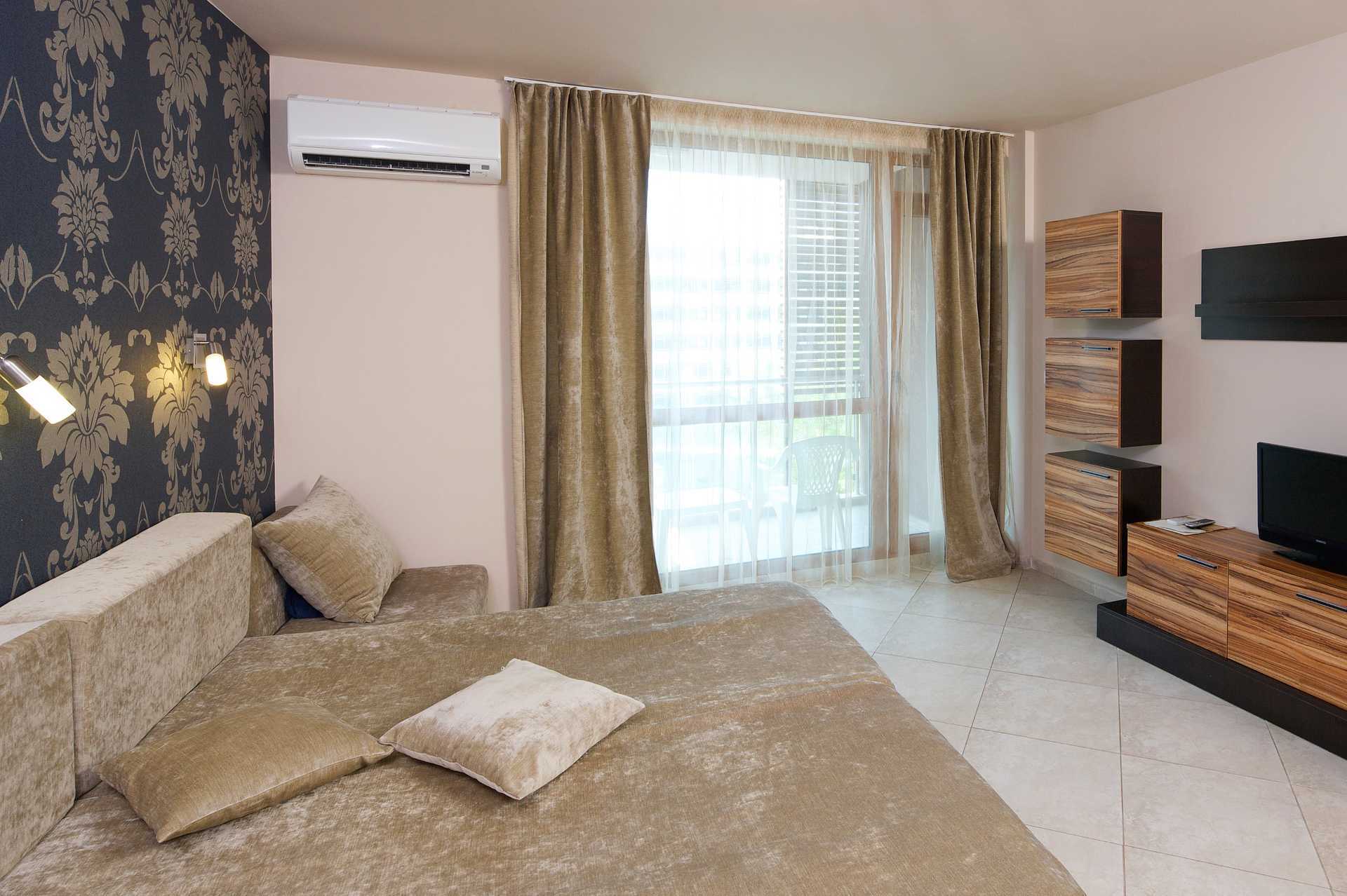 Större enrumslägenhet med balkong. Kombinerat sovrum med minikök. En dubbelsäng eller två enkelsängar. Möjlighet till extrabädd i bäddsoffa. Minikök med kokplattor, kylskåp, vattenkokare, brödrost och enkel köksutrustning. Wifi, luftkonditionering och deponering ingår. Tv med internationella kanaler. Hårtork. Badrum med dusch och wc. Städning 7 ggr/vecka.
