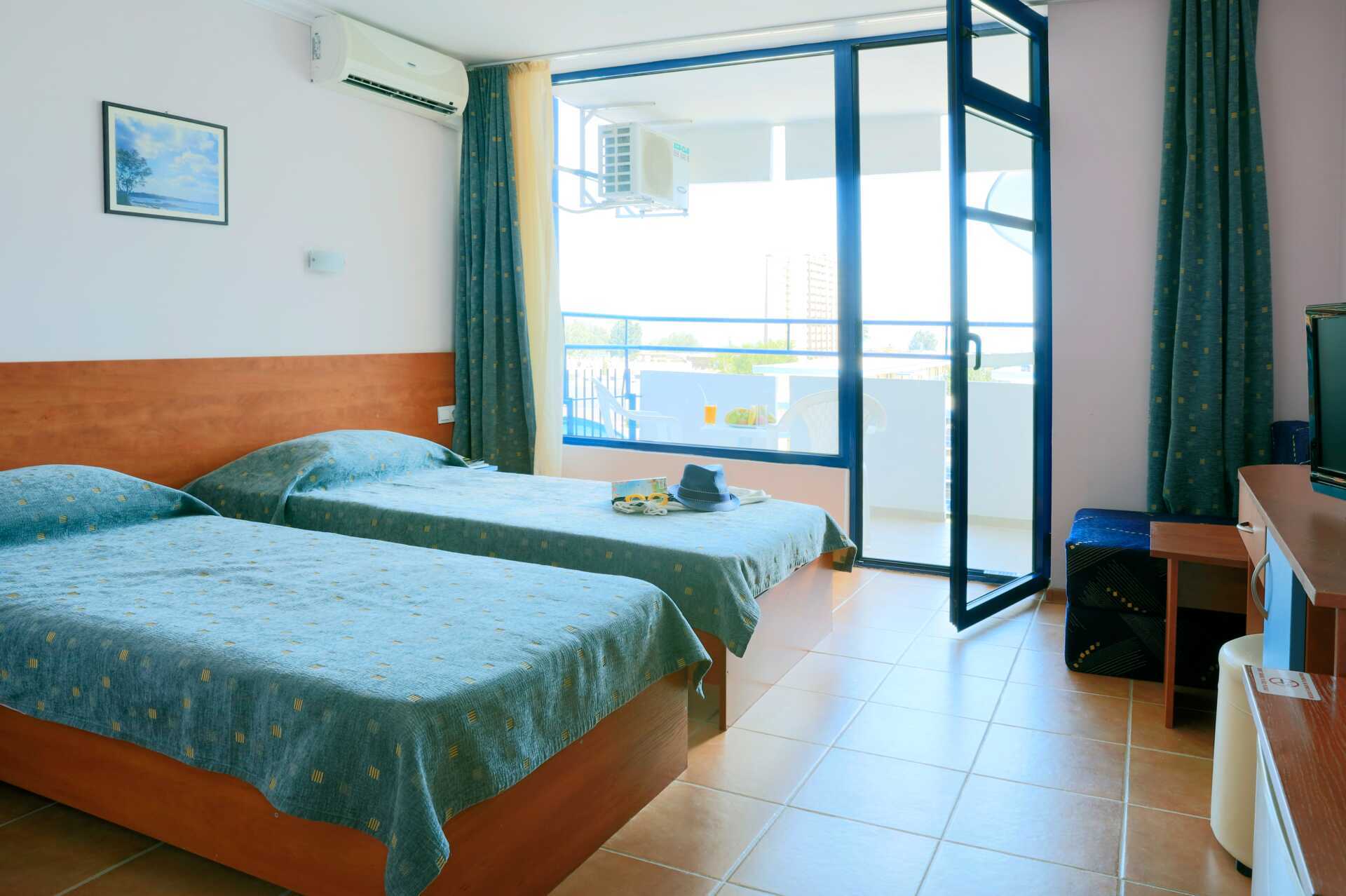 Dubbelrum med balkong. Några av rummen är renoverade och är lite större och några av rummen har heltäckningsmatta. Två enkelsängar. Möjlighet med extrabädd. Luftkonditionering och wifi ingår. Kylskåp. Tv med lokala kanaler. Badrum med dusch och wc. Städning 7 ggr/vecka.