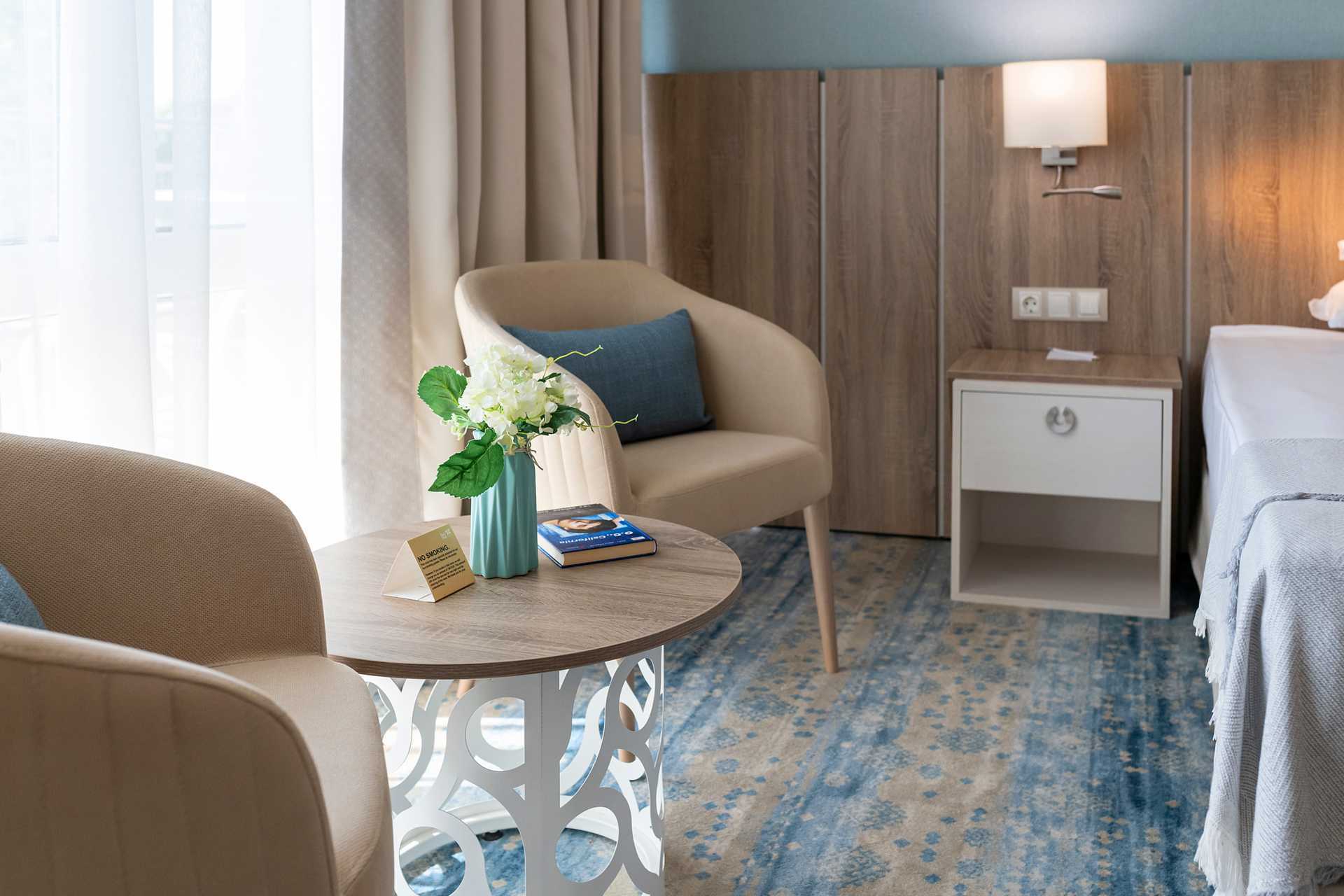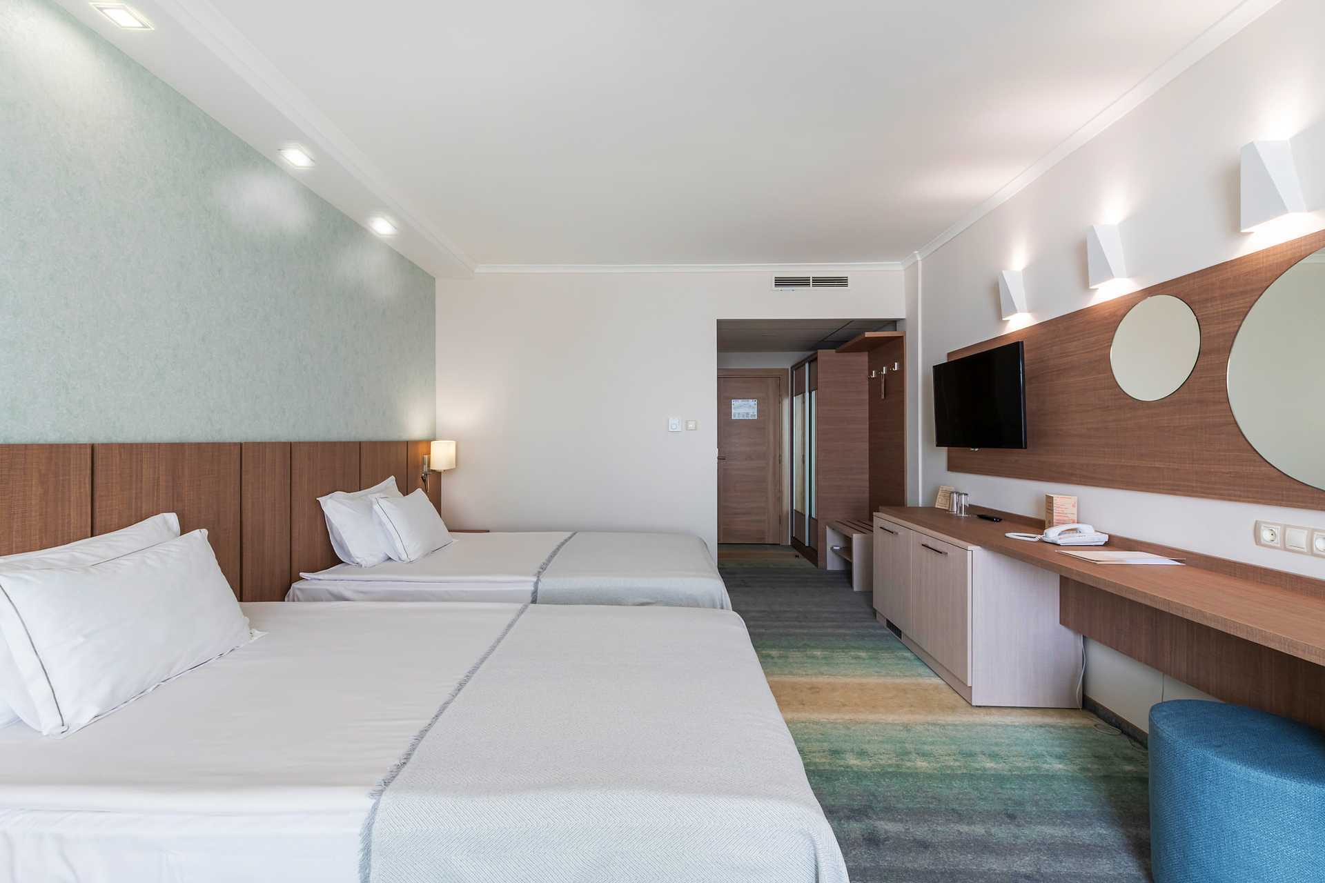 Superiorrum med balkong, vissa med havsutsikt. Rummen ligger i hotellets huvudbyggnad. Två enkelsängar. Möjlighet till extrabädd i enkelsäng eller i bäddbar soffa/fåtölj. Wifi, luftkonditionering och deponering ingår. Heltäckningsmatta. Minibar mot avgift. Kaffemaskin - kapslar ingår och fylls på under veckan. Tv med internationella kanaler. Hårtork. Badrum med dusch och wc. Städning 7 ggr/vecka.