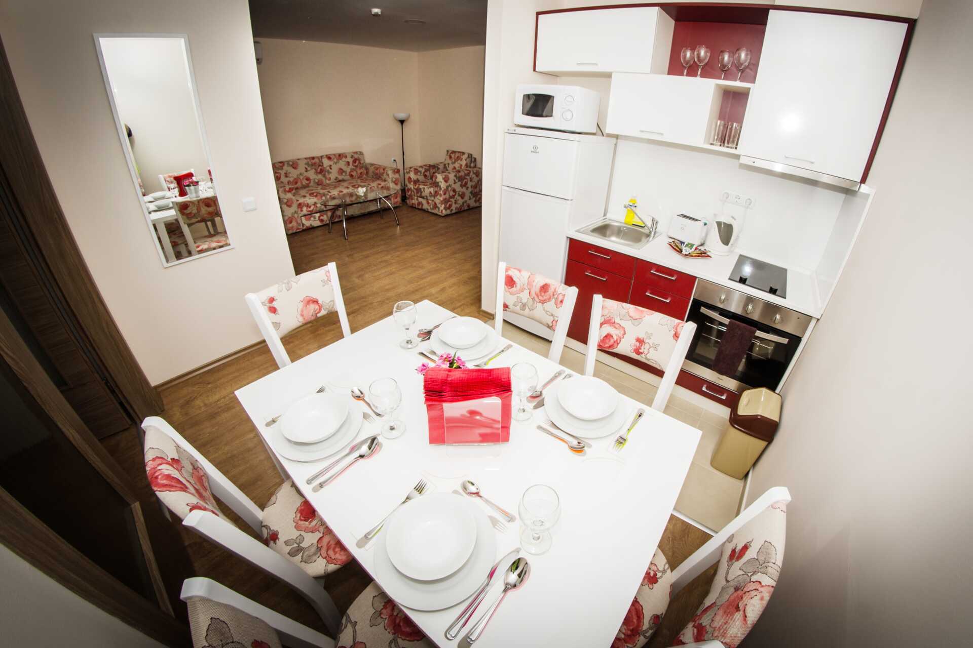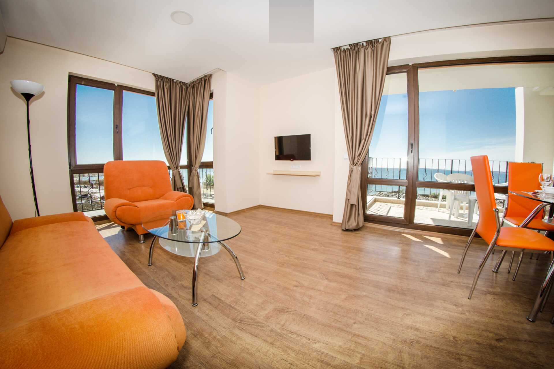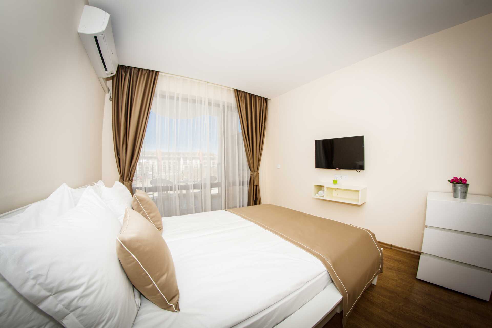 Trerumslägenhet med balkong. Två sovrum och ett kombinerat vardagsrum/minikök. Ett sovrum med en dubbelsäng och ett sovrum med två enkelsängar. Möjlighet till extrabädd i bäddsoffa. Minikök med kokplattor, fläkt, kylskåp, vattenkokare, brödrost, mikrovågsugn och enkel köksutrustning. I vissa lägenheter finns också en ugn. Wifi, luftkonditionering och deponering ingår. Tv med internationella kanaler. Tvättmaskin. Strykjärn och strykbräda. Hårtork. Badrum med dusch och wc. Städning 7 ggr/vecka.