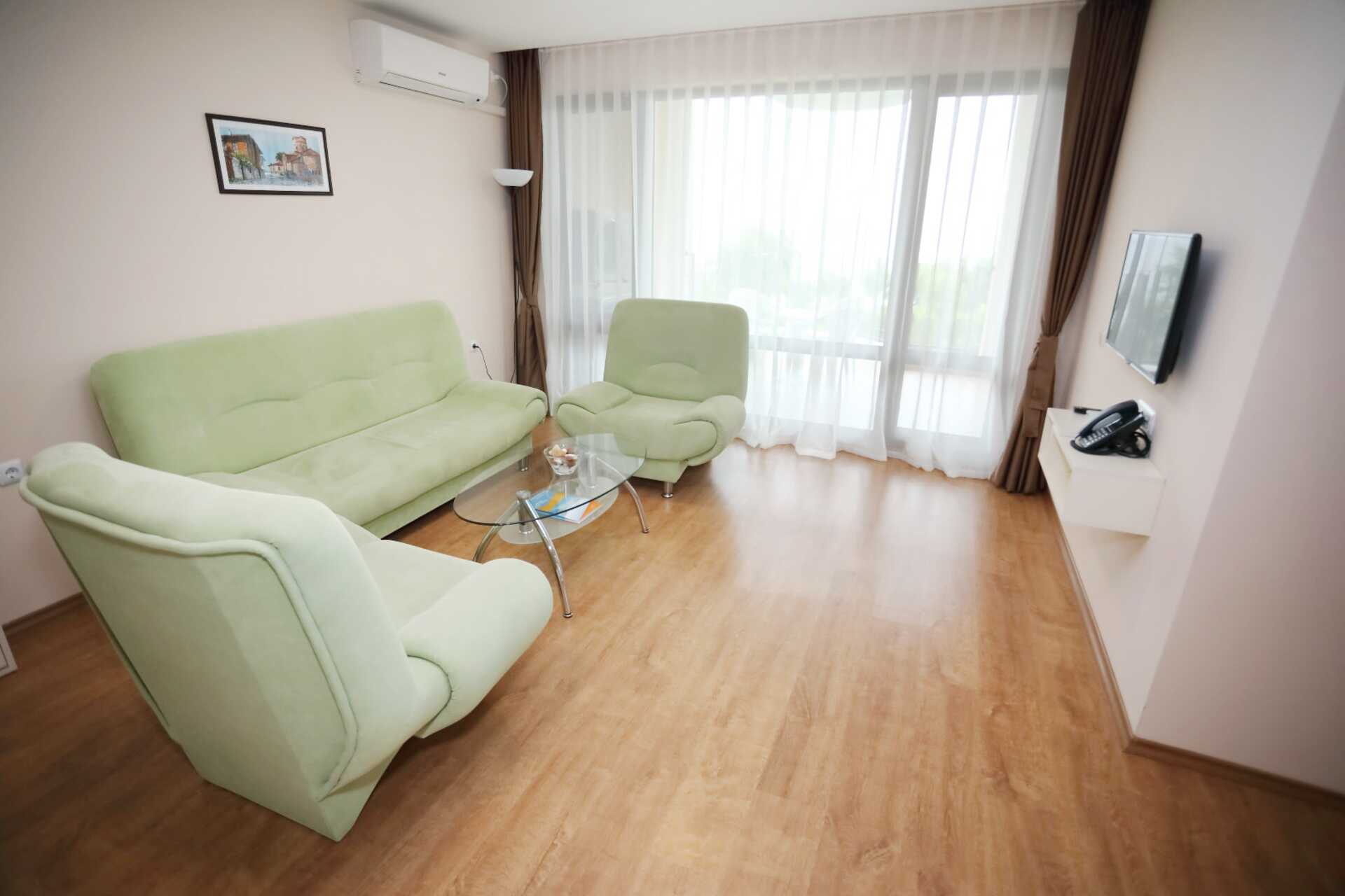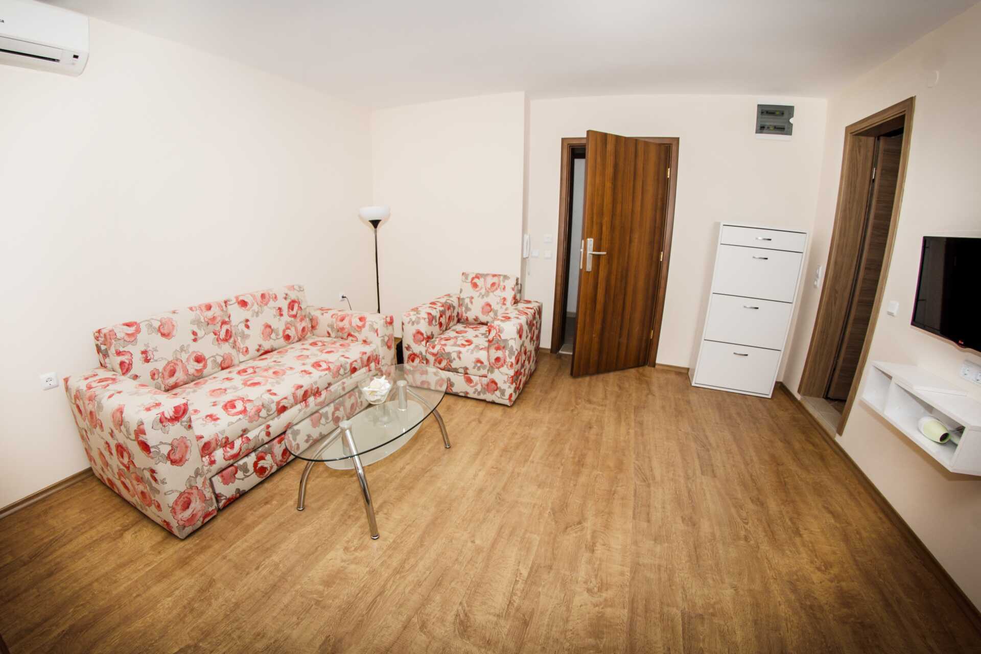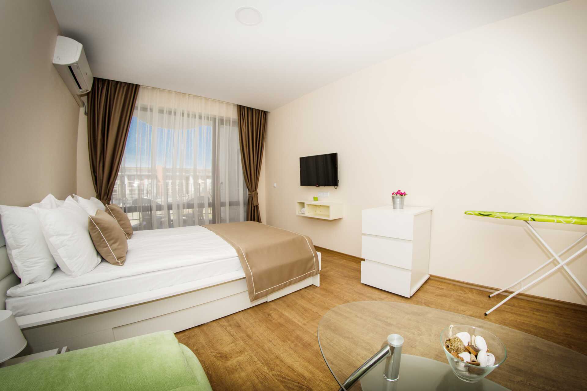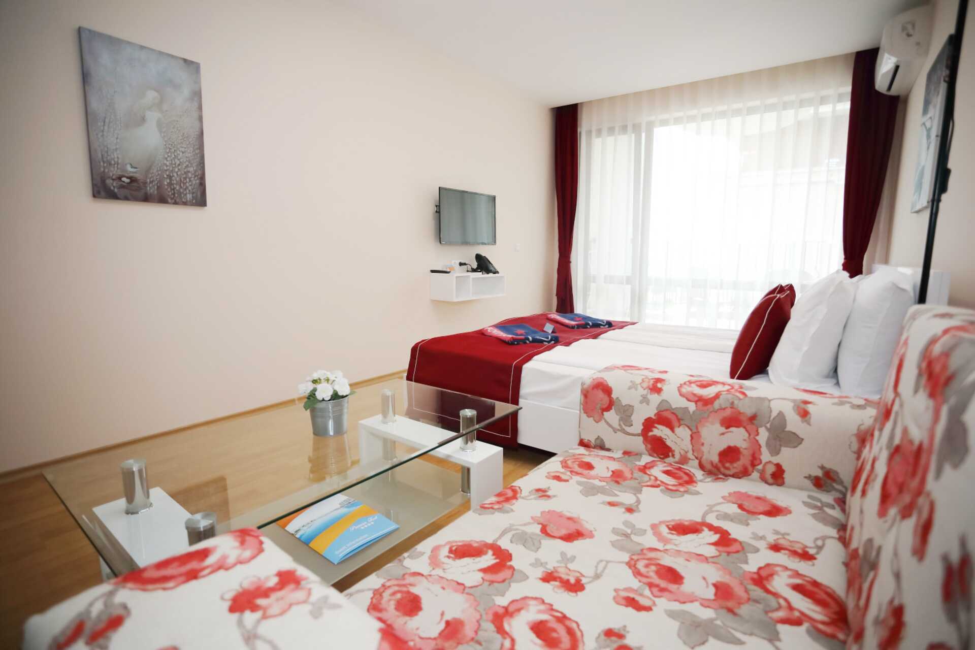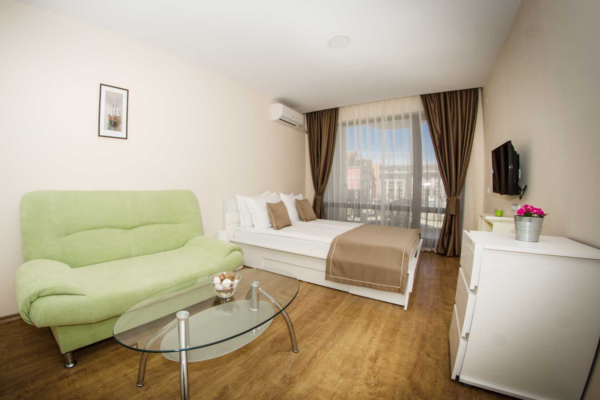 Tvårumslägenhet med balkong. Sovrum och ett kombinerat vardagsrum/minikök. En dubbelsäng. Möjlighet till extrabädd i bäddsoffa. Minikök med kokplattor, fläkt, kylskåp, vattenkokare, brödrost, mikrovågsugn och enkel köksutrustning. I vissa lägenheter finns också en ugn. Wifi, luftkonditionering och deponering ingår. Tv med internationella kanaler. Tvättmaskin. Strykjärn och strykbräda. Hårtork. Badrum med dusch och wc. Städning 7 ggr/vecka.