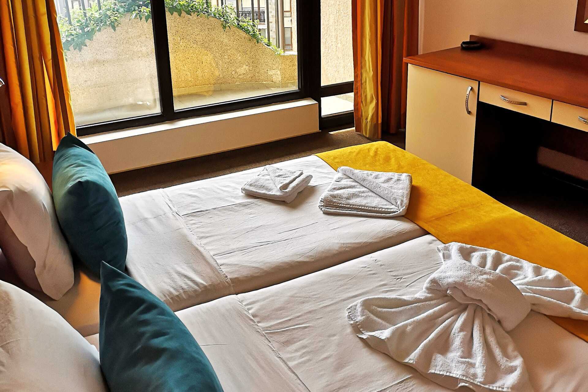 Familjerum med balkong. Två enkelsängar. Möjlighet till extrabäddar i bäddbar soffa. Kostnadsfritt wifi. Luftkonditionering och deponering mot avgift. Heltäckningsmatta. Kylskåp. Tv med lokala kanaler. Badrum med dusch samt wc. Städning 7 ggr/vecka.