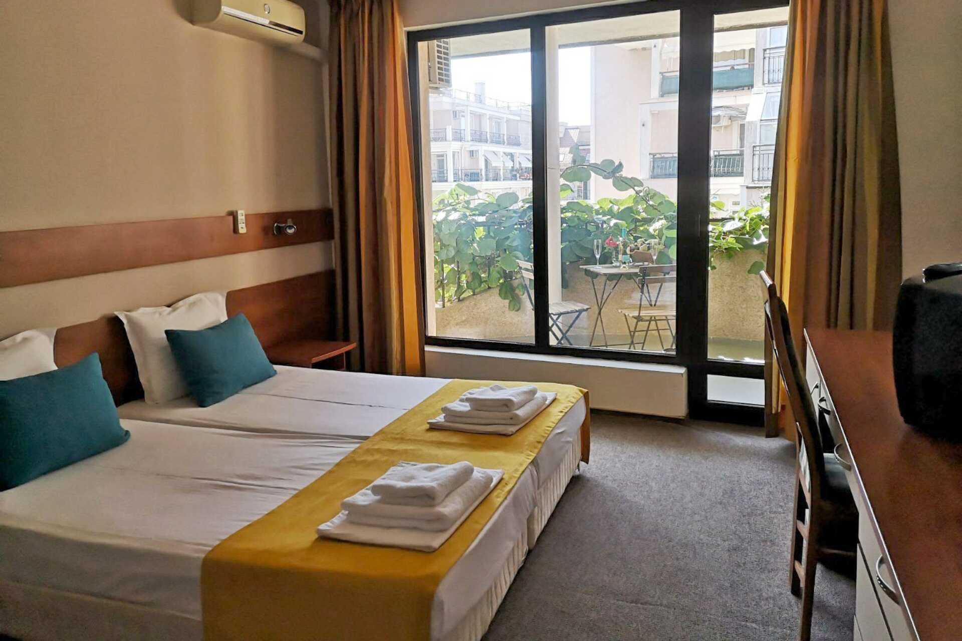 Dubbelrum med balkong. Två enkelsängar. Möjlighet till extrabädd i bäddbar soffa. Kostnadsfritt wifi. Luftkonditionering och deponering mot avgift. Heltäckningsmatta. Kylskåp. Tv med lokala kanaler. Badrum med dusch samt wc. Städning 7 ggr/vecka.