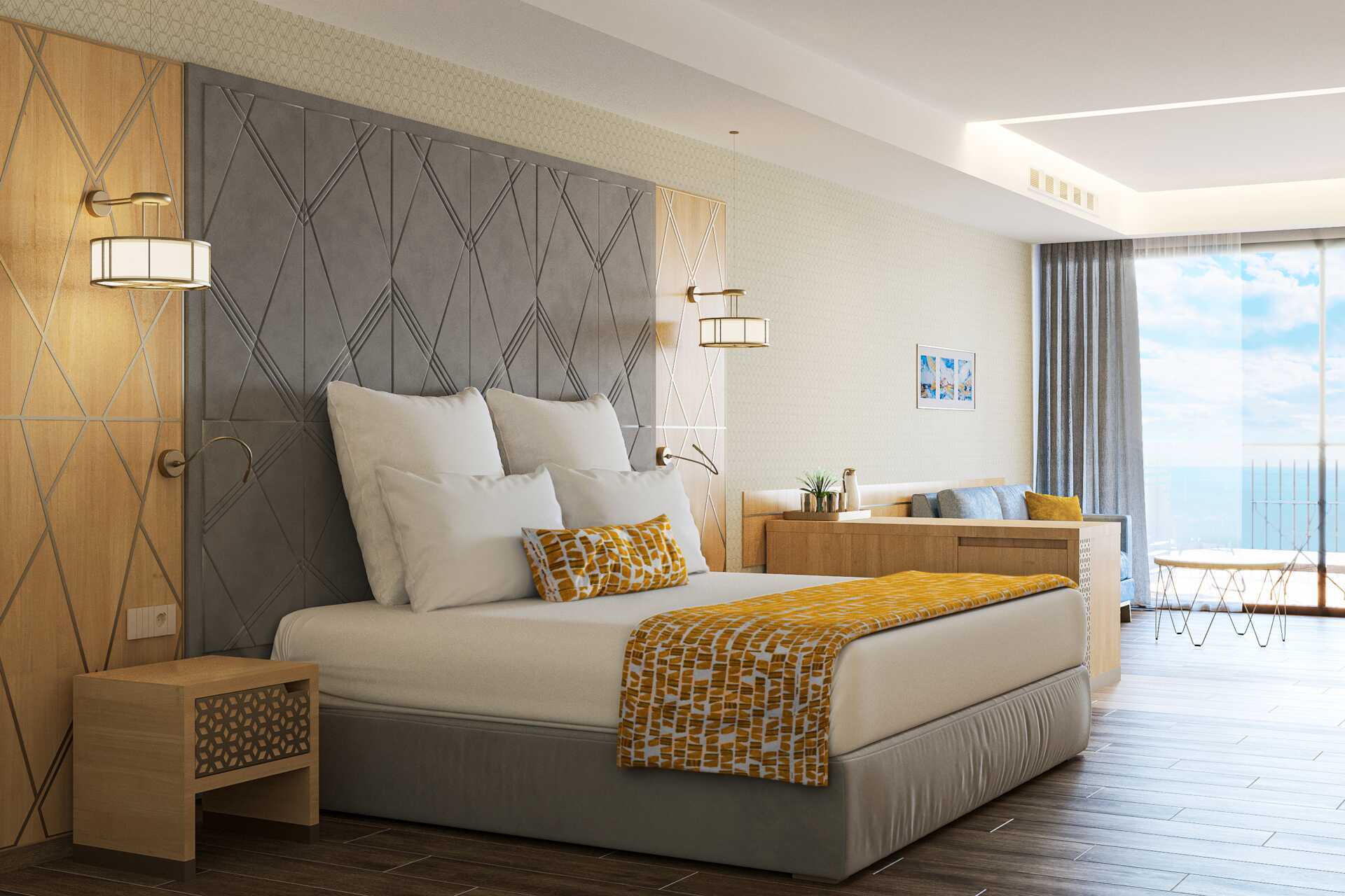 Deluxerum Sea Front med balkong eller terrass och havsutsikt. En dubbelsäng eller två enkelsängar. Wifi, luftkonditionering och deponering ingår. Minibar ingår med läsk, vatten på flaska och öl - fylls på dagligen. Vattenkokare samt kaffe och te. Tv med internationella kanaler. Badrockar och tofflor. Hårtork. Badrum med dusch och wc. Städning 7 ggr/vecka.