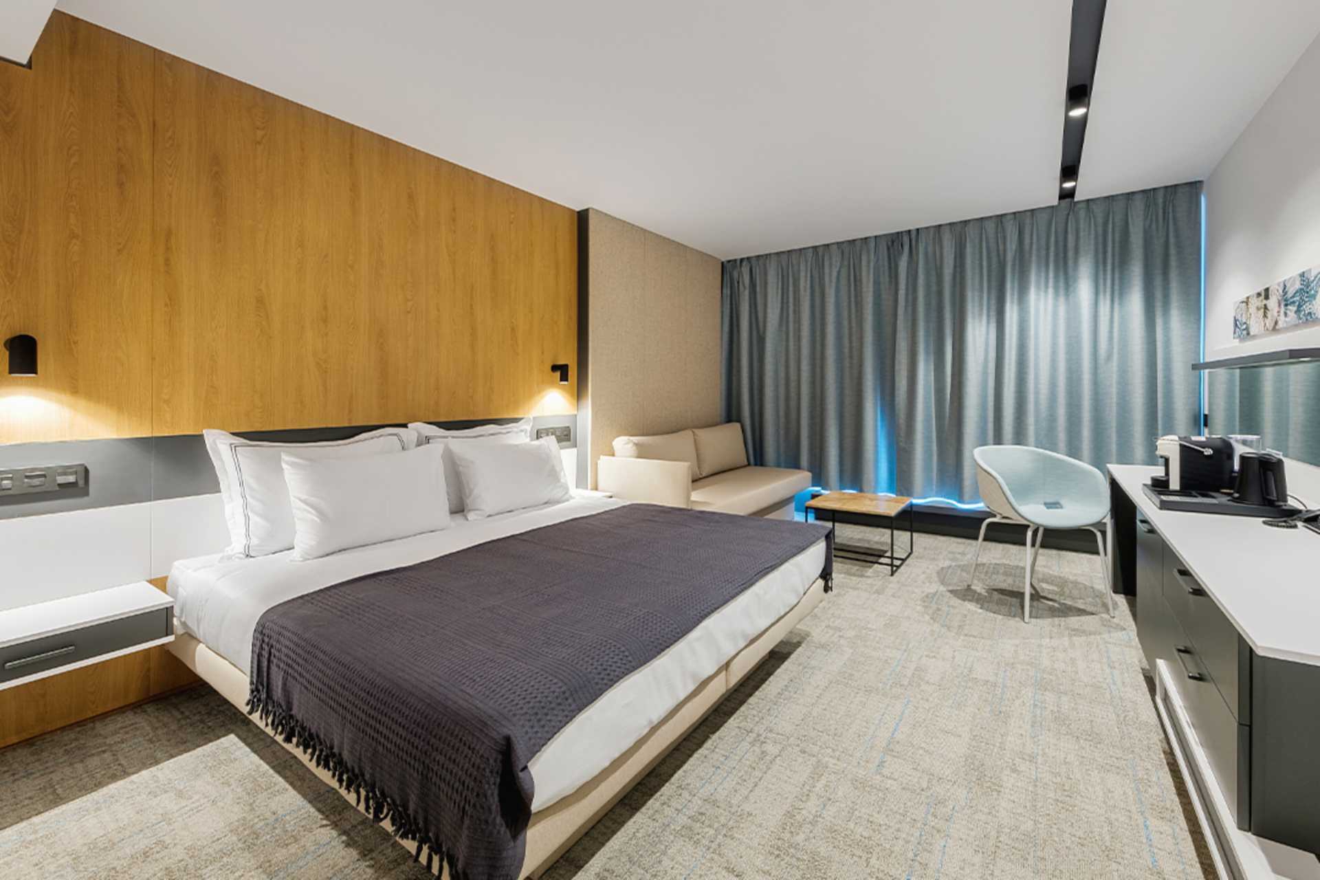 Dubbelrum med balkong eller terrass alternativt stor balkong eller terrass med havsutsikt. En dubbelsäng. Möjlighet till extrabädd i bäddsoffa. Wifi, luftkonditionering och deponering ingår. Minibar - vatten, läsk och öl ingår och fylls på dagligen. Lavazza kaffemaskin - kapslar ingår. Vattenkokare samt kaffe och te. Tv med internationella kanaler. Heltäckningsmatta. Hårtork. Badrum med dusch och wc. Städning 7 ggr/vecka.