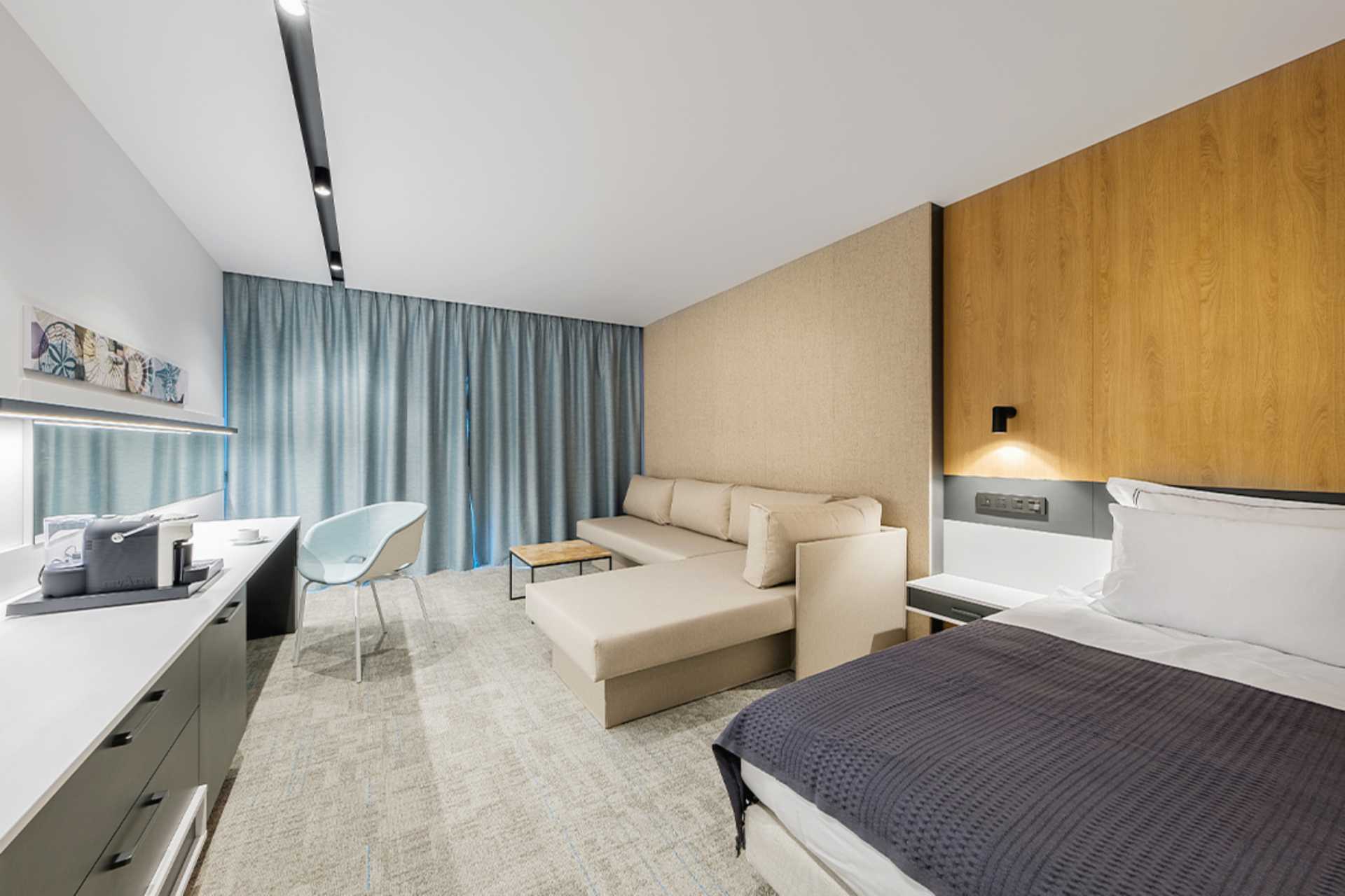 Familjerum med med balkong eller terrass och begränsad havsutsikt. En dubbelsäng och en enkelsäng/del av bäddsoffan. Möjlighet till extrabädd i bäddsoffa. Wifi, luftkonditionering och deponering ingår. Minibar - vatten, läsk och öl ingår och fylls på dagligen. Lavazza kaffemaskin - kapslar ingår. Vattenkokare samt kaffe och te. Tv med internationella kanaler. Heltäckningsmatta. Hårtork. Badrum med dusch och wc. Städning 7 ggr/vecka.