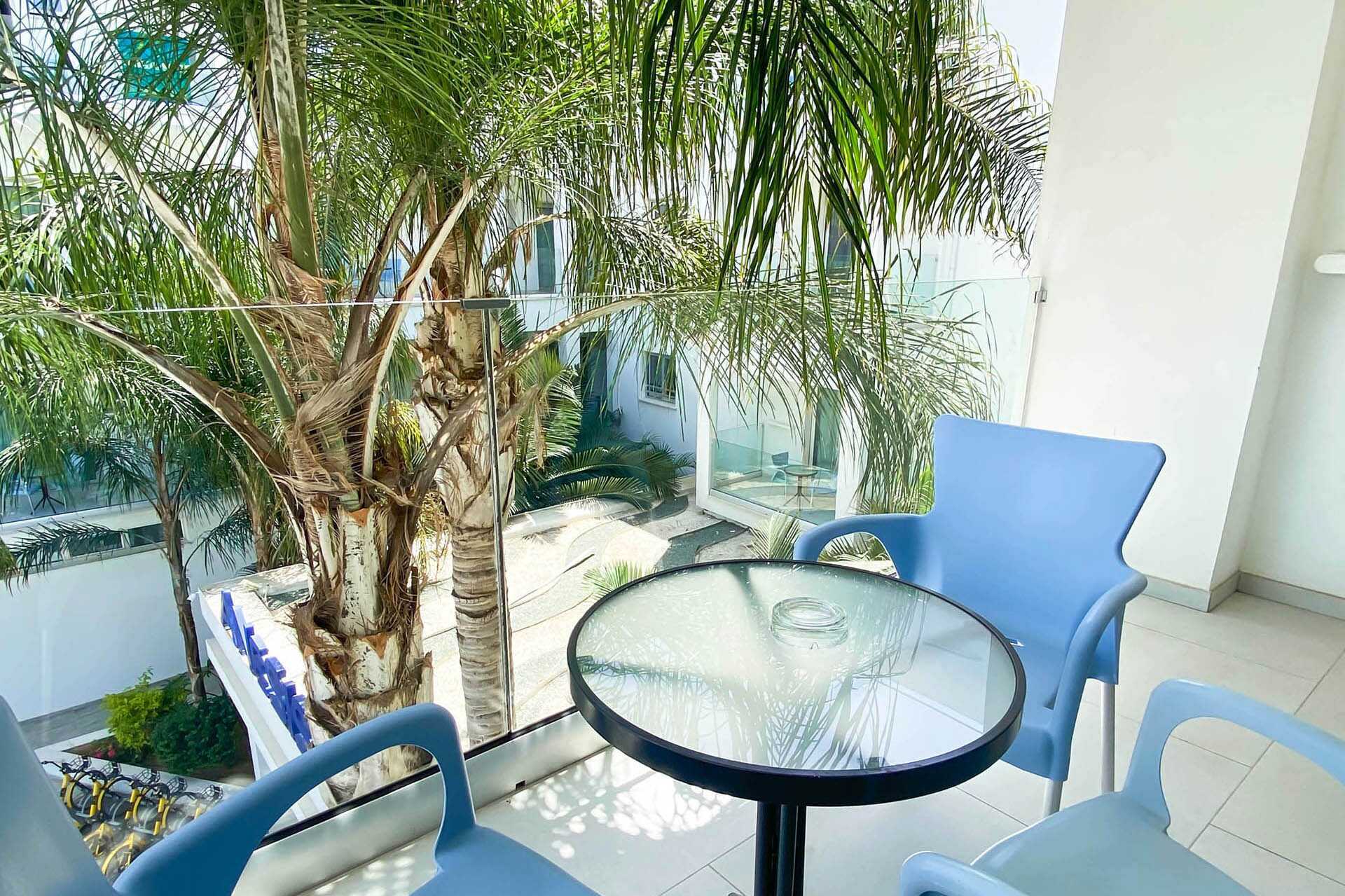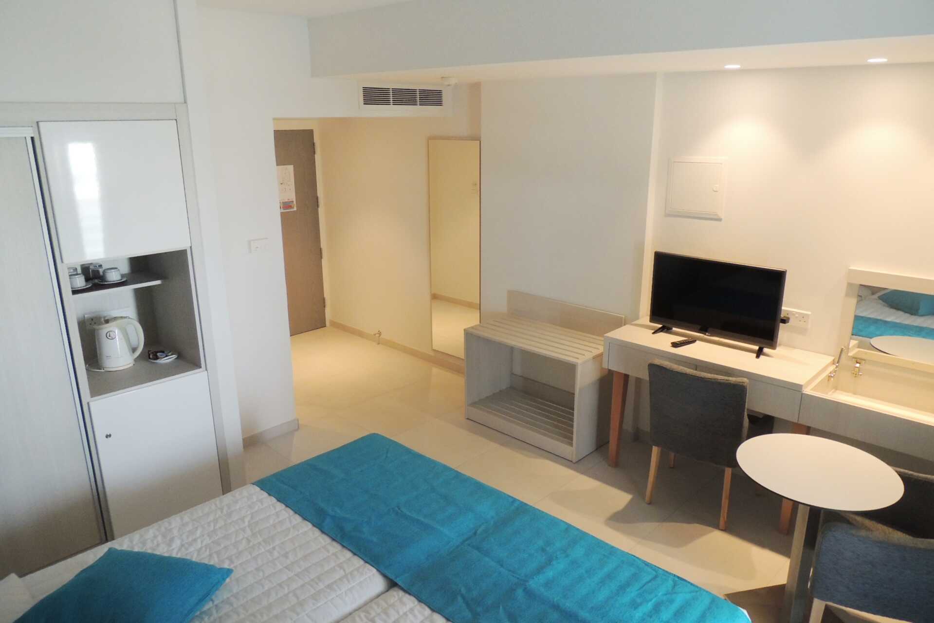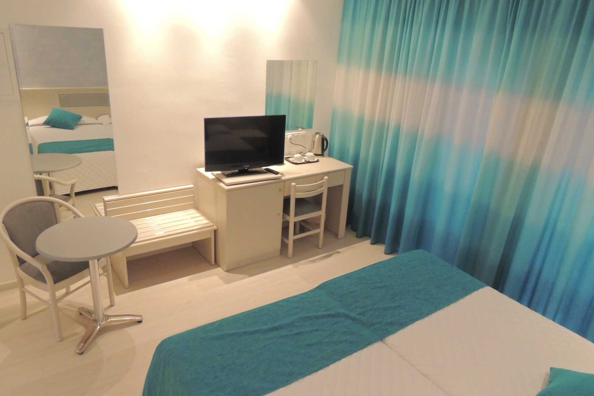 Dubbelrum med balkong, vissa med poolutsikt. Två enkelsängar. Möjlighet till extrabädd i hopfällbar säng. Wifi och luftkonditionering ingår. Deponering mot avgift. Litet kylskåp. Vattenkokare samt kaffe och te. Tv med internationella kanaler. Hårtork. Badrum med dusch och wc. Städning 7 ggr/vecka. Barn under två år räknas in i max antal personer i rummet.