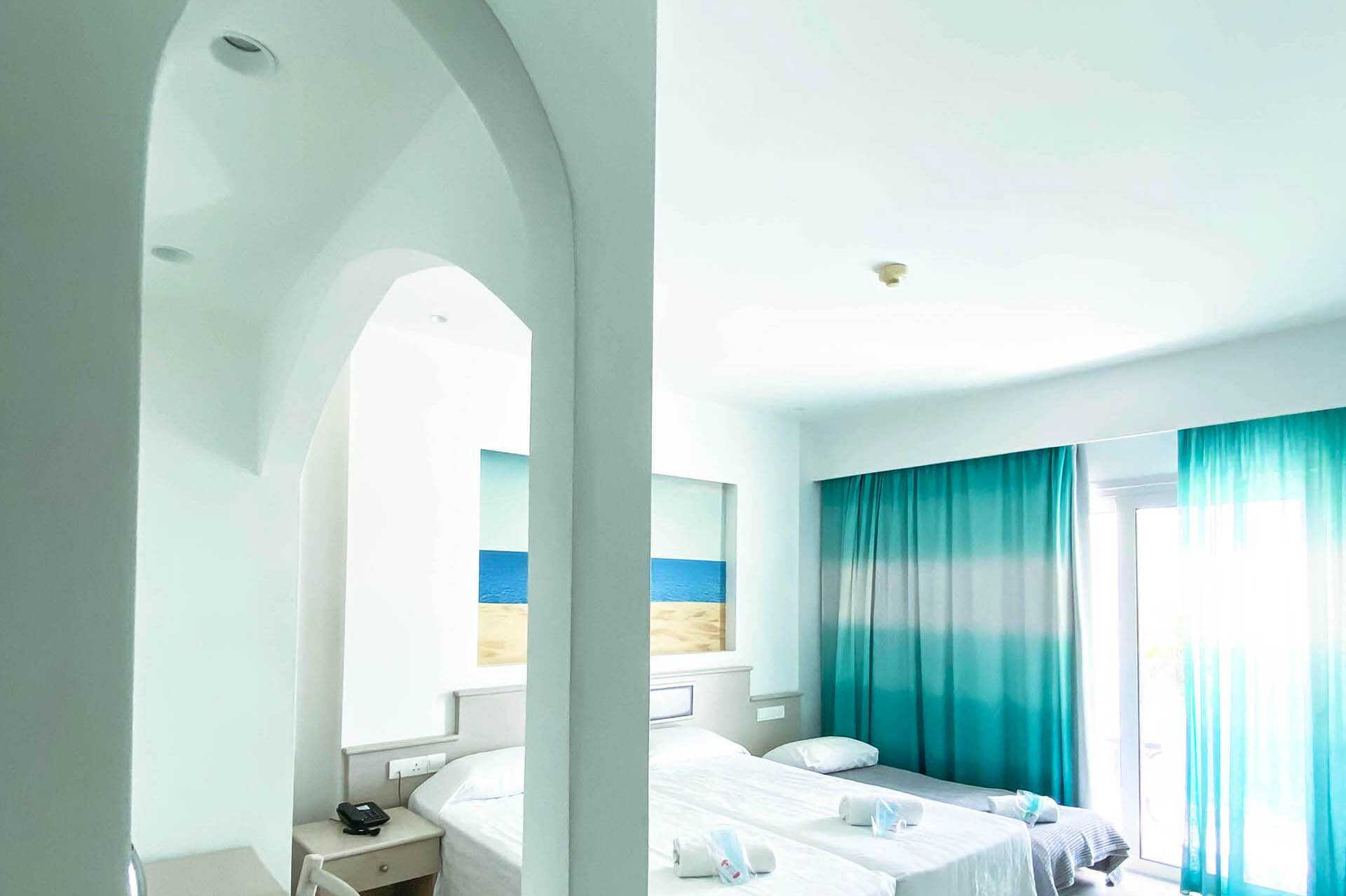 Familjerum med balkong, vissa med poolutsikt. Två enkelsängar. Möjlighet till extrabäddar i hopfällbara sängar. Wifi och luftkonditionering ingår. Deponering mot avgift. Litet kylskåp. Vattenkokare samt kaffe och te. Tv med internationella kanaler. Hårtork. Badrum med dusch och wc. Städning 7 ggr/vecka. Barn under två år räknas in i max antal personer i rummet.