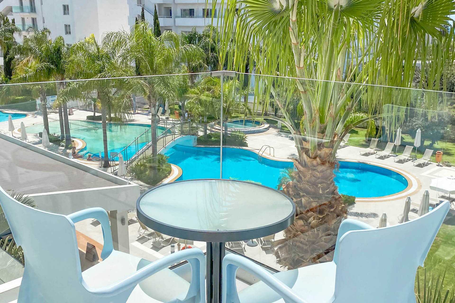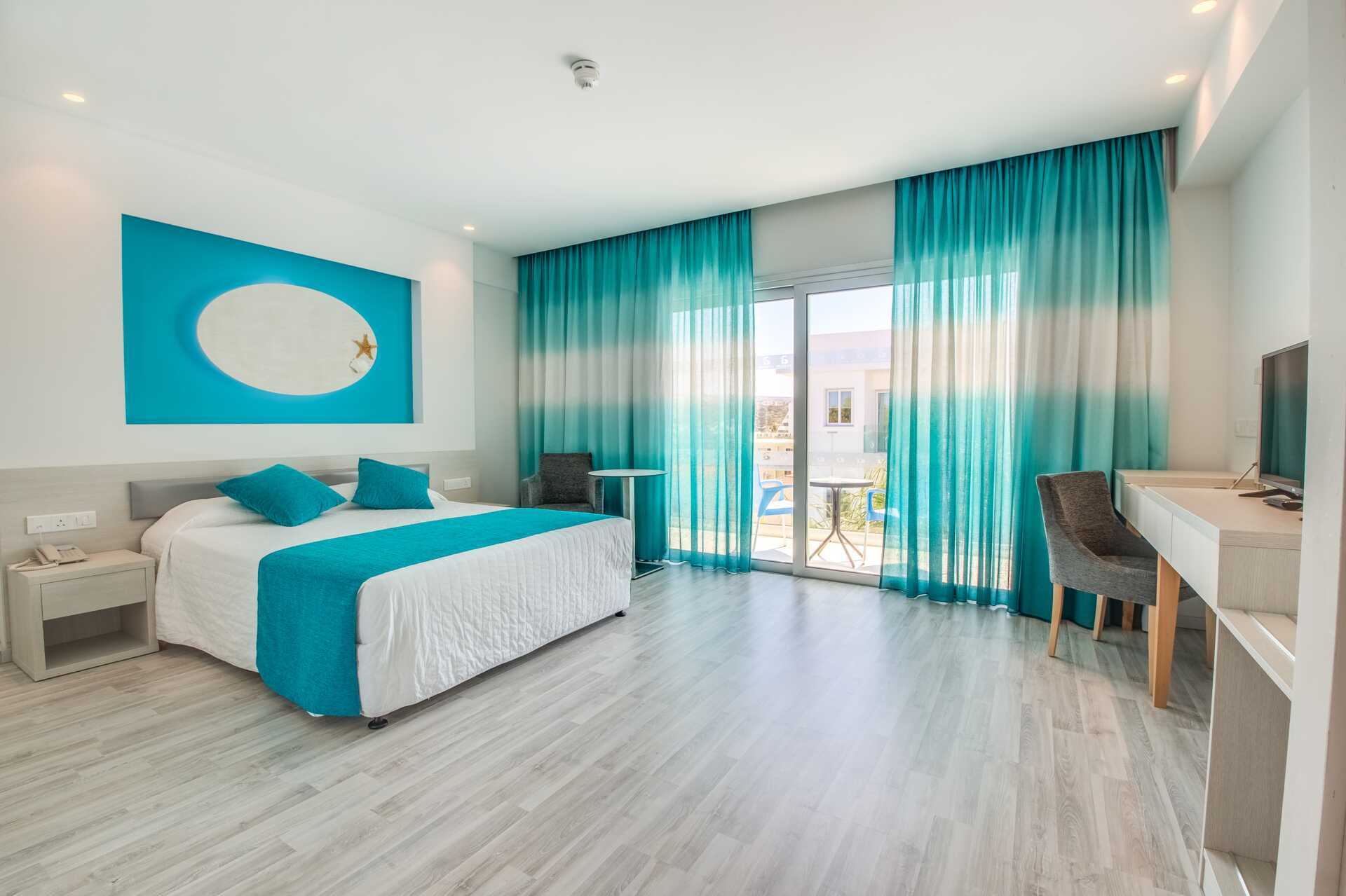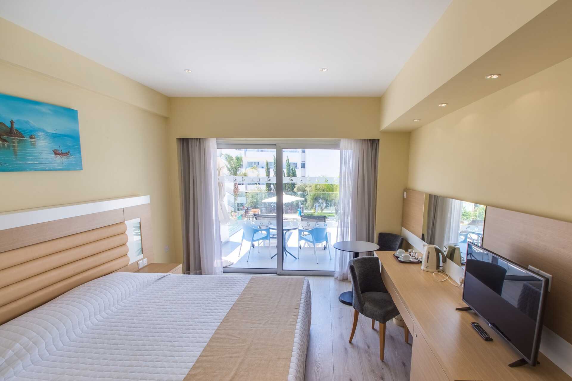 Superiorrum med stor terrass med poolutsikt. Solstolar och parasoll på uteplatsen. En dubbelsäng eller två enkelsängar. Wifi och luftkonditionering ingår. Deponering mot avgift. Litet kylskåp. Vattenkokare samt kaffe och te. Tv med internationella kanaler. Hårtork. Badrum med dusch och wc. Städning 7 ggr/vecka. Barn under två år räknas in i max antal personer i rummet.