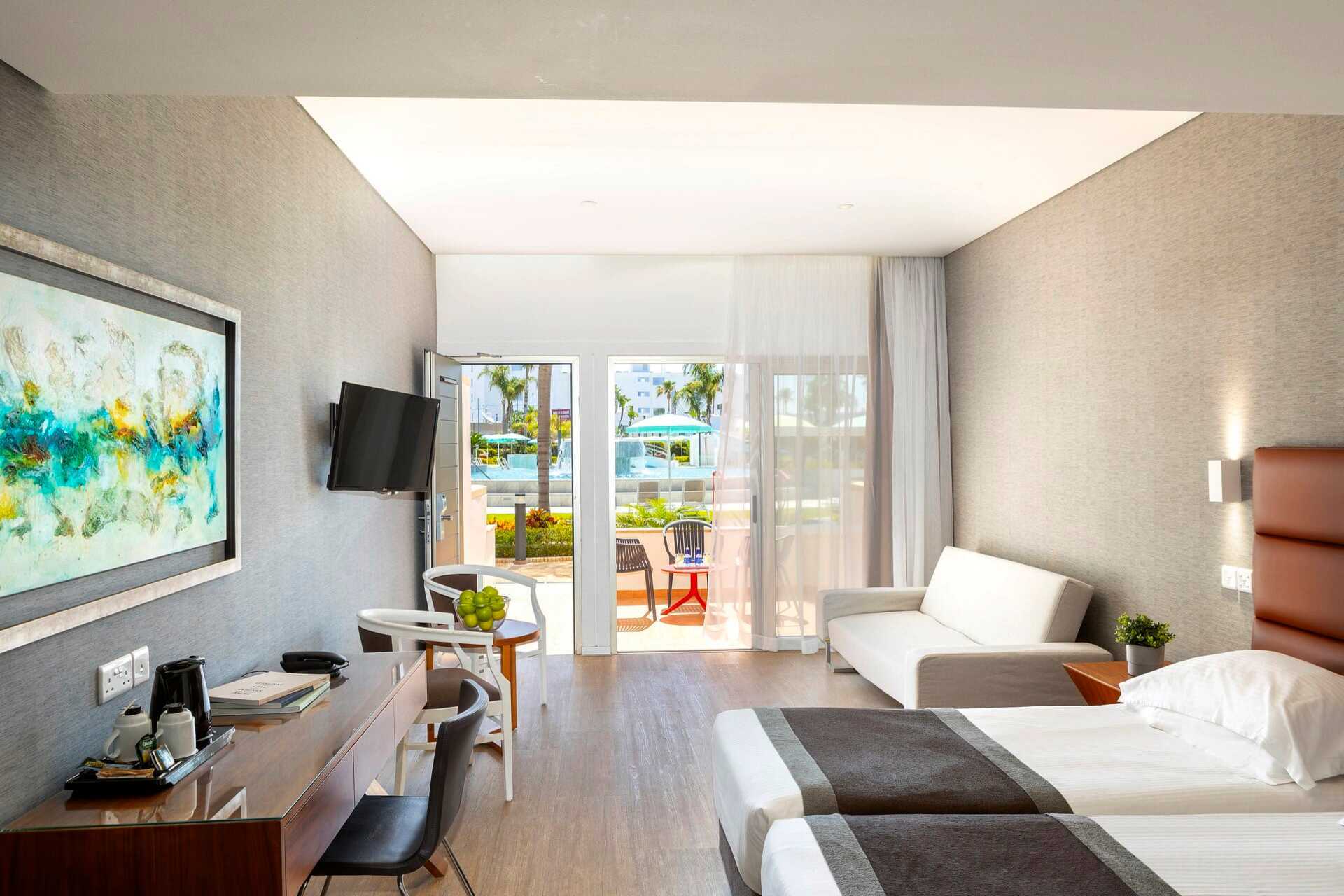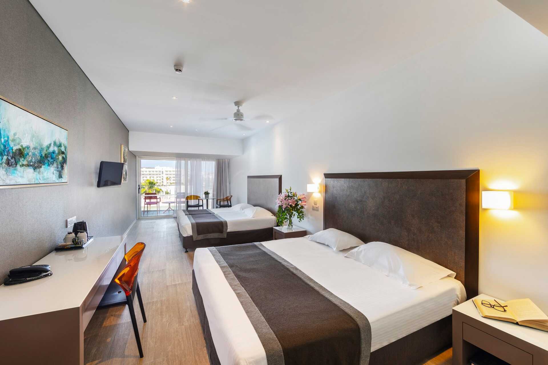 Familjerum med balkong. En dubbelsäng och två enkelsängar. Möjlighet till extrabäddar i befintliga sängar. Wifi, luftkonditionering och deponering ingår. Minibar. Vattenkokare samt kaffe och te. Tv med internationella kanaler. Hårtork. Badrum med dusch och wc. Städning 7 ggr/vecka. Barn under två år räknas in i maxantalet personer i rummet.