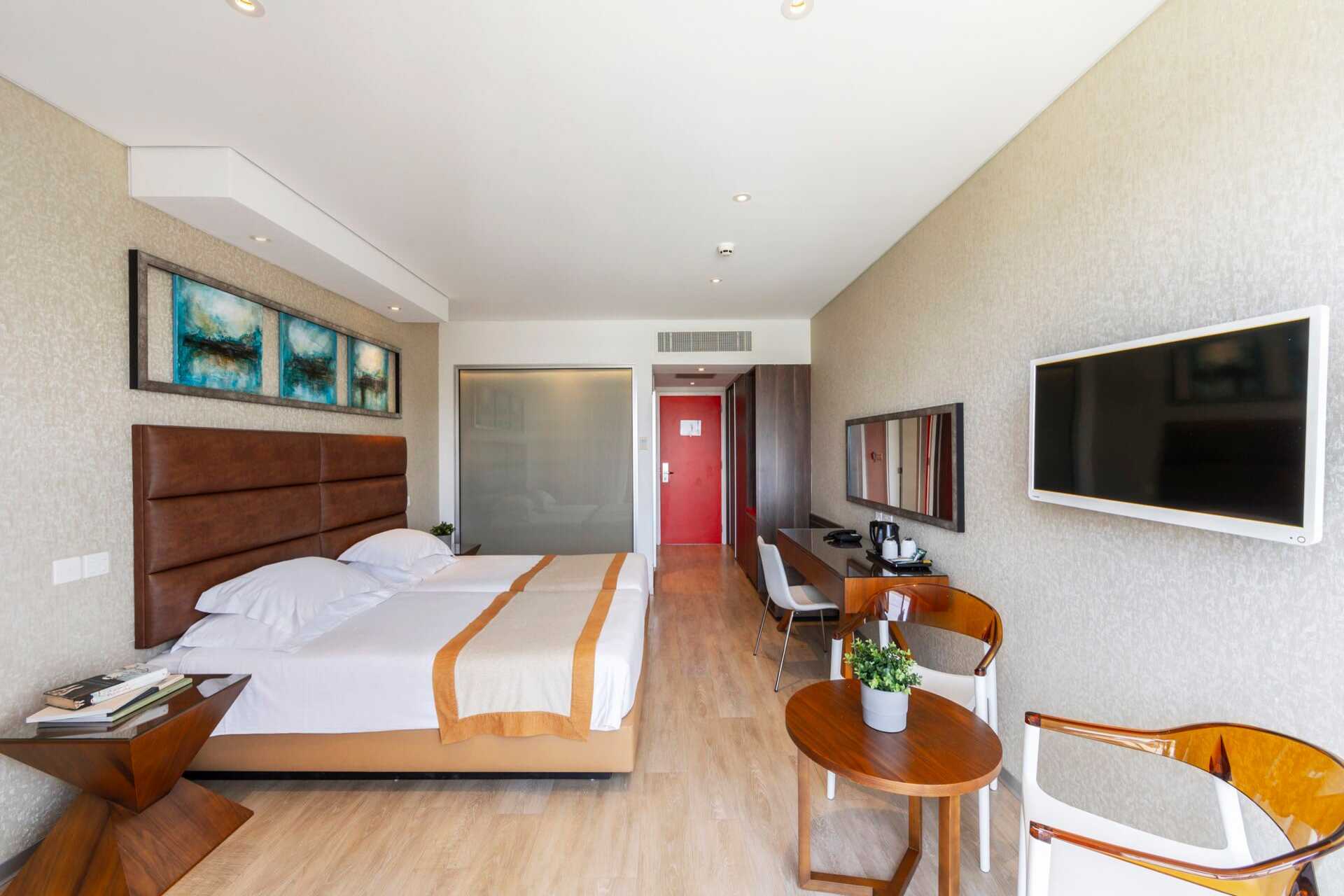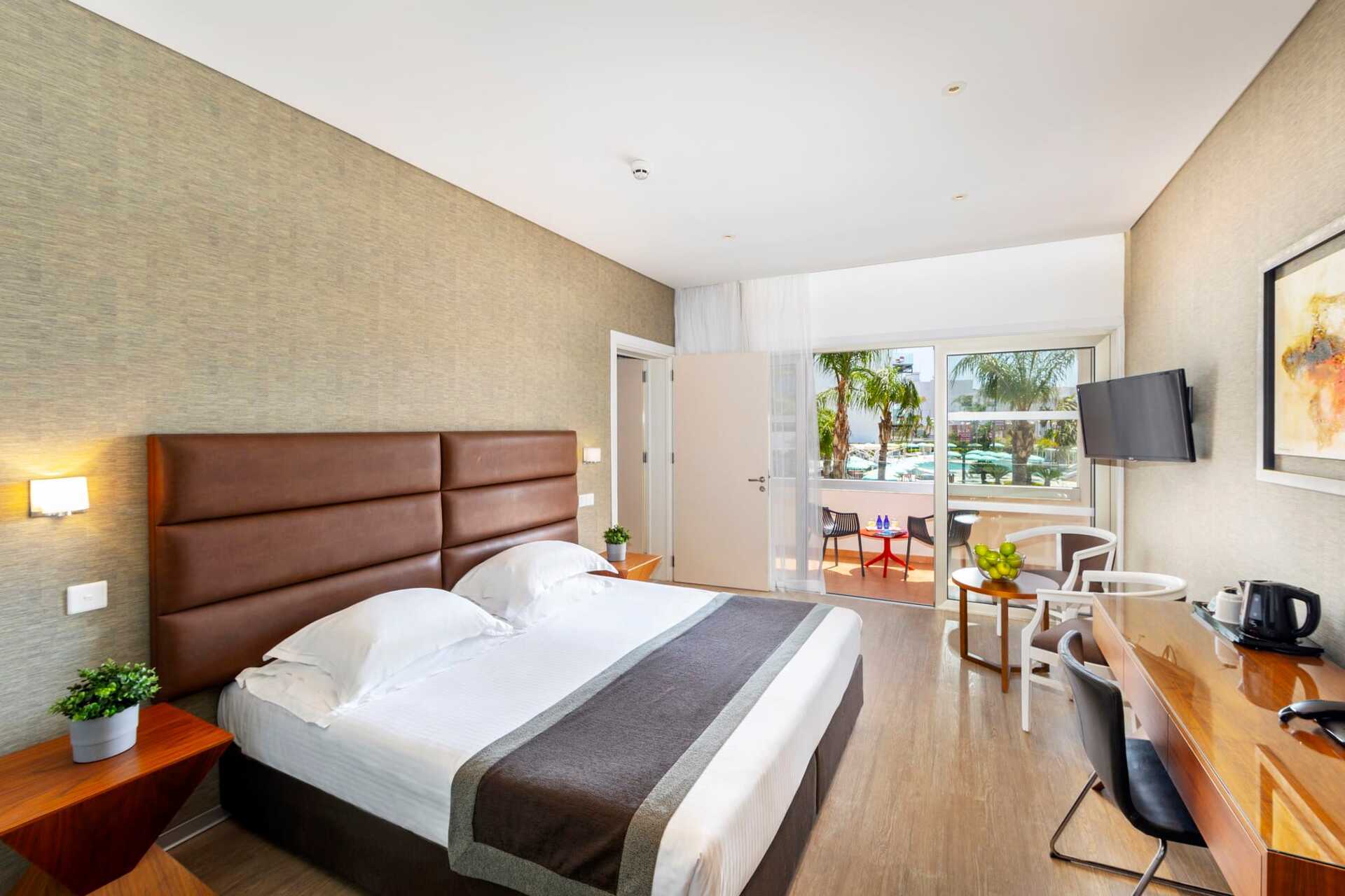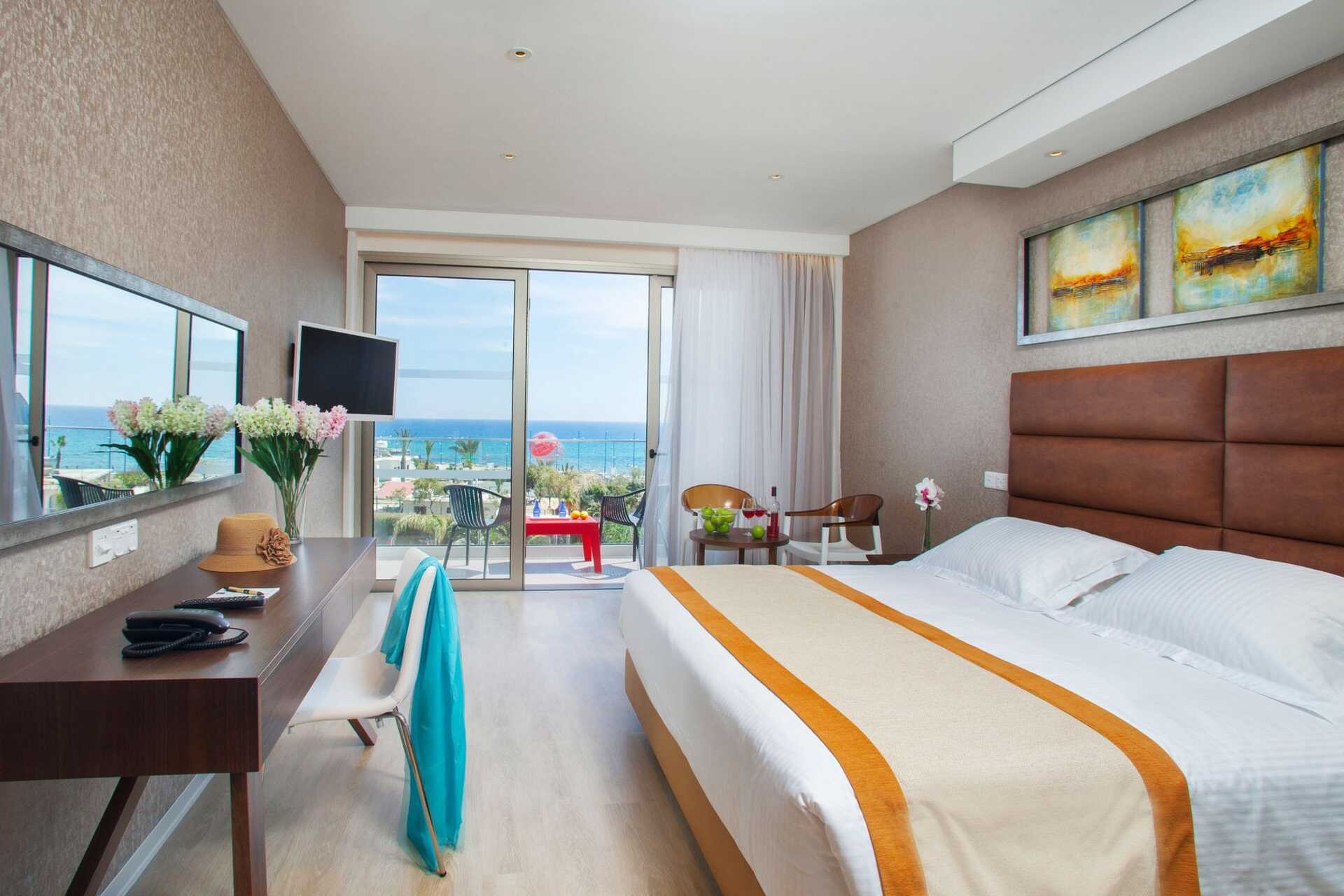 Dubbelrum med balkong, vissa med havsutsikt. En dubbelsäng eller två enkelsängar. Möjlighet till extrabädd i hopvikbar säng. Wifi, luftkonditionering och deponering ingår. Minibar. Vattenkokare samt kaffe och te. Tv med internationella kanaler. Hårtork. Badrum med dusch och wc. Städning 7 ggr/vecka. Barn under två år räknas in i maxantalet personer i rummet.