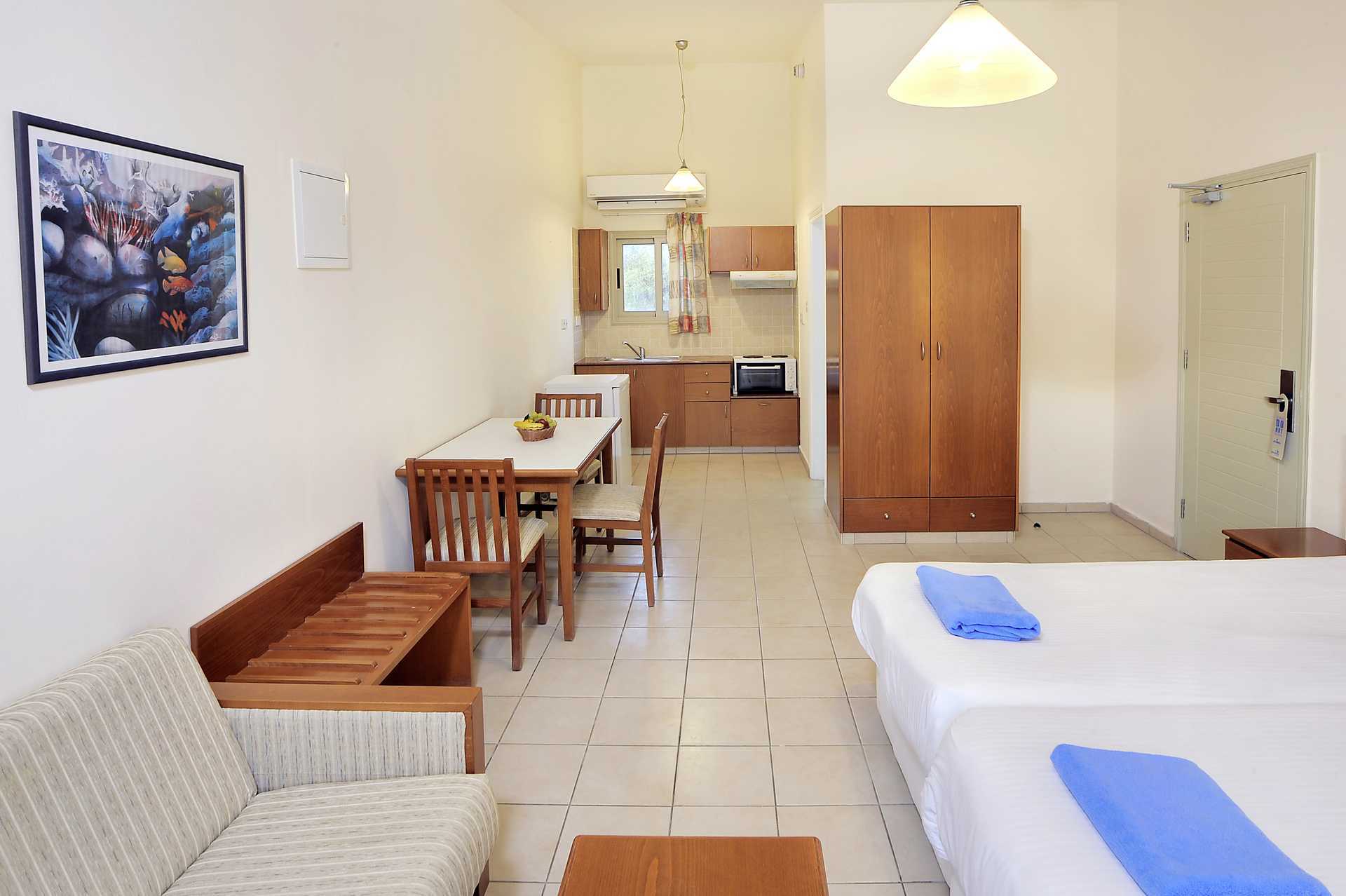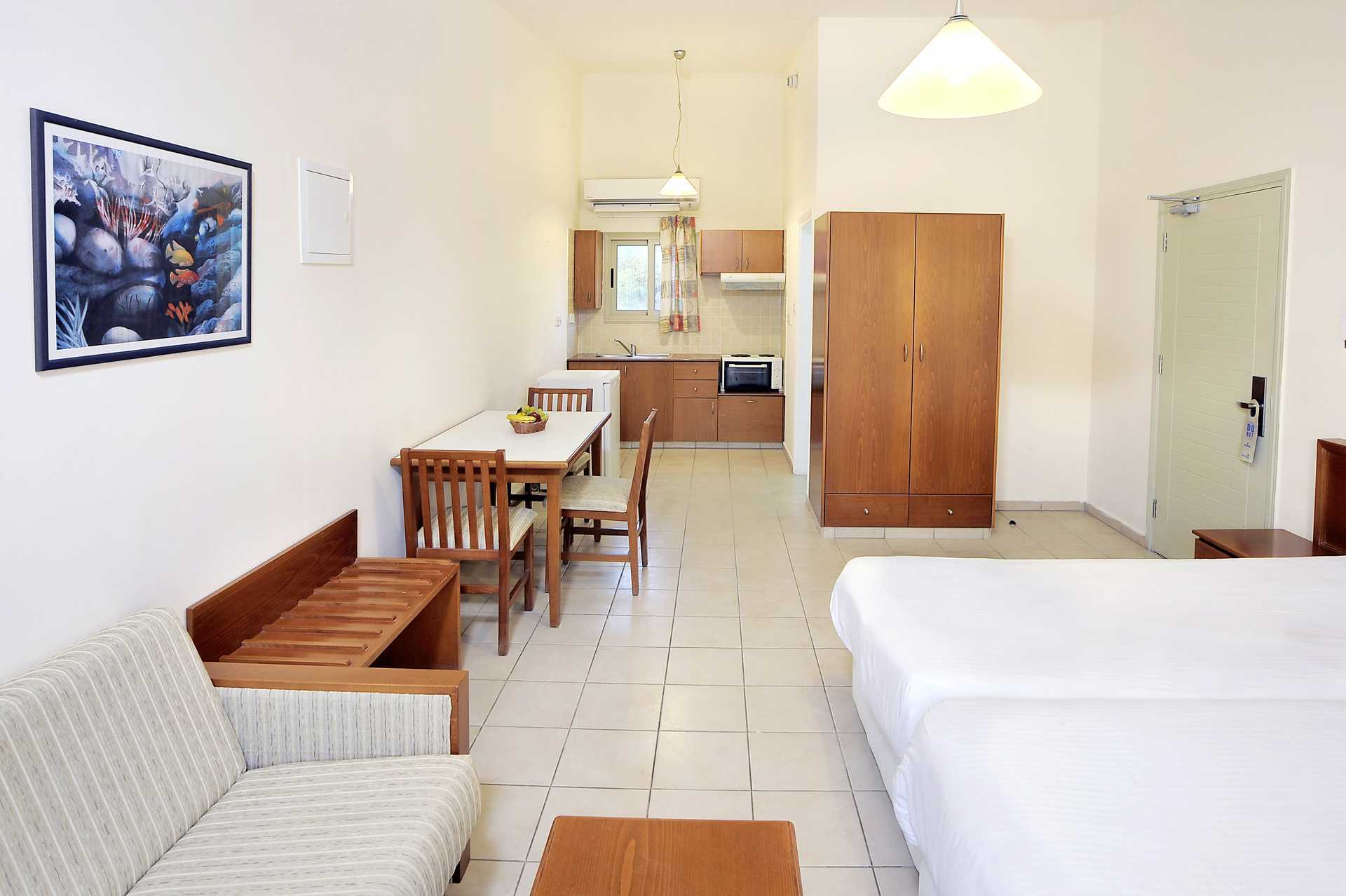 Enrumslägenheter med balkong. Lägenheterna ligger i hotellets bungalowområde - väg måste korsas för att komma till huvudbyggnaden. Kombinerat sovrum och vardagsrum med minikök. Två enkelsängar. Möjlighet med extrasängar i bäddsoffa. Minikök med kylskåp, kokplattor och ugn samt enkel köksutrustning. Luftkonditionering och deponering ingår. Tv med internationella kanaler. Hårtork. Badrum med dusch samt wc. Städning 7 ggr/vecka. Barn under två år räknas in i maxantalet personer i lägenheten.