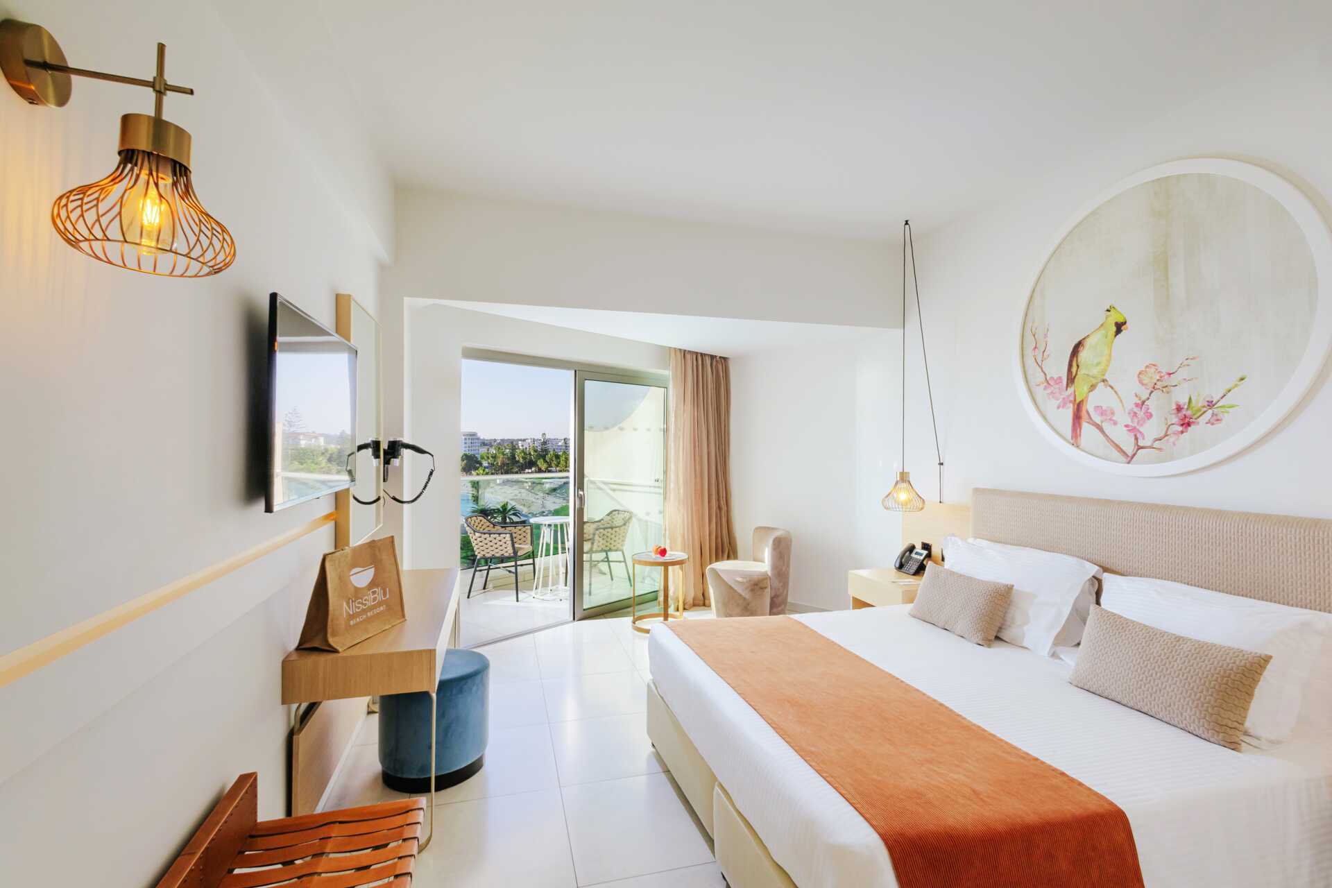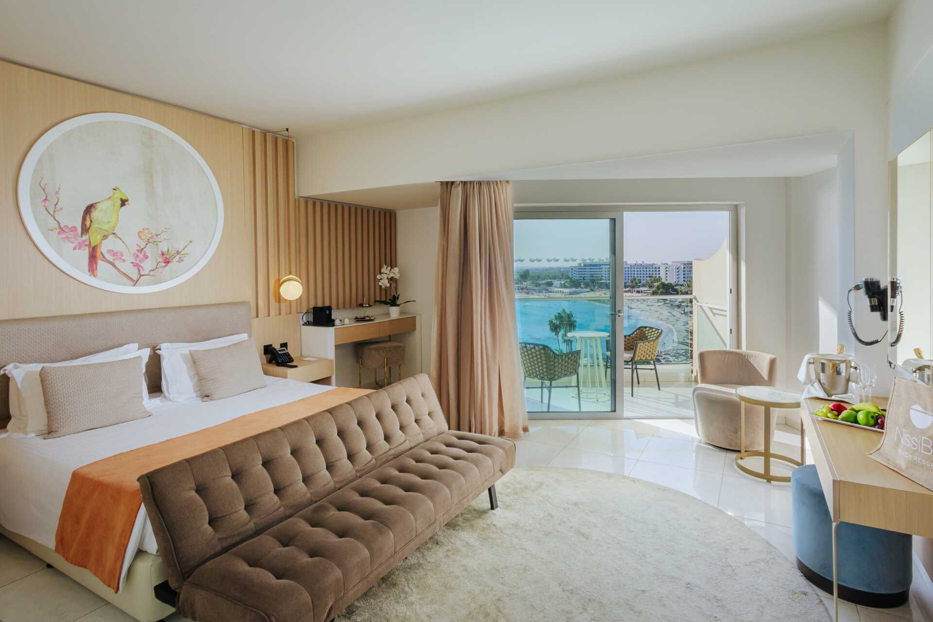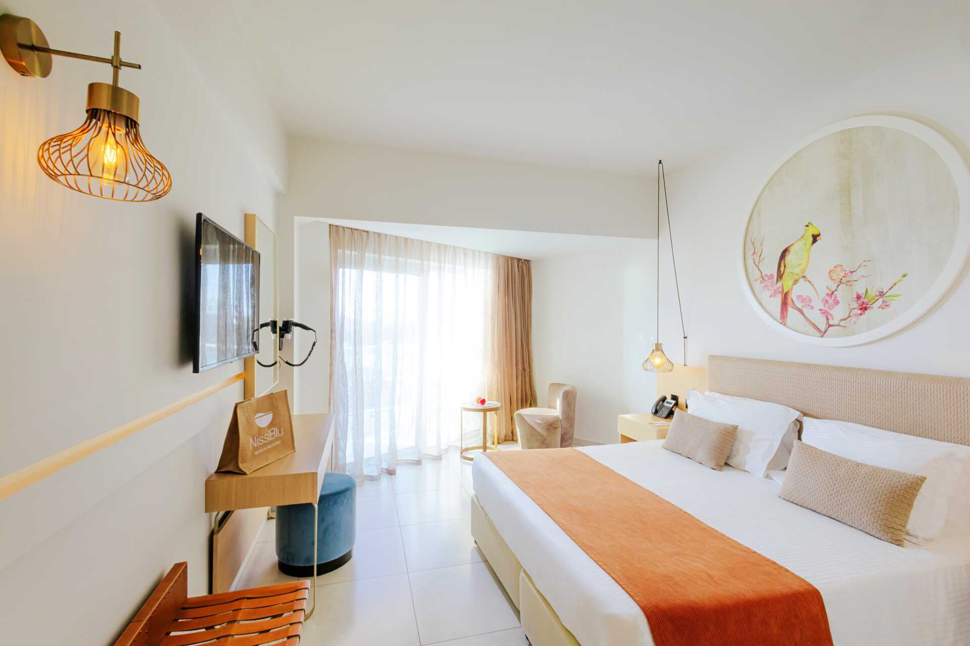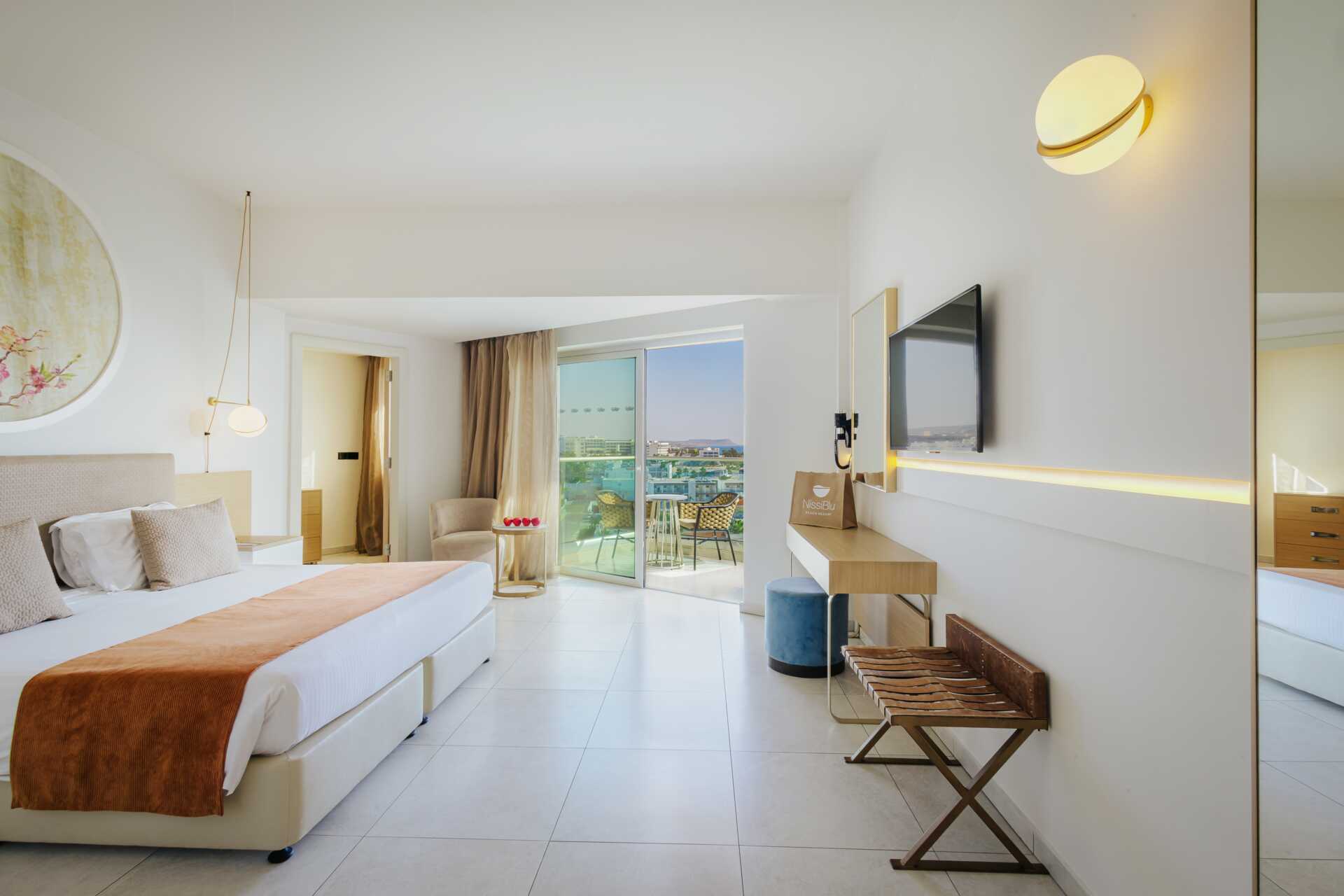 Juniorsvit med balkong och havsutsikt. En dubbelsäng. Möjlighet till extrabädd i bäddsoffa eller i hopfällbar säng. Wifi, luftkonditionering och deponering ingår. Minibar mot avgift. Vattenkokare samt kaffe och te. Kaffemaskin. Tv med internationella kanaler. Strykjärn och strykbräda. Badrockar och tofflor. Hårtork. Badrum med badkar och wc. Städning 7 ggr/vecka. Barn under två år räknas in i max antal personer i rummet.