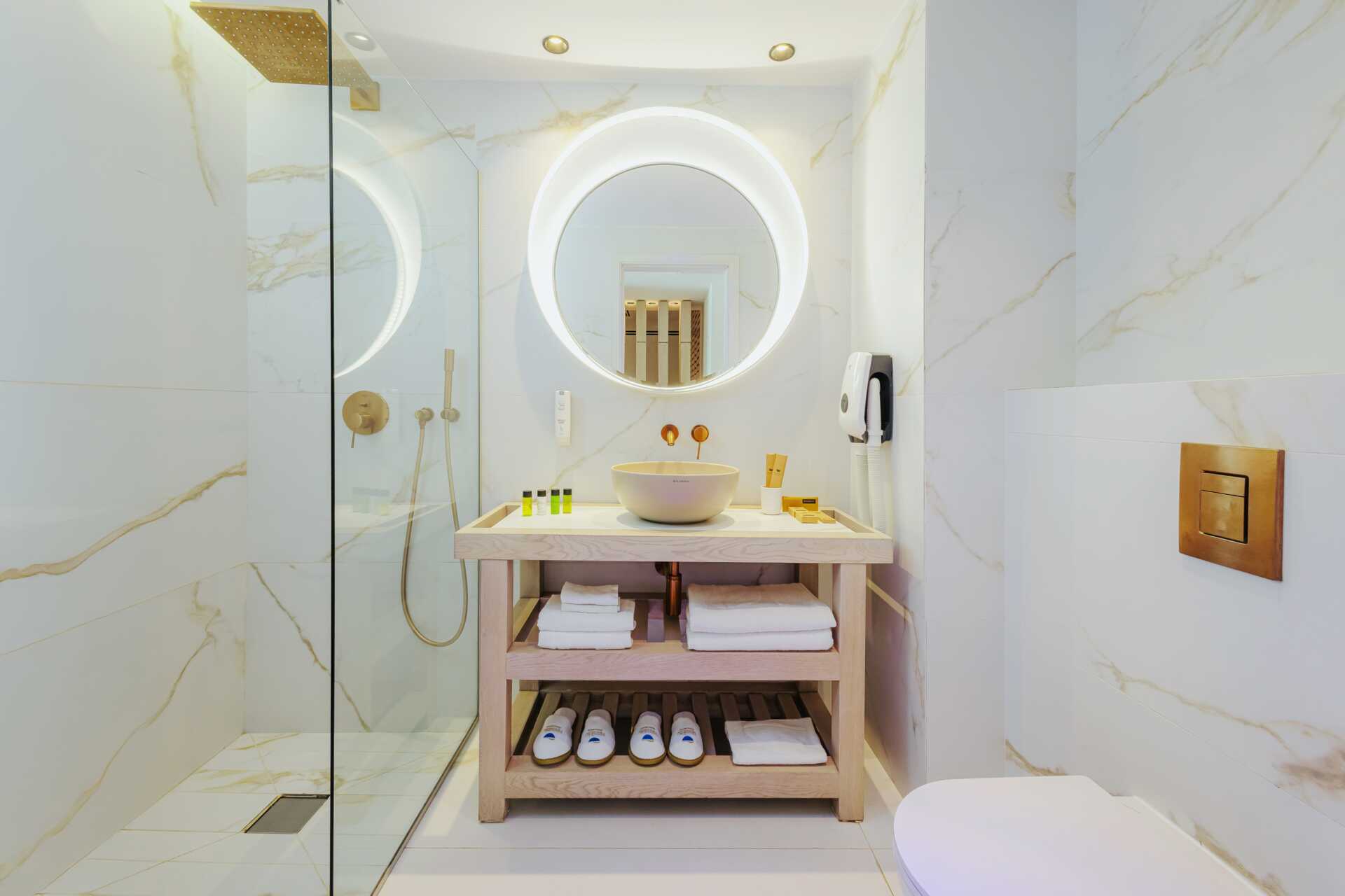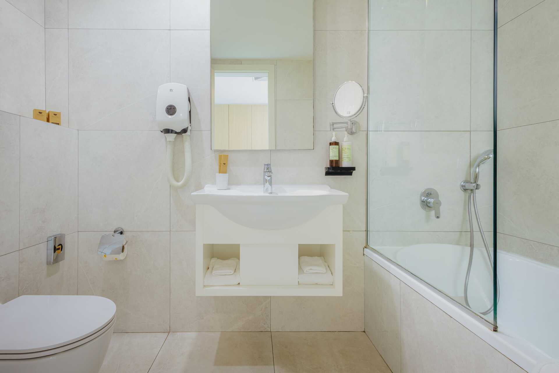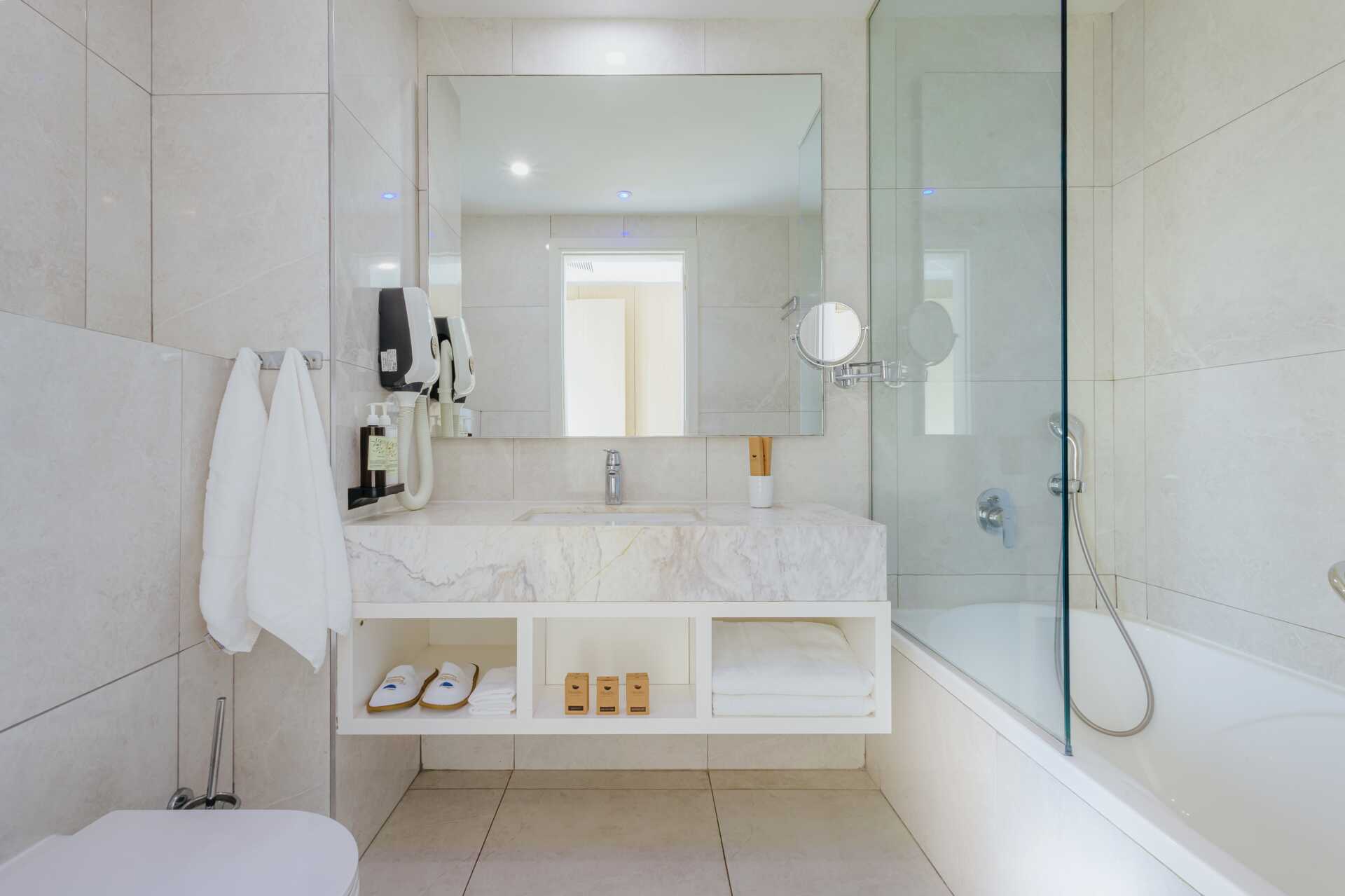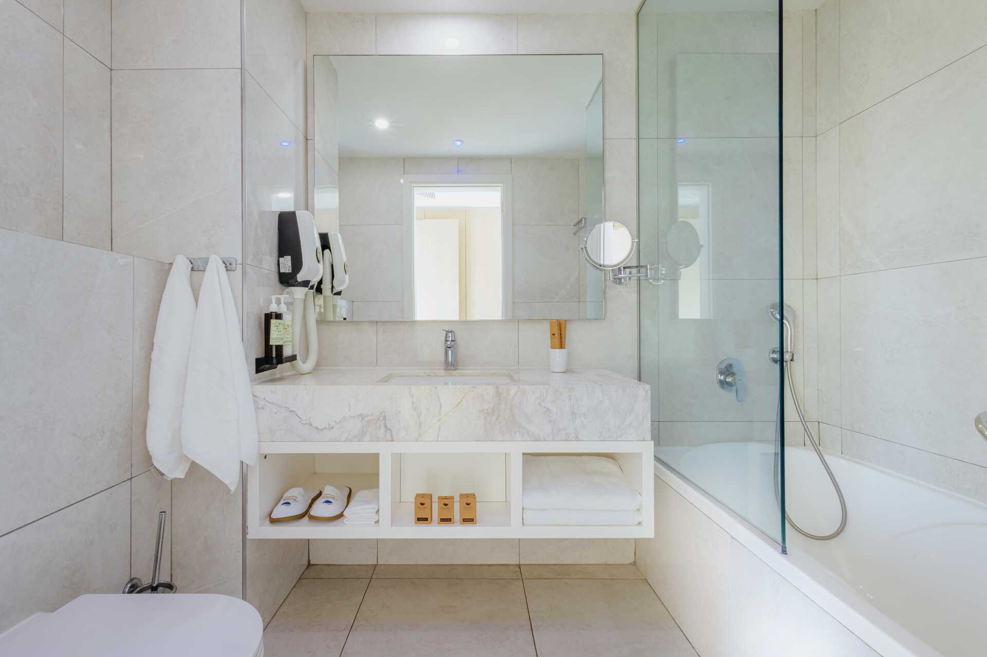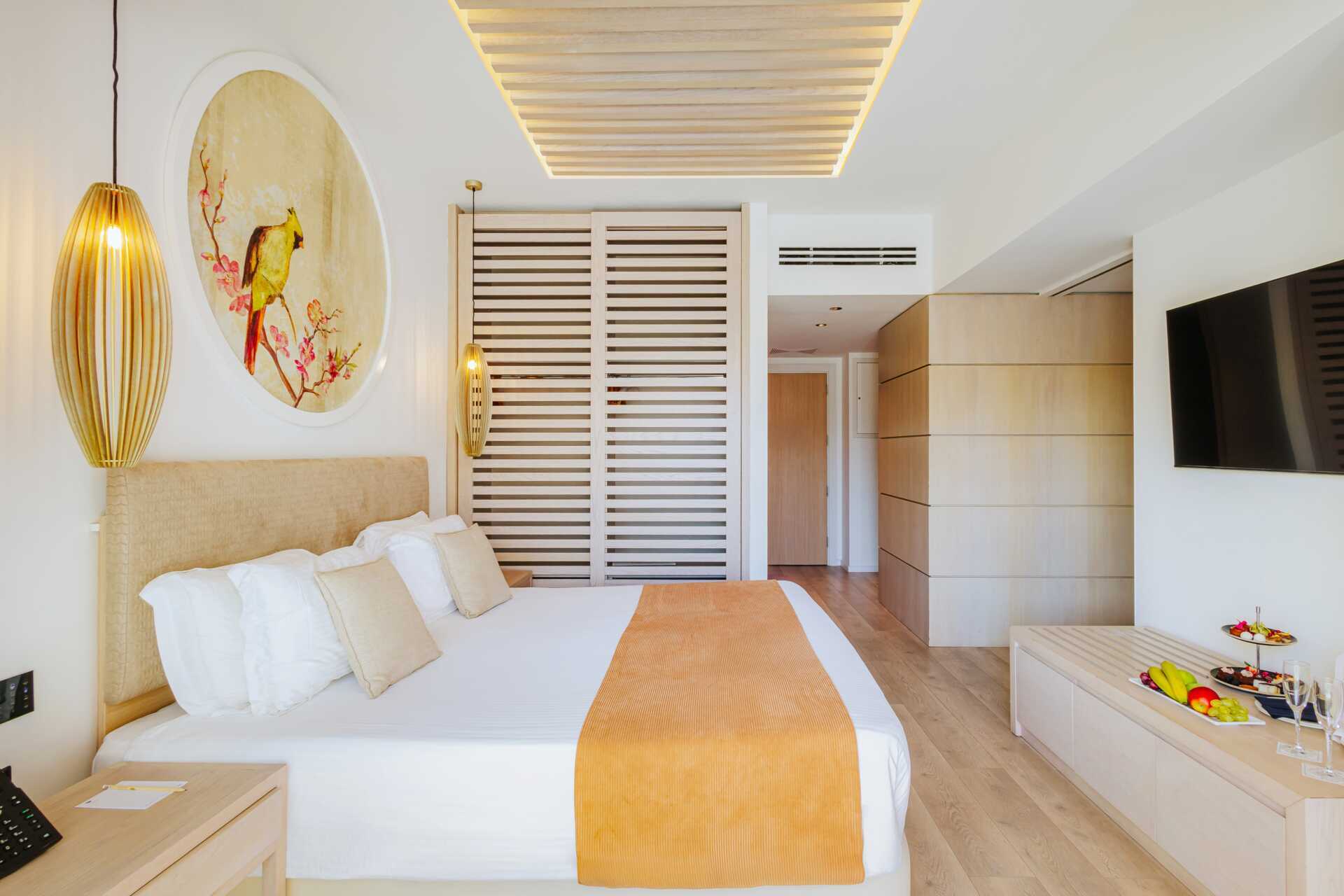 Juniorsvit med balkong och havsutsikt. En dubbelsäng. Möjlighet till extrabädd i bäddsoffa eller i hopfällbar säng. Wifi, luftkonditionering och deponering ingår. Minibar mot avgift. Vattenkokare samt kaffe och te. Kaffemaskin. Tv med internationella kanaler. Strykjärn och strykbräda. Badrockar och tofflor. Hårtork. Badrum med badkar och wc. Städning 7 ggr/vecka. Barn under två år räknas in i max antal personer i rummet.