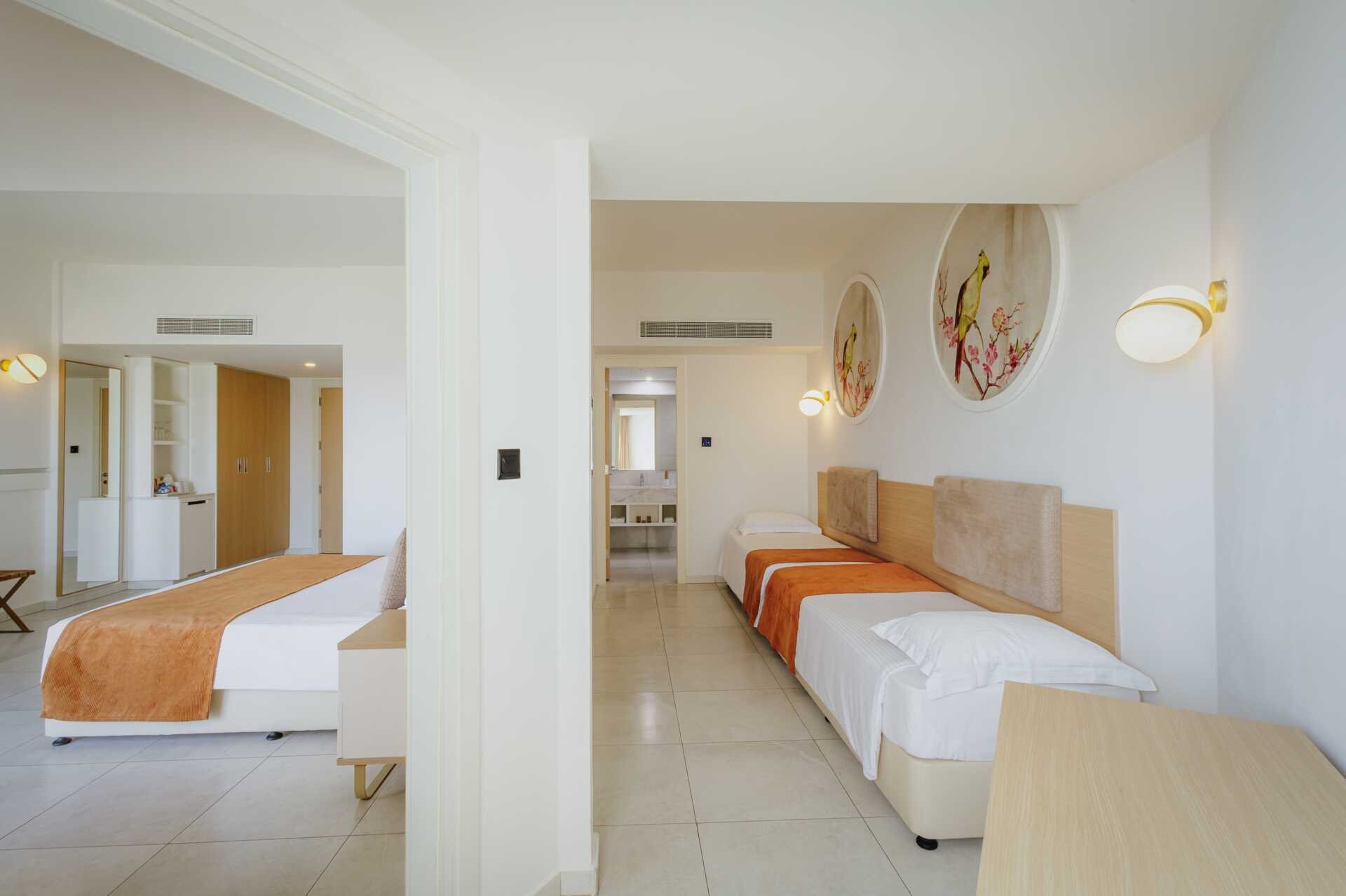 Familjerum superior med balkong och havsutsikt. Familjerummet består två sovrum, ett med en dubbelsäng och ett med två enkelsängar. Wifi, luftkonditionering och deponering ingår. Minibar mot avgift. Vattenkokare samt kaffe och te. Tv med internationella kanaler. Badrockar och tofflor. Hårtork. Badrum med badkar, separat dusch samt wc. Städning 7 ggr/vecka. Barn under två år räknas in max antal personer i rummet.