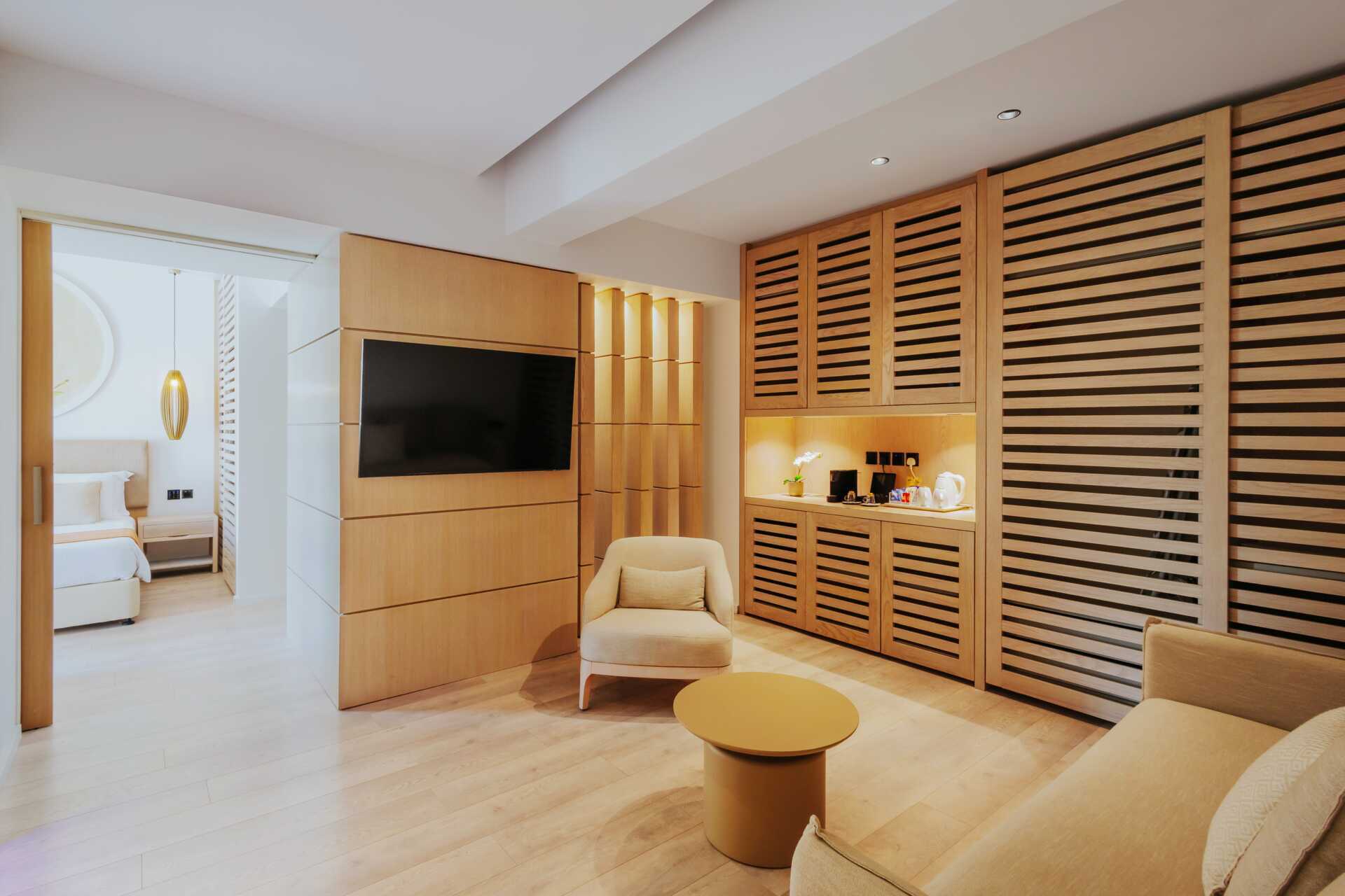 Juniorsvit Premium med balkong och begränsad havsutsikt. Juniorsviten består av ett sovrum och ett vardagsrum med skjutdörr mellan rummen. En dubbelsäng eller två enkelsängar. Möjlighet till extrabädd i bäddsoffa. Wifi, luftkonditionering och deponering ingår. Minibar mot avgift. Vattenkokare samt kaffe och te. En tv med internationella kanaler i varje rum. Badrockar och tofflor. Hårtork. Badrum med dusch och wc samt en separat wc. Städning 7 ggr/vecka. Barn under två år räknas in i max antal personer i rummet