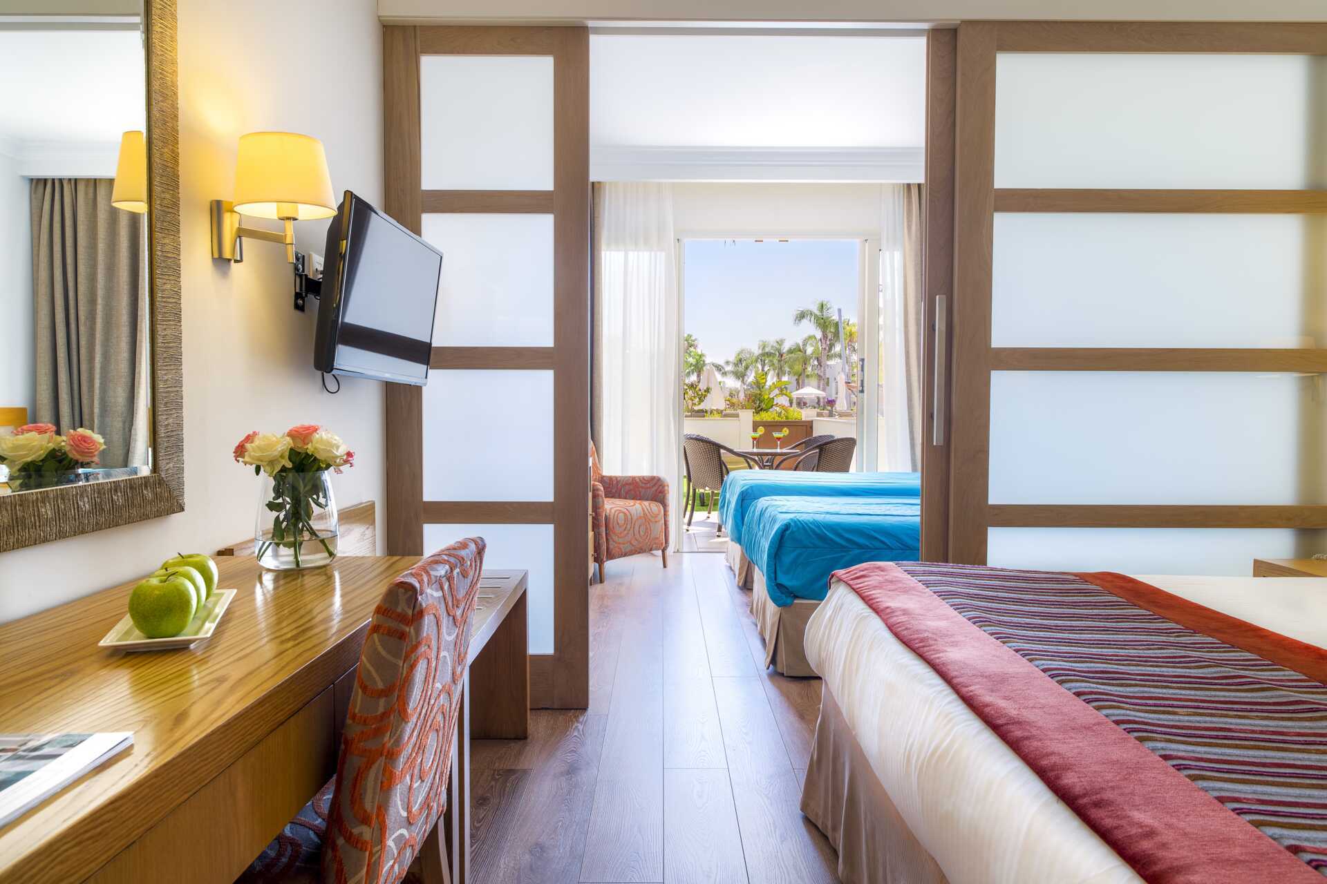 Familjesvit med balkong. Familjesviten består av två sovrum som delas av med en skjutdörr med frostat glas. En dubbelsäng. Möjlighet till extrabäddar i två enkelsängar eller i våningssäng. Wifi, luftkonditionering och deponering ingår. Kylskåp. En flaska vatten ingår, daglig påfyllning. Vattenkokare samt kaffe och te. Tv med internationella kanaler. Badrockar och tofflor. Hårtork. Badrum med badkar och wc. Städning 7 ggr/vecka. Barn under två år räknas in i max antal personer i rummet.