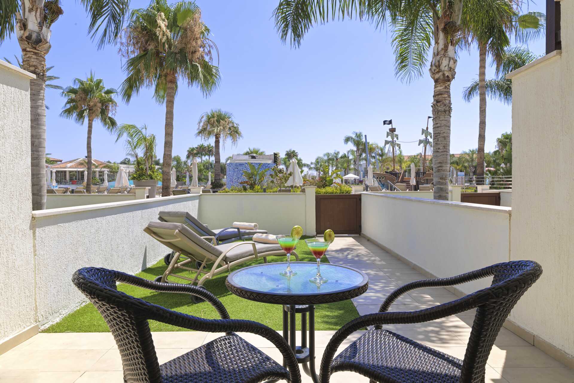 Svit med balkong och poolutsikt. En dubbelsäng. Wifi, luftkonditionering och deponering ingår. Kylskåp. En vattenflaska ingår, daglig påfyllning. Vattenkokare samt kaffe och te. Tv med internationella kanaler. Badrockar och tofflor. Hårtork. Badrum med jacuzzi, dusch och wc. Städning 7 ggr/vecka.