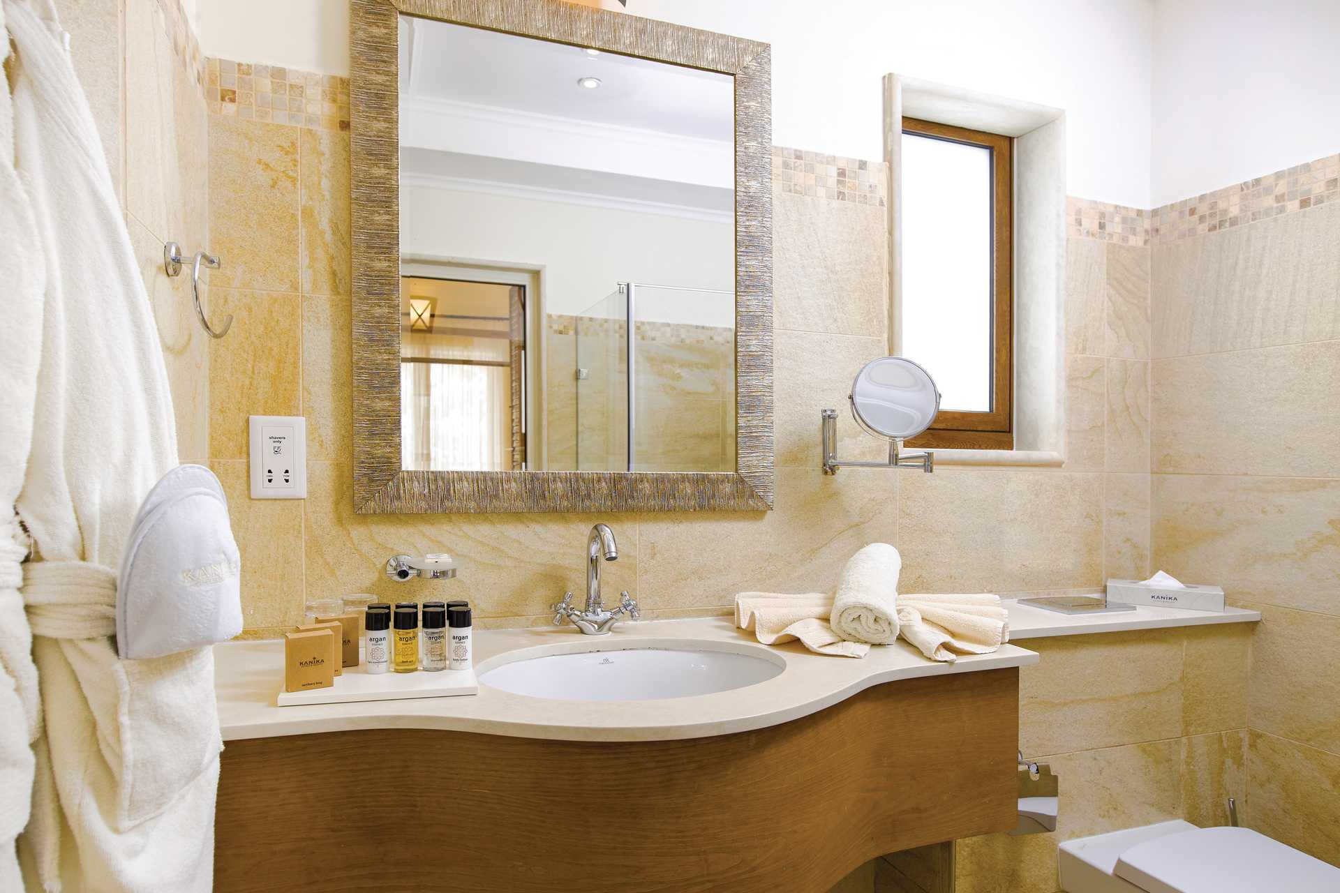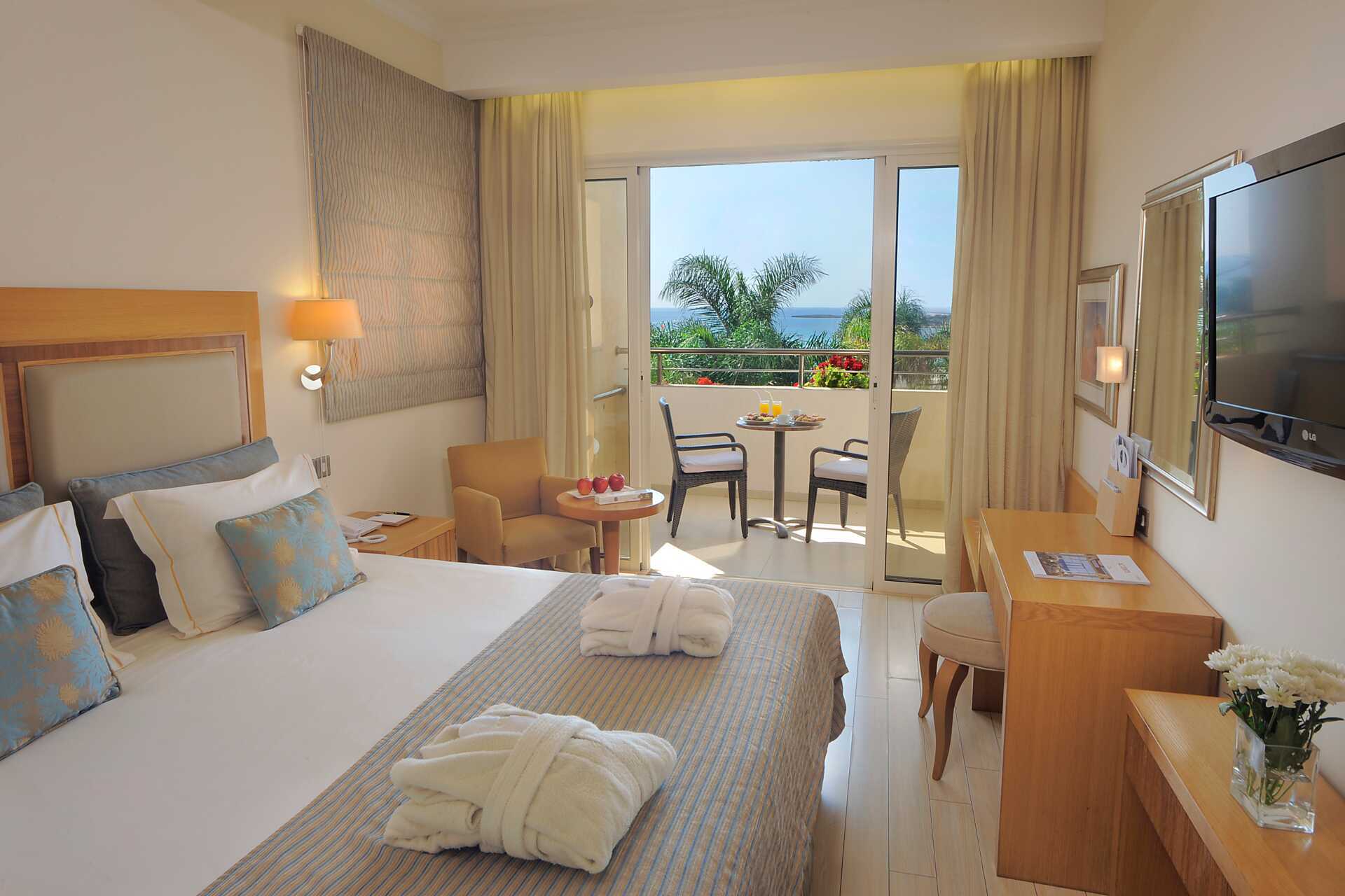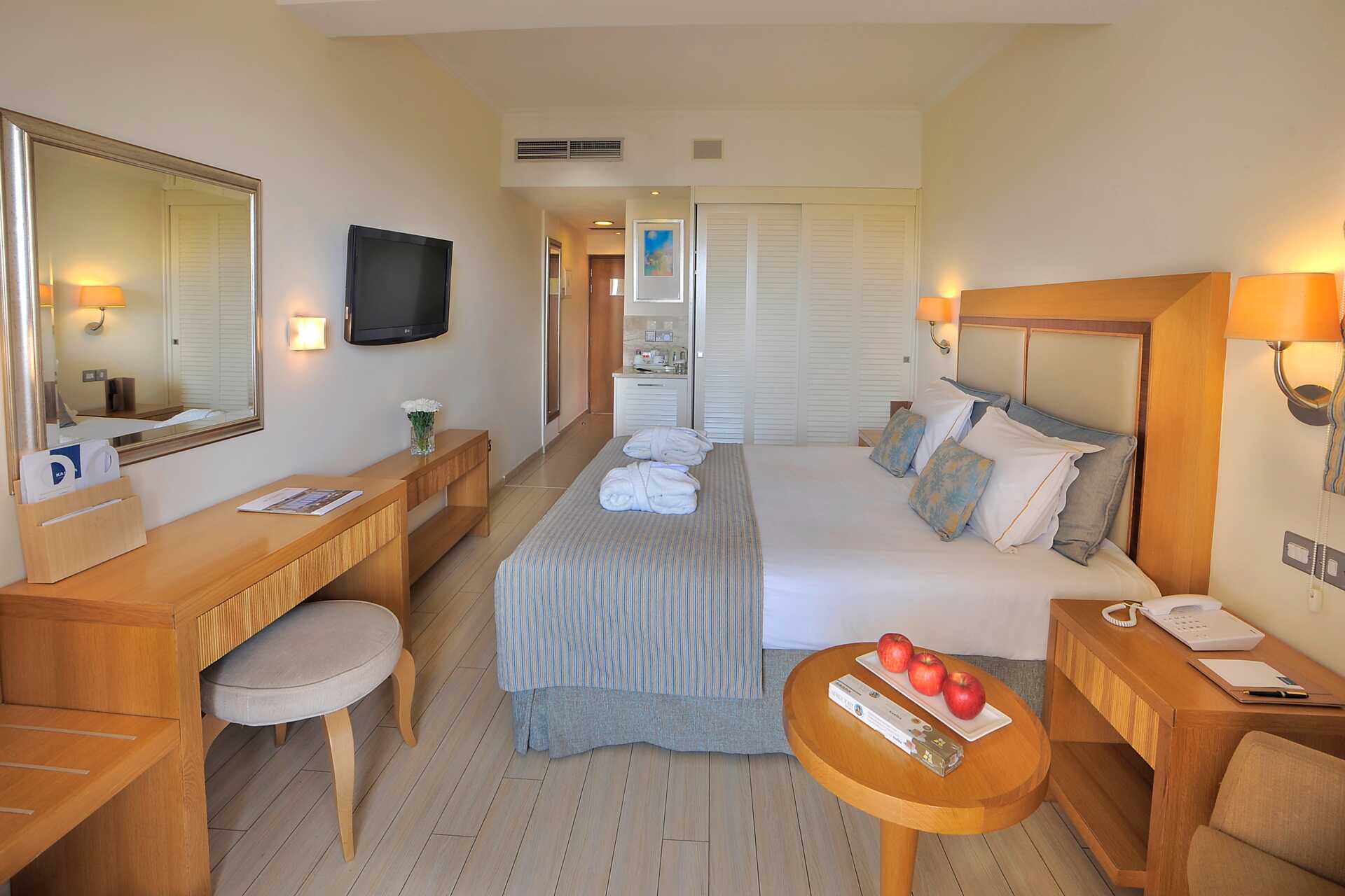 Superiorsvit med balkong och havsutsikt. En dubbelsäng eller två enkelsängar. Wifi, luftkonditionering och deponering ingår. Kylskåp. En flaska vatten ingår - fylls på dagligen. Vattenkokare samt kaffe och te. Tv med internationella kanaler. Badrockar och tofflor. Hårtork. Badrum med badkar och wc. Städning 7 ggr/vecka.