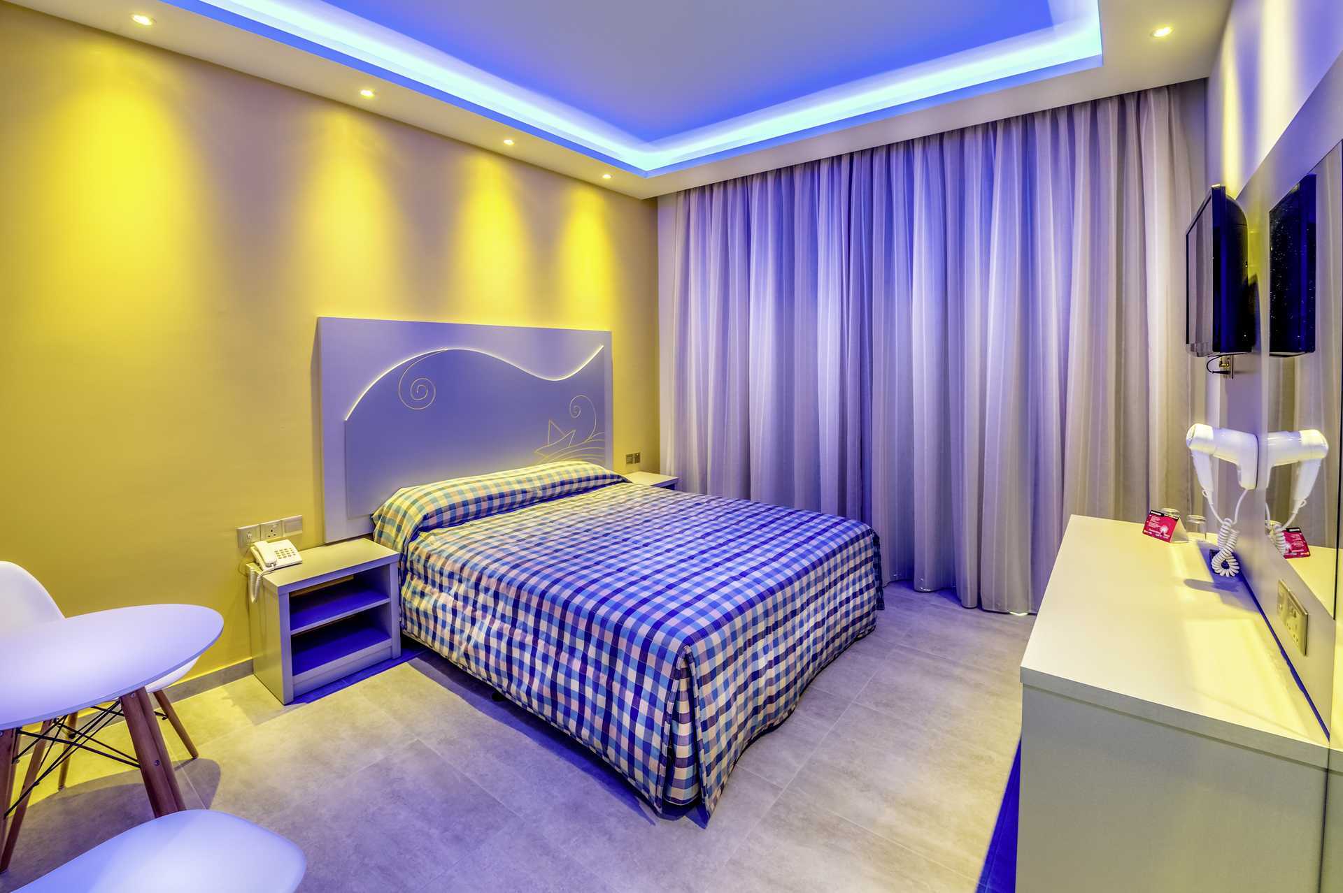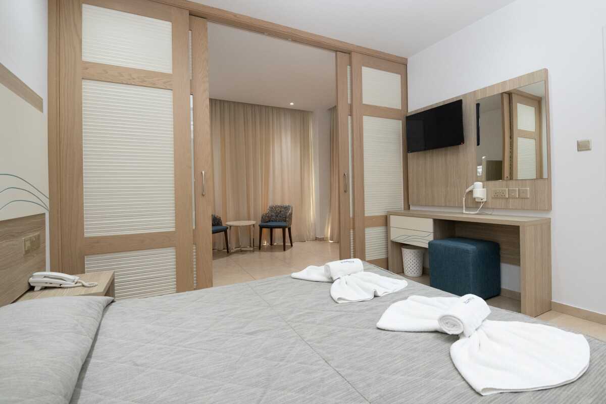 Familjesvit med balkong och havsutsikt. Sviten består av en sovrumsdel och en vardagsrumdel som kan delas av med en frostad skjutdörr. En dubbelsäng eller två enkelsängar. Möjlighet till extrabäddar i våningssäng. Luftkonditionering och wifi ingår. Deponering mot avgift. Kylskåp. Vattenkokare samt kaffe och te. Tv med internationella kanaler. Hårtork. Badrum med badkar eller dusch samt wc. Städning 7 ggr/vecka.