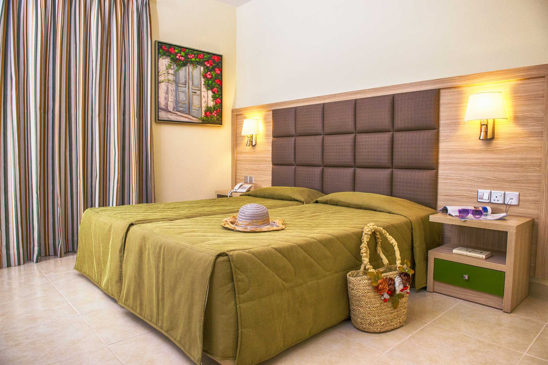 Superiorrum med balkong, vissa med havsutsikt eller med begränsad havsutsikt. En dubbelsäng eller två enkelsängar. Möjlighet till extrabädd i bäddbar fåtölj eller i hopvikbar säng. Wifi och luftkonditionering ingår. Deponering mot avgift. Kylskåp. Vattenkokare samt kaffe och te. Tv med internationella kanaler. Hårtork. Badrum med badkar eller dusch samt wc. Städning 7 ggr/vecka.
