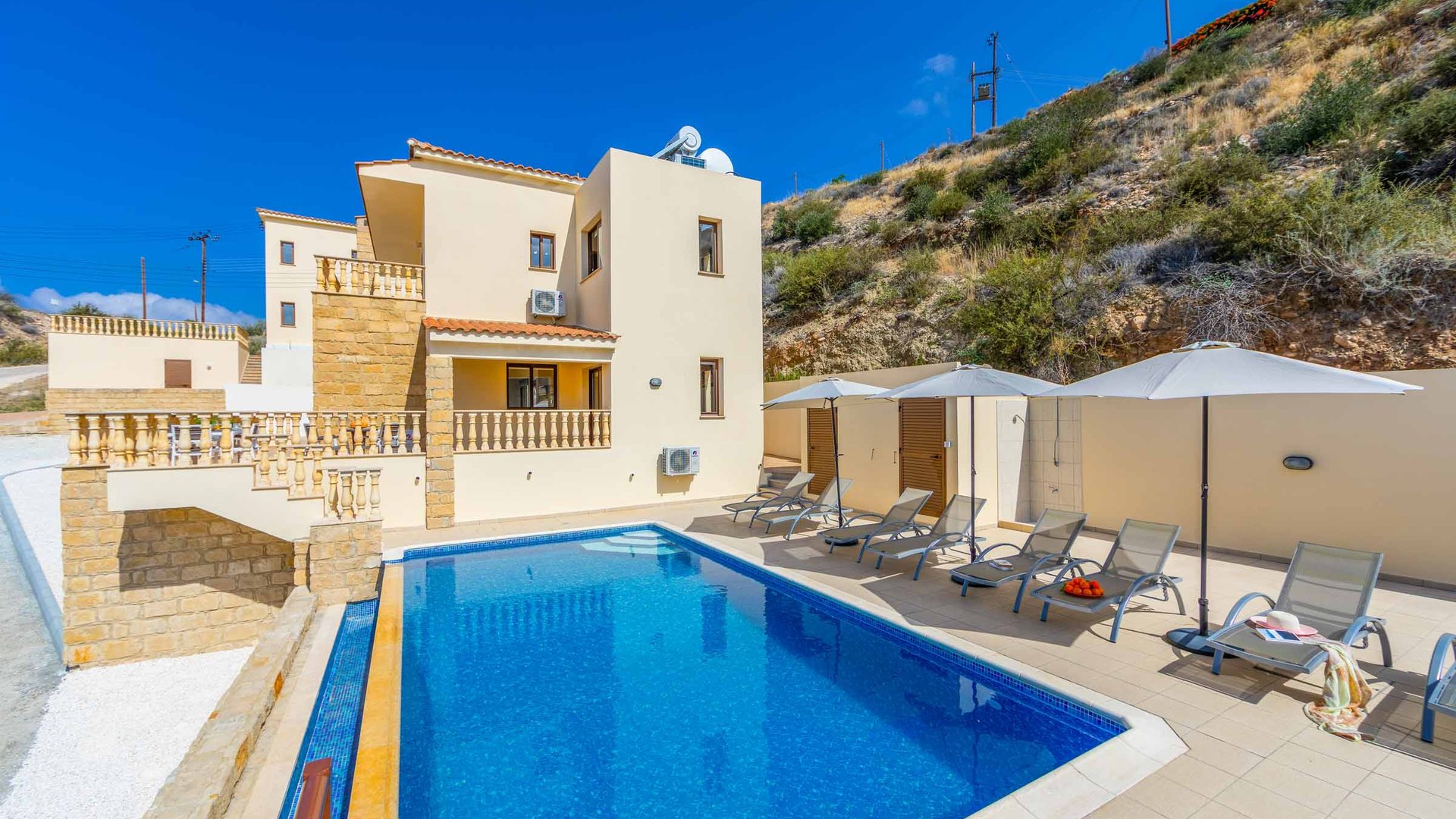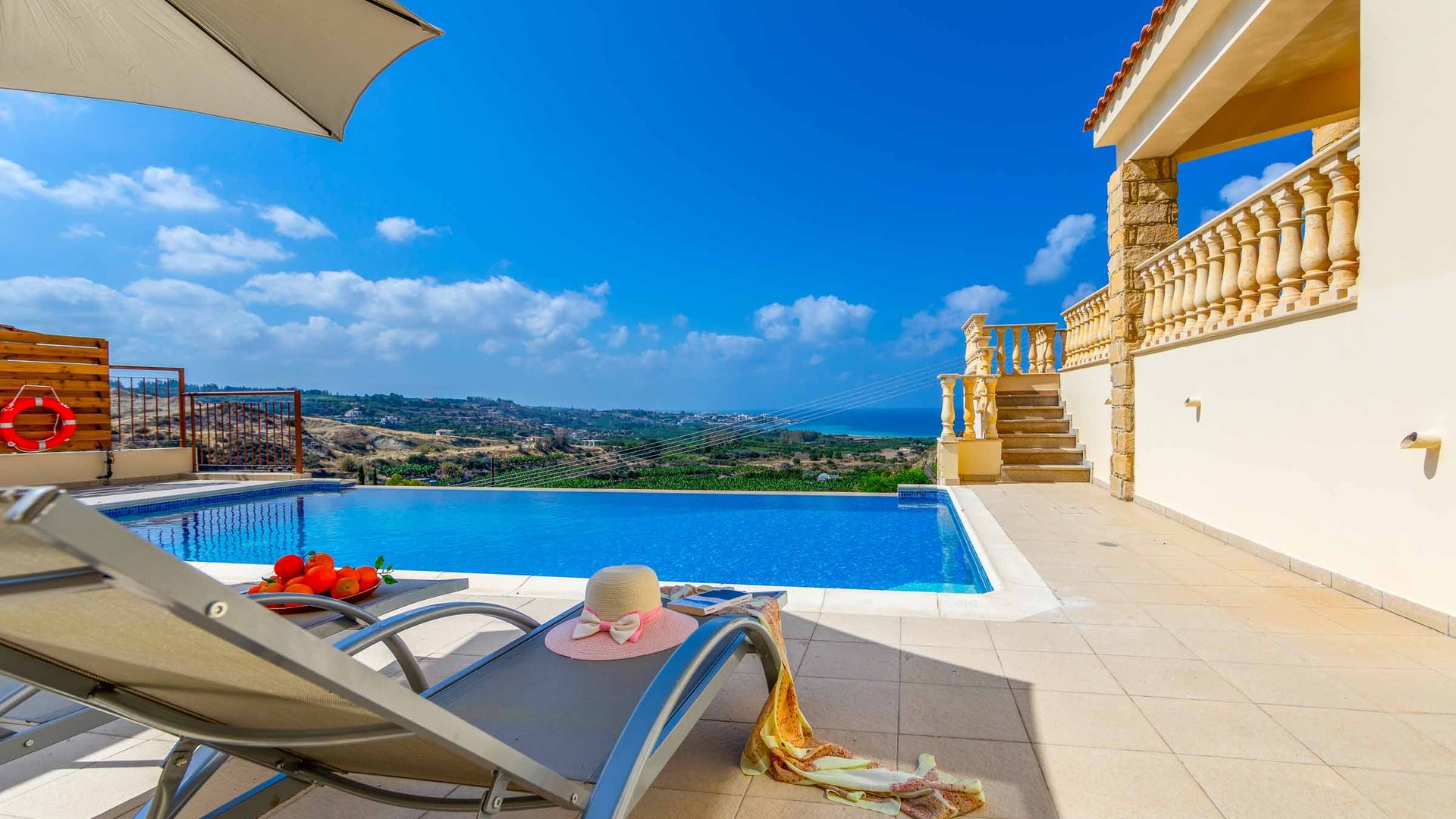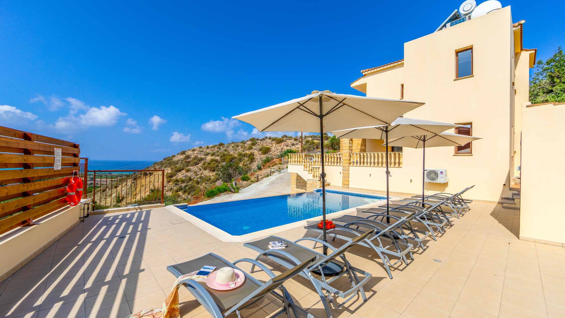 Med utsikt över en av Cyperns mest populära och väletablerade semesterorter ligger den fantastiska Aqua Royal, en fristående villa med fyra sovrum, en superb infinitypool och trendig inredning. Villan är mycket välutrustad för att garantera att din semesterupplevelse blir problemfri, med Wi-Fi, luftkonditionering och satellit-TV inkluderat. Det är dock utomhus som du garanterat kommer att bli förälskad i denna attraktiva fastighet tack vare dess tilltalande terrass och mängden solstolar - tillräckligt för att alla ska kunna dra nytta av Cyperns soliga klimat. Villan har fått ett passande namn, eftersom den erbjuder sensationell utsikt ner mot det turkosa vattnet utanför öns västkust. Närliggande Coral Bay har fortfarande behållit mycket av sin naturliga skönhet trots sitt stora utbud av butiker, barer och restauranger, samt kanske den bästa stranden på Cypern som är 600 meter lång.
