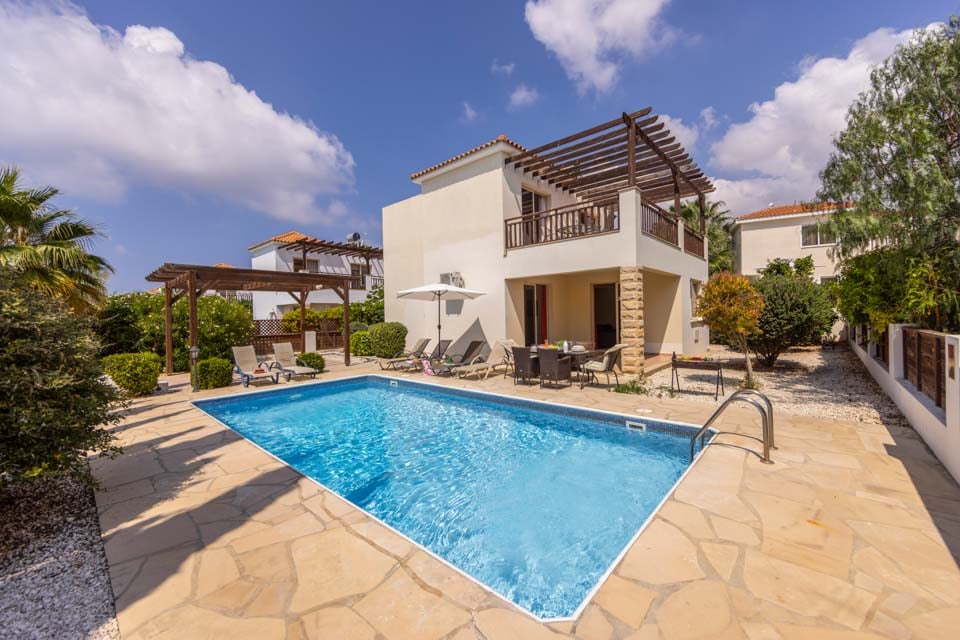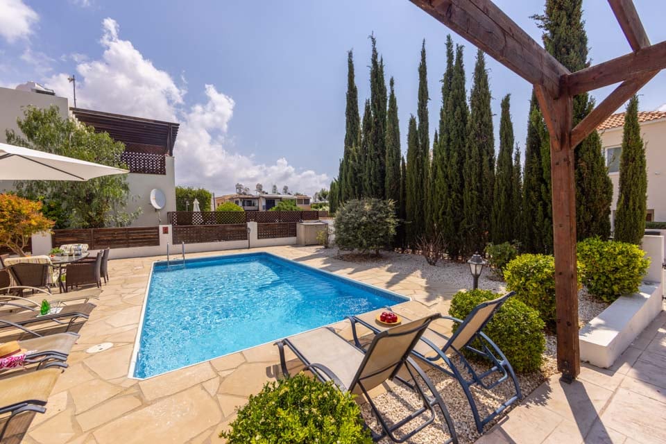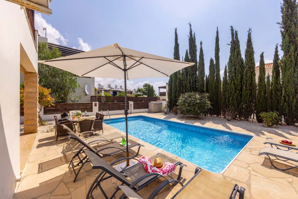 Alternativt kan dagarna bäst tillbringas vid poolen i villan. Den 8x4 meter stora poolen har en vacker blå färg och ger den där välbehövliga svalkan en sommardag. Det finns en träpergola och en täckt terrass för en plats för att äta utomhus, samt en portabel grill för de spirande kockarna där ute. Cypern är känt för sin utsökta mat och erbjuder en mängd traditionella rätter. Varför inte grilla några marinerade souvlakispett eller halloumiburgare på grillen för dina vänner och familj?