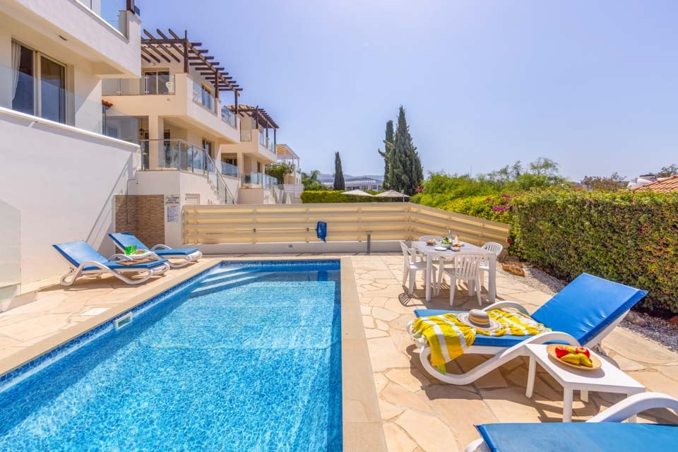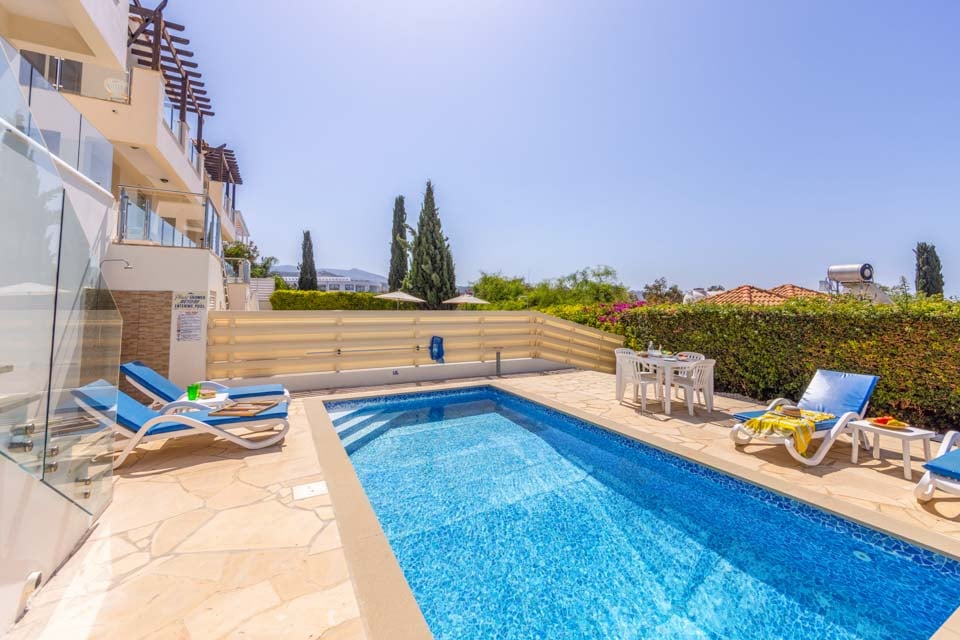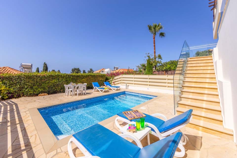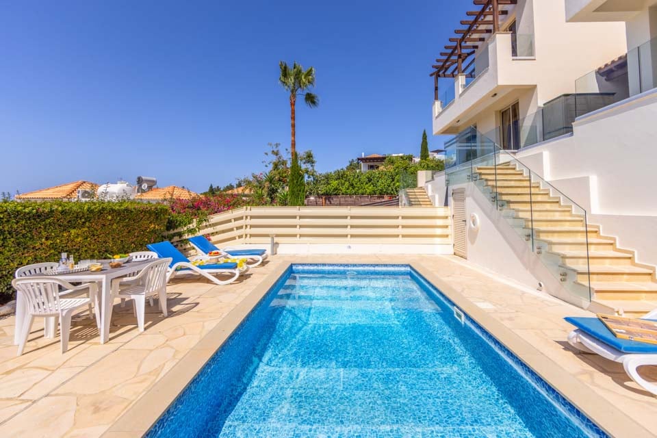 Villasemester här blir extra speciell tack vare det utmärkta läget, beläget i hjärtat av den livliga semesterorten Coral Bay. Bara en kort promenad bort finns rader av restauranger i världsklass och livliga barer, perfekta för att prova läckra lokala rätter eller smutta på lokala viner och öl. Om du älskar stranden finns det en orörd Blå Flagg-strand precis utanför dörren, full av solstolar och vattensporter. Efter en actionfylld dag med utforskande kan vi inte tänka oss en bättre plats att varva ner på än den solkyssta terrassen med palmer. Det finns inget bättre sätt att koppla av än att luta sig tillbaka på en solstol eller ett dopp i den glittrande poolen för att svalka sig från värmen. Gå till balkongen på första våningen för ett panoramafrö över morgonkaffet och den vidsträckta utsikten över havet. Om middag utomhus låter som en dröm, äta i matsalen utomhus och elda upp grillen.