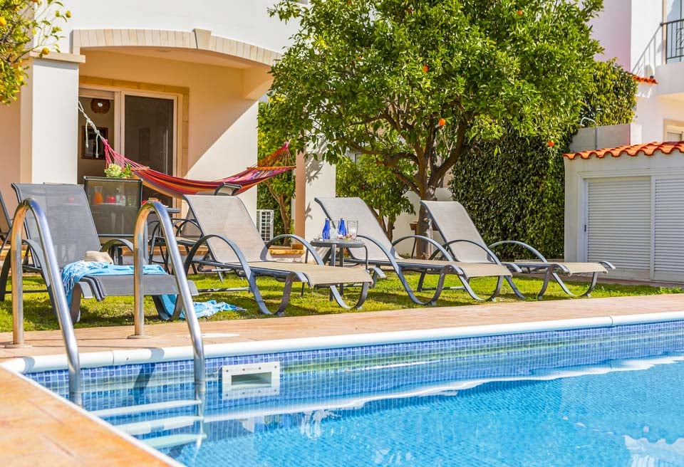 Utomhus flankerar citron- och apelsinträd den stora solterrassen med utsikt över den inbjudande privata poolen. Precis bredvid solterrassen finns en härlig täckt matplats som är den perfekta platsen att njuta av en lunch i middagsvärmen eller de långa kvällsmåltiderna under stjärnorna.