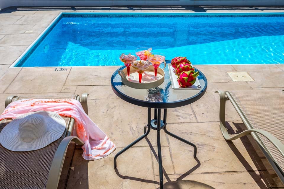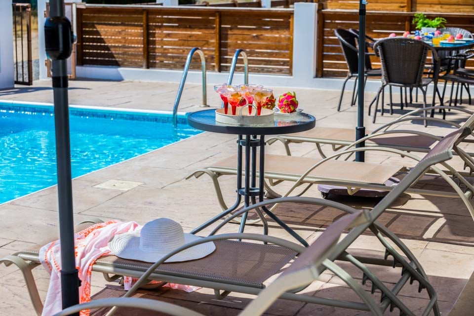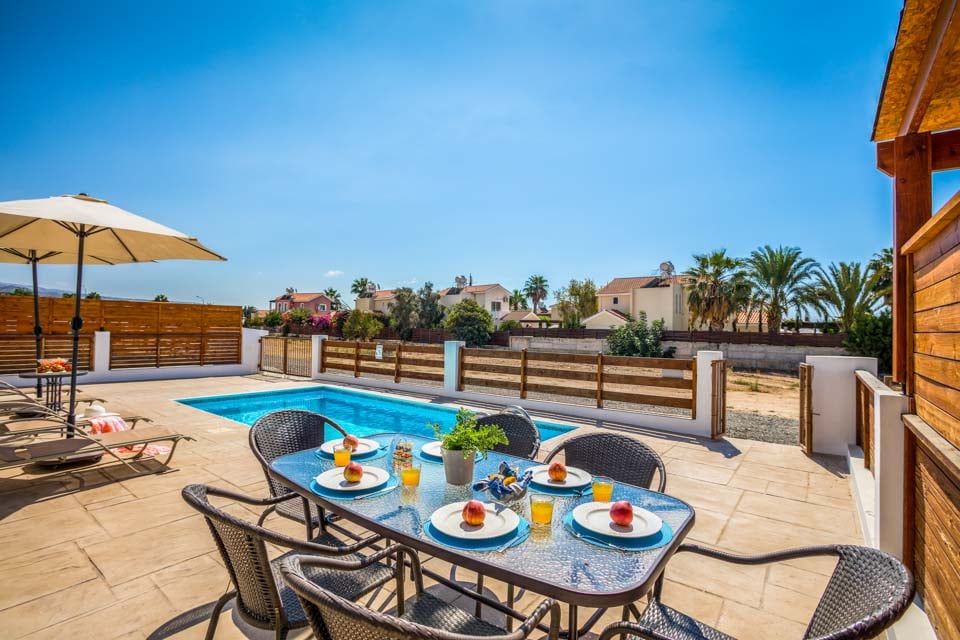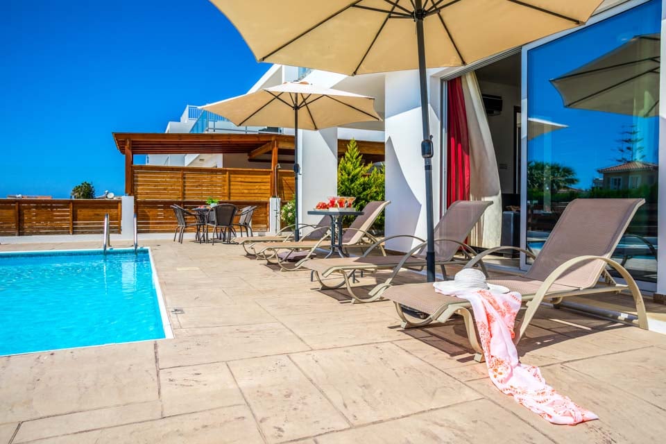 Den moderna interiören erbjuder ett öppet vardagsrum med altandörrar som leder ut mot den soliga poolterrassen, en utmärkt plats för måltider utomhus. Eller att bara sitta och koppla av på kvällen efter att ha ätit på en av de många restaurangerna på orten. Terrassdörrar leder från de två sovrummen på första våningen till en stor balkong.