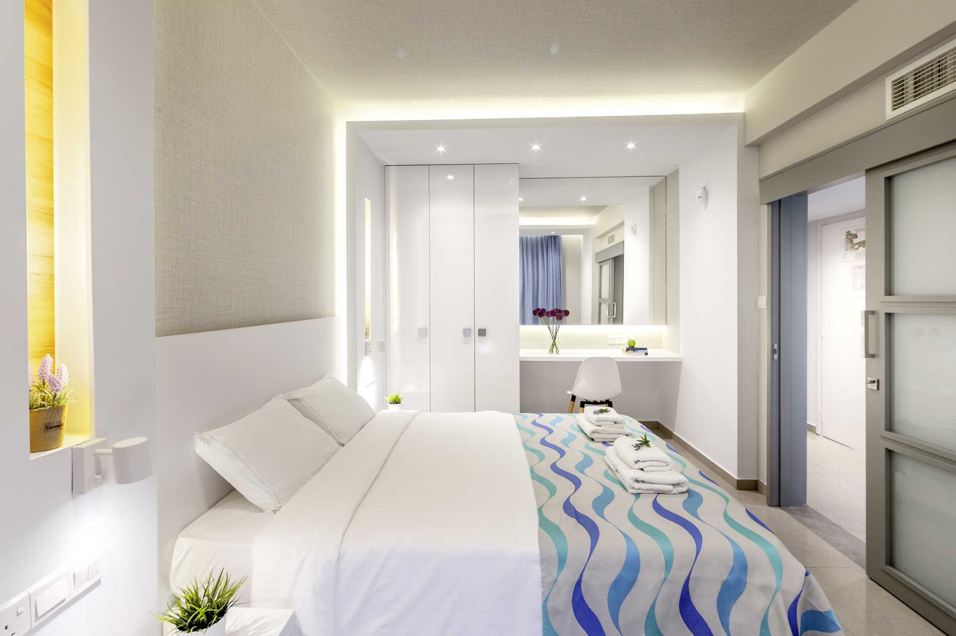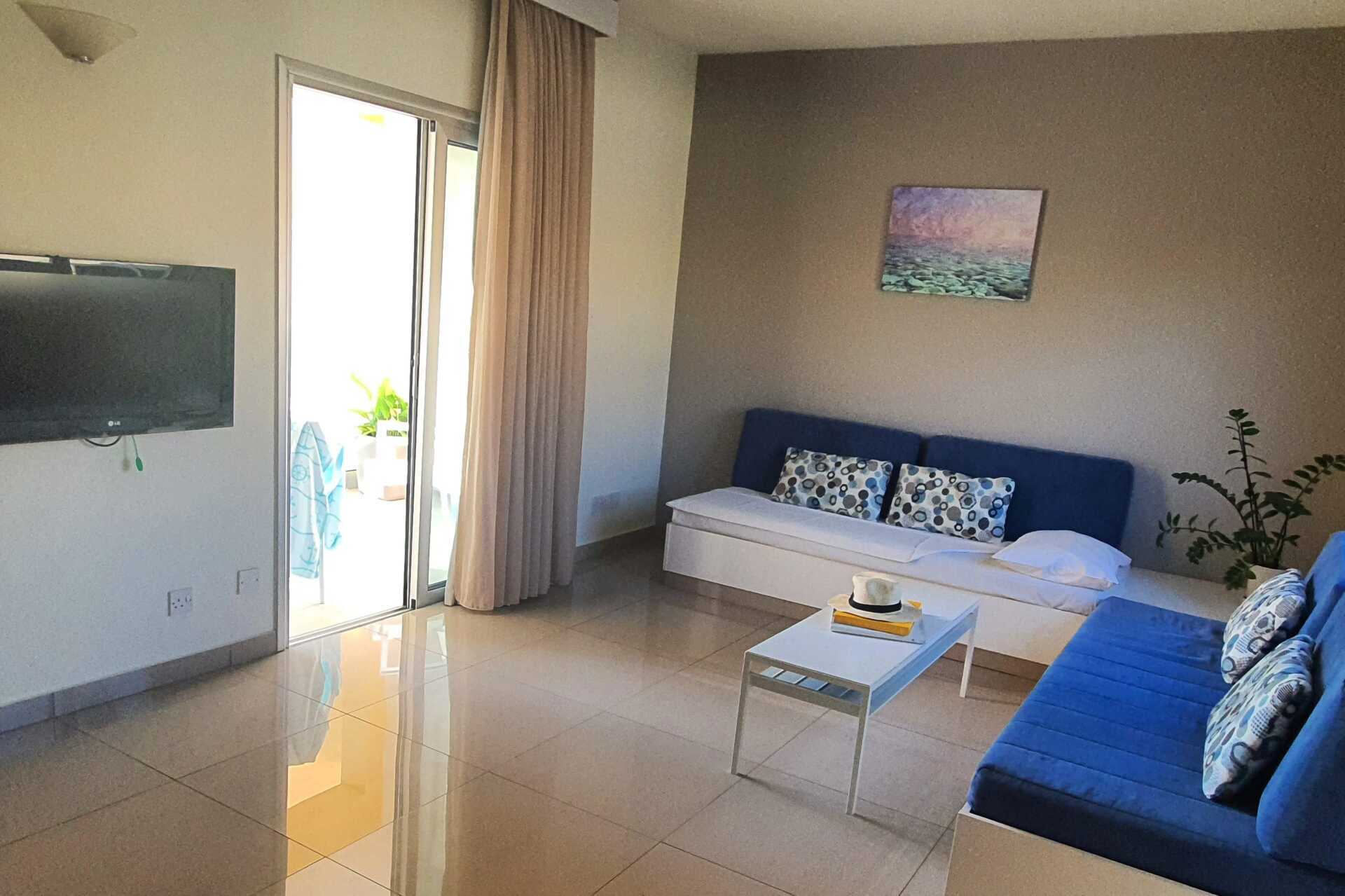 Trerumslägenhet med balkong eller terrass. Två sovrum och ett kombinerat vardagsrum med minikök. Ett sovrum med en dubbelsäng och ett sovrum med två enkelsängar. Möjlighet till extrabädd i bäddbar soffa. Minikök med kokplattor, kylskåp, mikrovågsugn, vattenkokare samt enkel köksutrustning. Wifi, luftkonditionering och deponering ingår. Tv med internationella kanaler. Hårtork. Två badrum med badkar eller dusch samt wc. Städning 6 ggr/vecka.