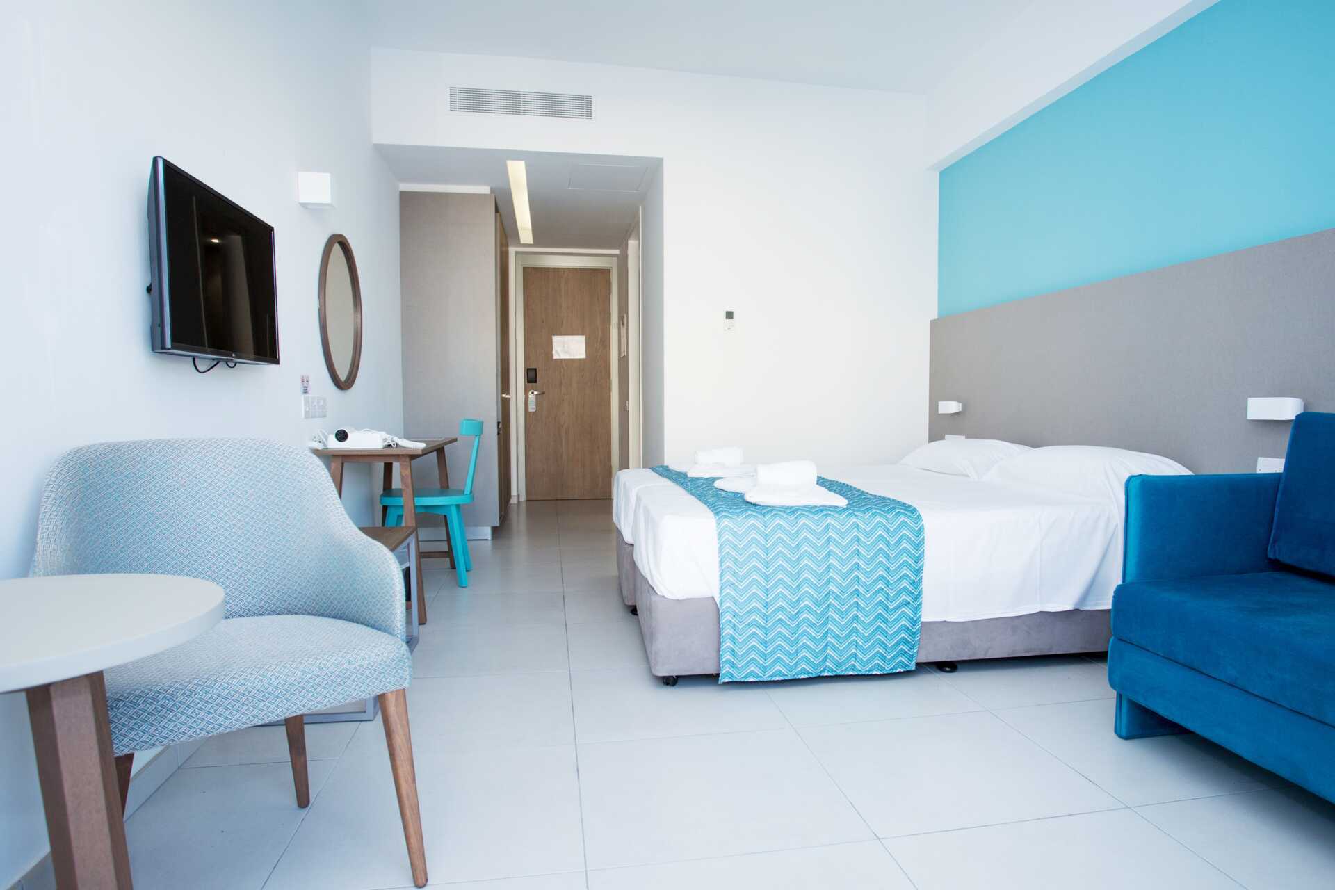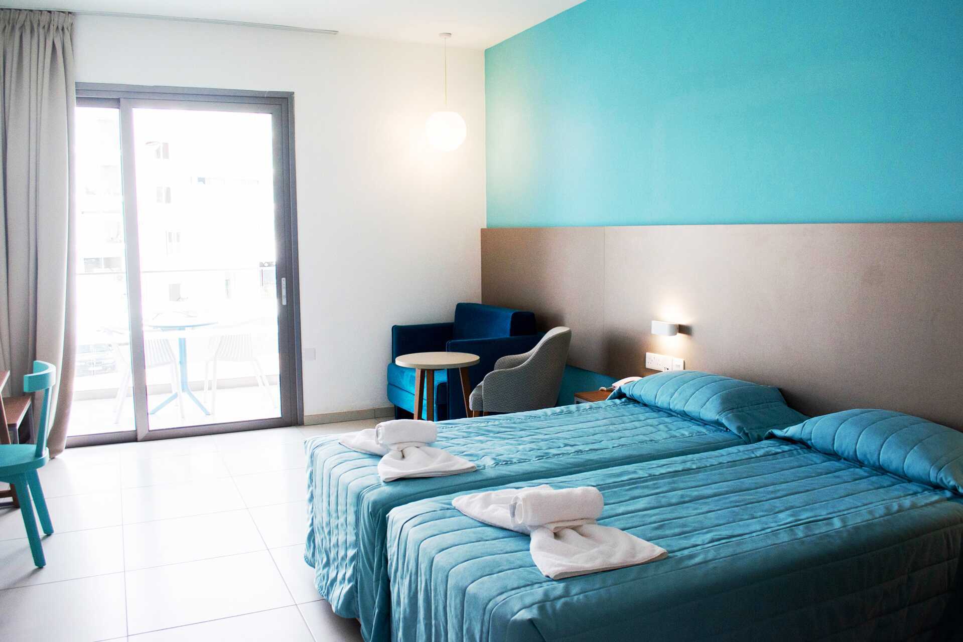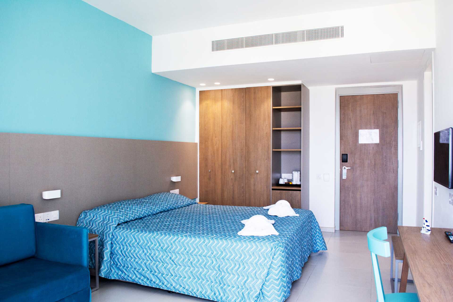Dubbelrum med balkong, vissa med begränsad havsutsikt eller med havsutsikt. En dubbelsäng eller två enkelsängar. Möjlighet till extrabädd i bäddsoffa. Wifi och luftkonditionering och ingår. Deponering mot avgift. Litet kylskåp. Vattenkokare samt kaffe och te. Tv med internationella kanaler. Badrum med dusch och wc. Städning 7 ggr/vecka.